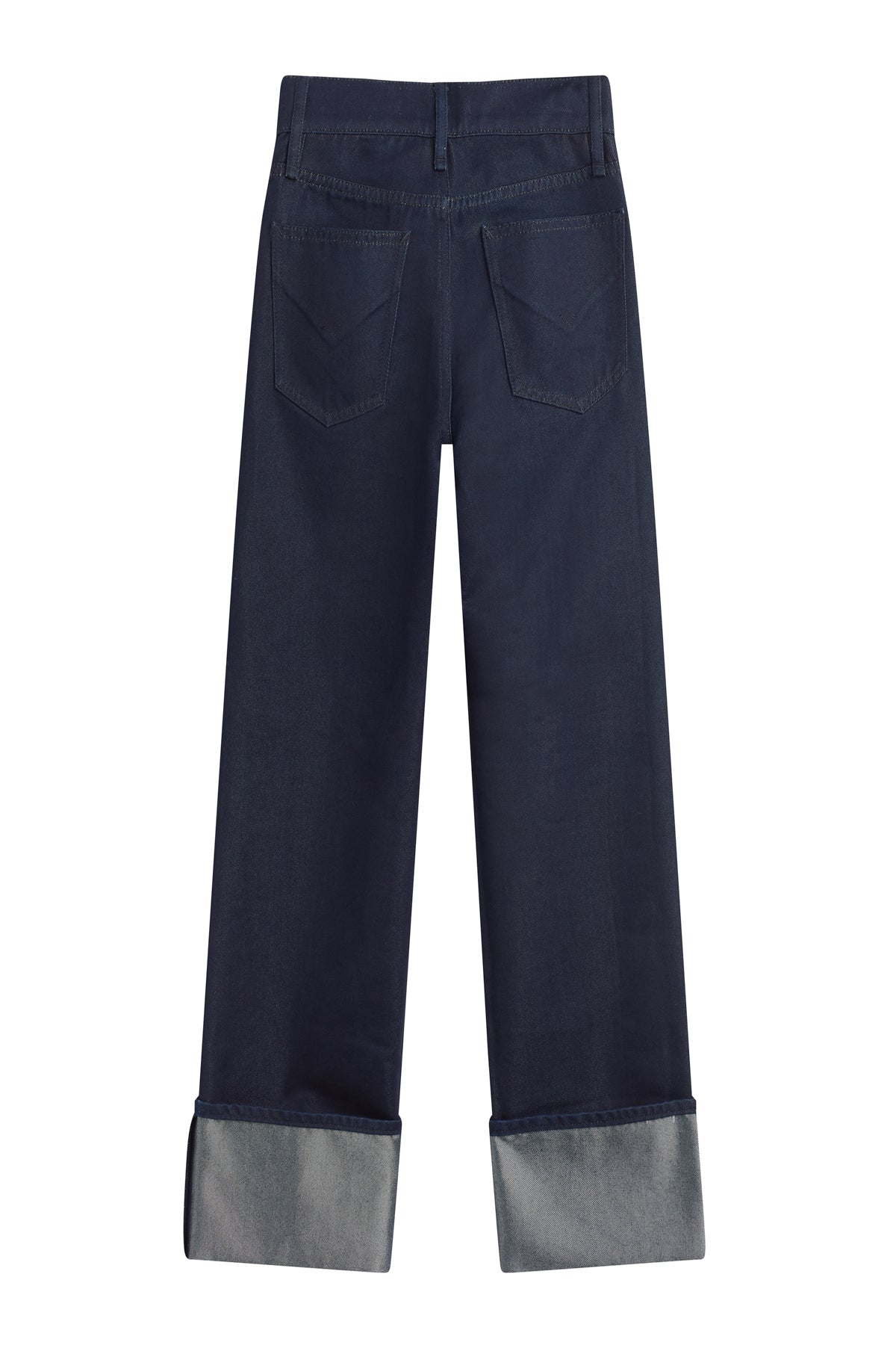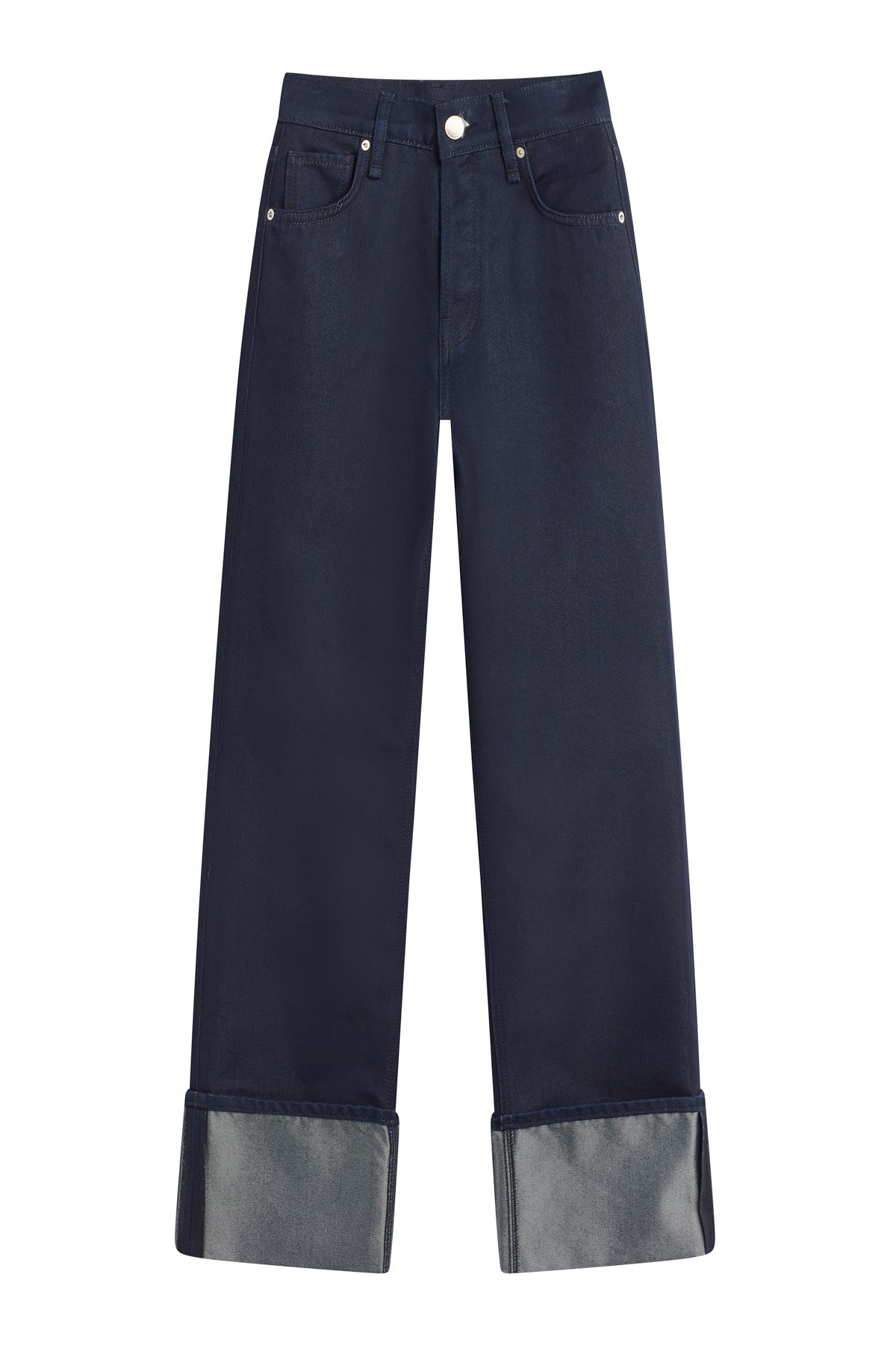 Our Rosie High-Rise Wide Leg Jean with Cuff in Indigo Metallic has a classic fit with an elevated waistline and a roomy leg. This pair is crafted in rigid indigo denim. The reverse side of the denim has a metallic finish, which is visible when the jean is cuffed. This pair is finished with classic five-pocket styling and a covered button fly. -