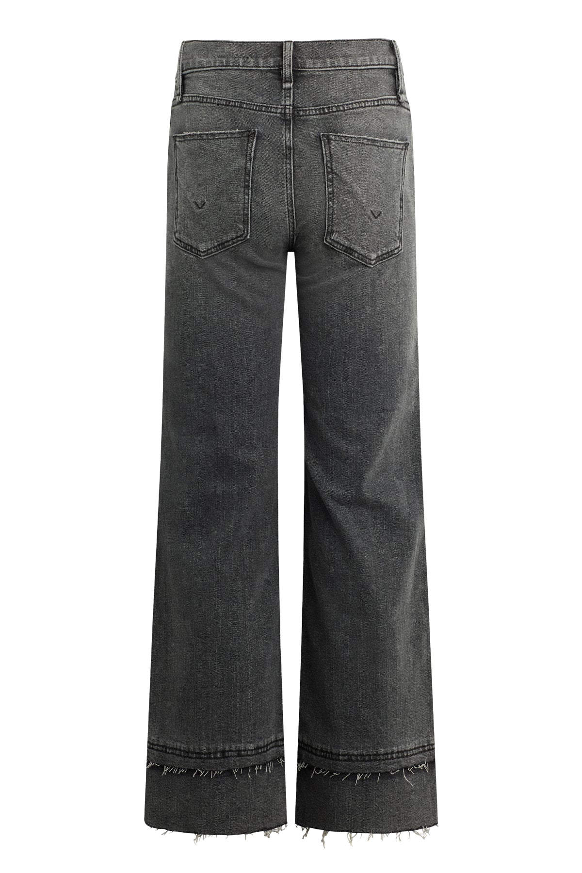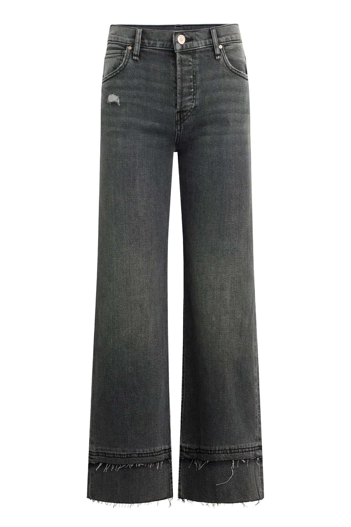 Our Rosie High-Rise Wide Leg Ankle Jean in Asphalt is cut with an elevated waistline and a roomy leg. This pair features an ankle-length 28" inseam with a double-raw-hem detail, classic five-pocket styling and a covered button fly. These jeans are made of comfort stretch denim in a washed black wash. -