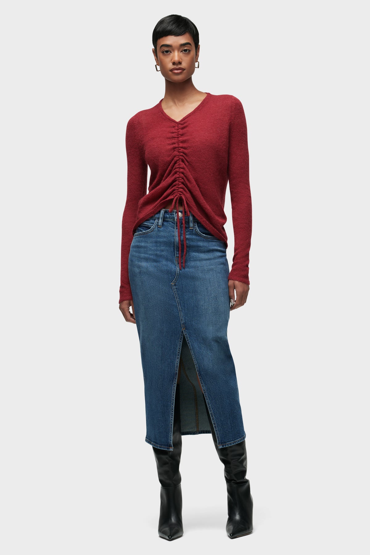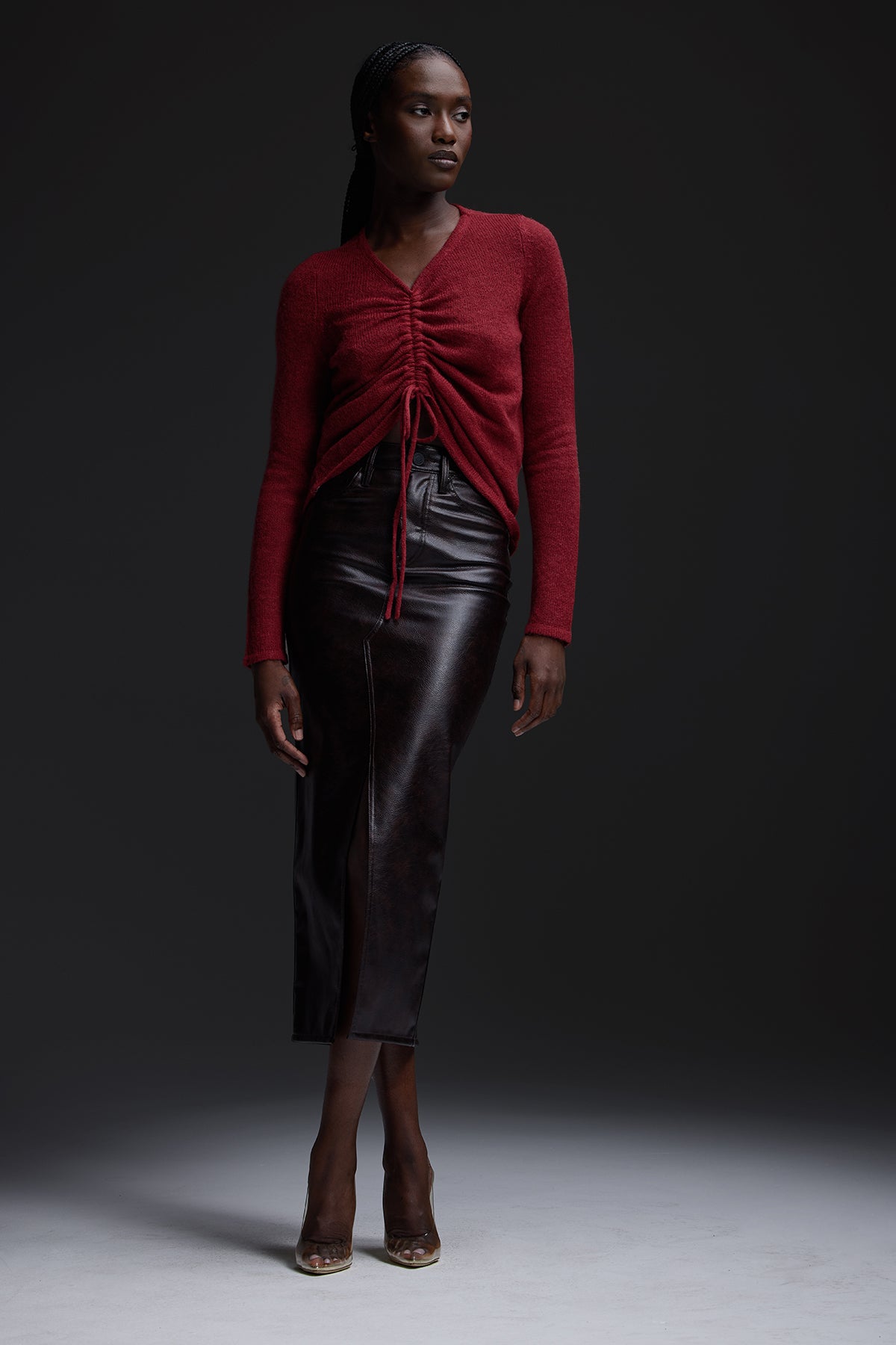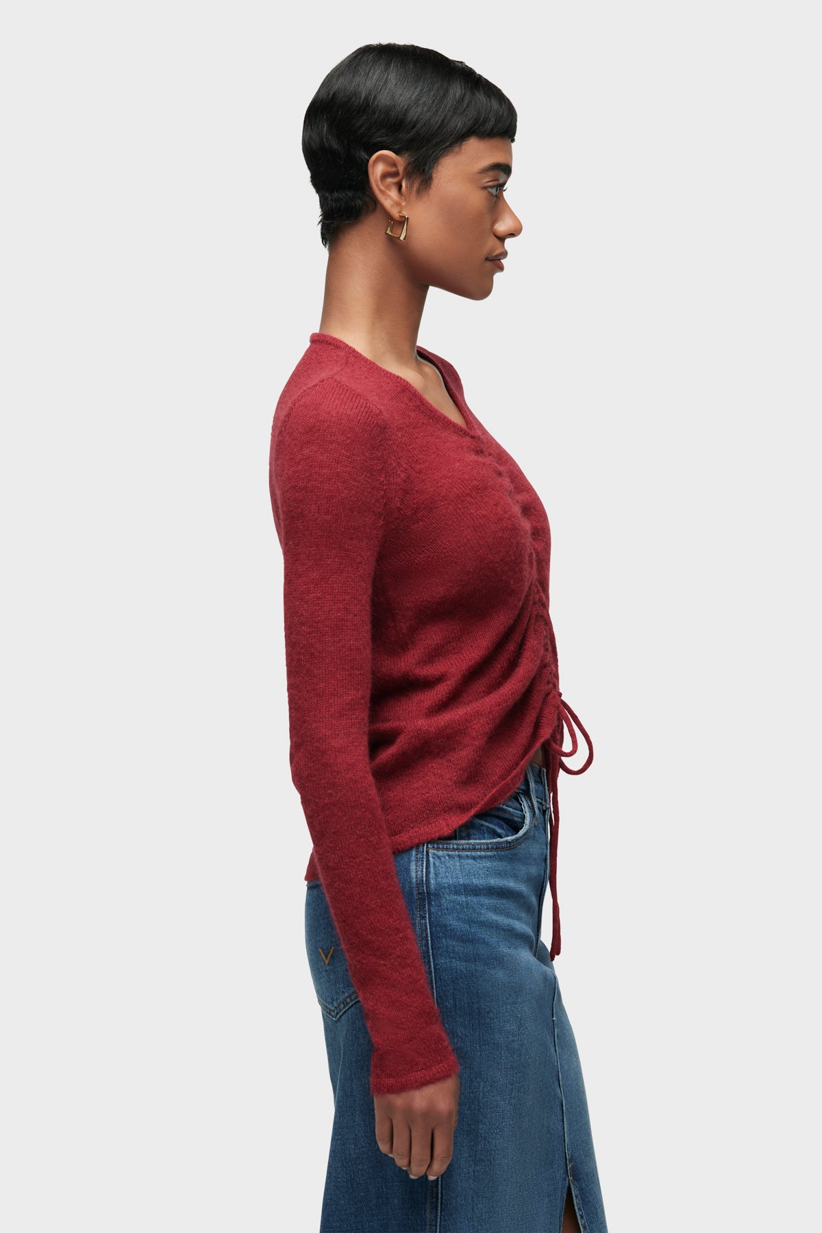 Knitted from a soft and fuzzy yarn for added texture, the Ruched Long Sleeve Sweater features long sleeves and a slim fit. Adjustable ties and ruching completes the look. -
