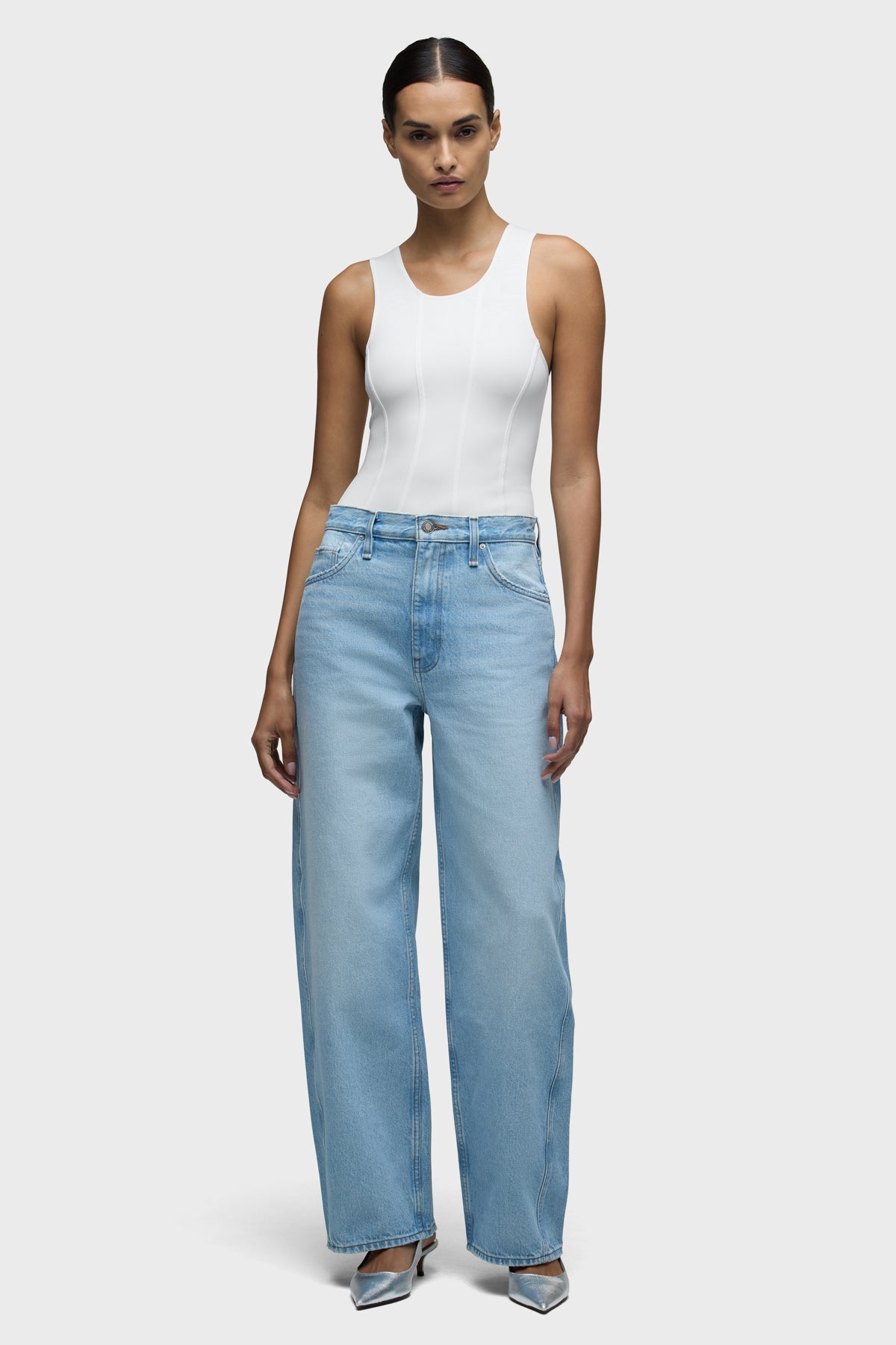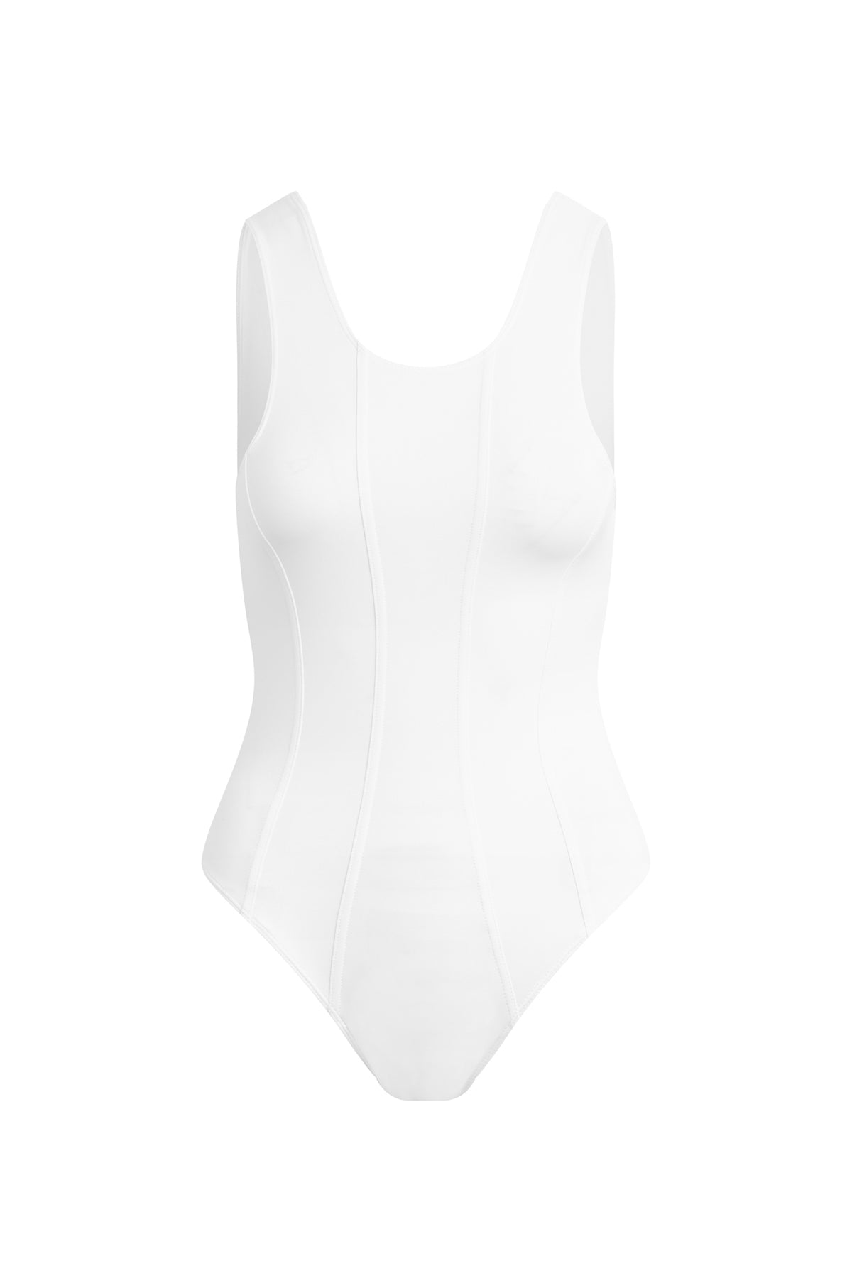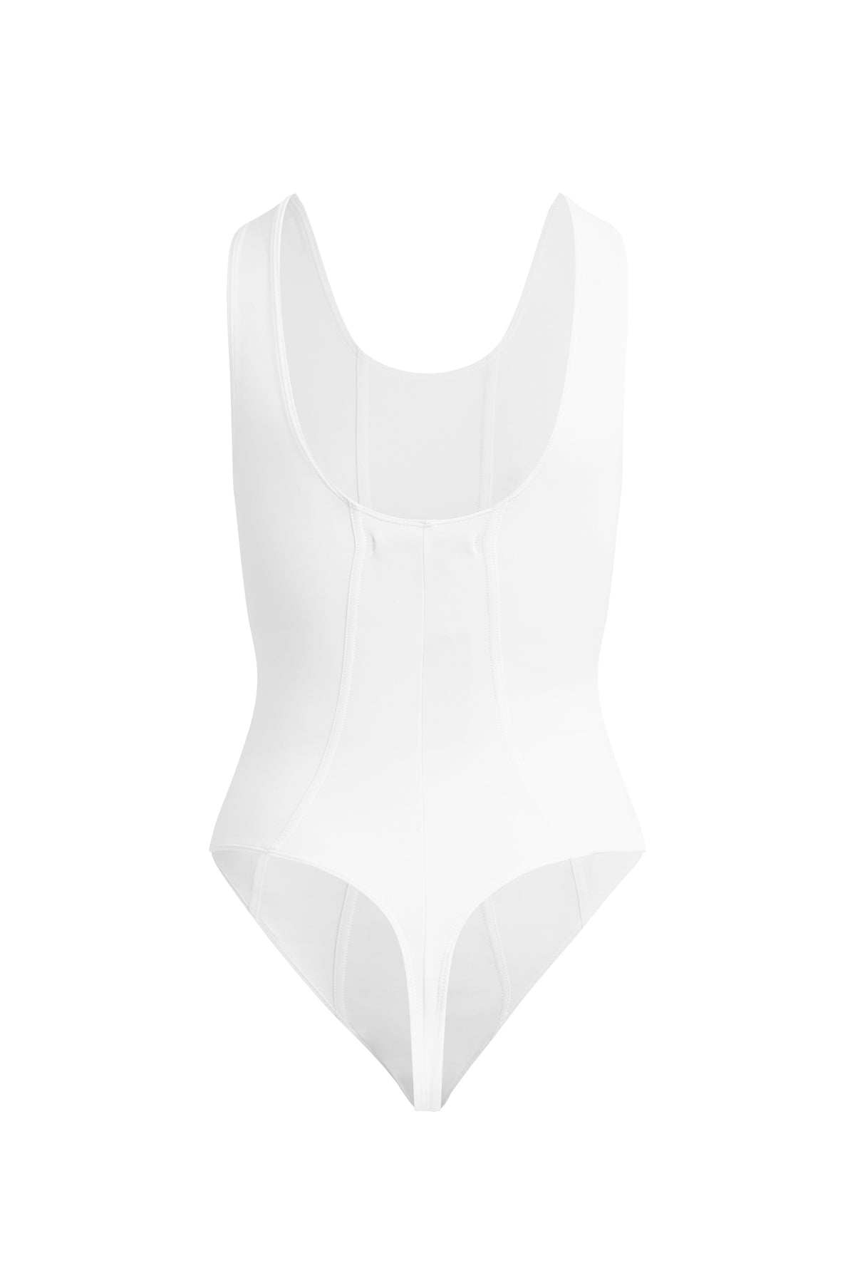Our Scuba Scoop Neck Bodysuit in White features thong bodysuit styling and is made from our sculpting rib-scuba knit for a soft and flexible feel with every move. -