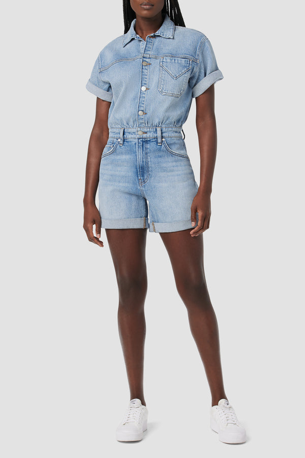 Our Short Sleeve Romper in Ocean Waters is cut from premium comfort stretch denim in light indigo. Featuring a pointed collar, button front closure and classic five-pocket details. Roll hem and sleeves for a relaxed weekend look.