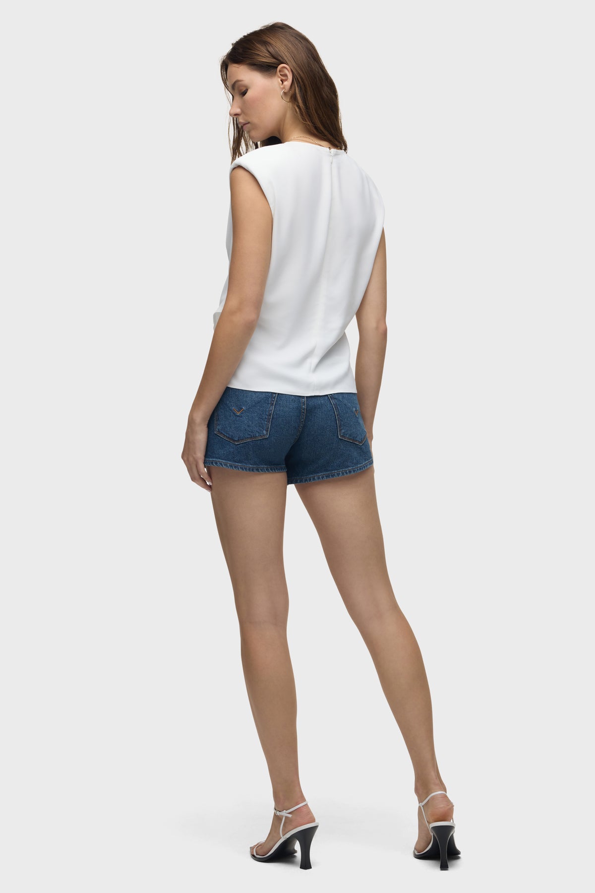 The Shoulder Padded Wrap Sleeveless Tee in White is a classic staple made of a satin-like fabric that will elevate any look. This top features shoulder pads, a crew neckline, a wrap detail in front and a zipper at the center back. -