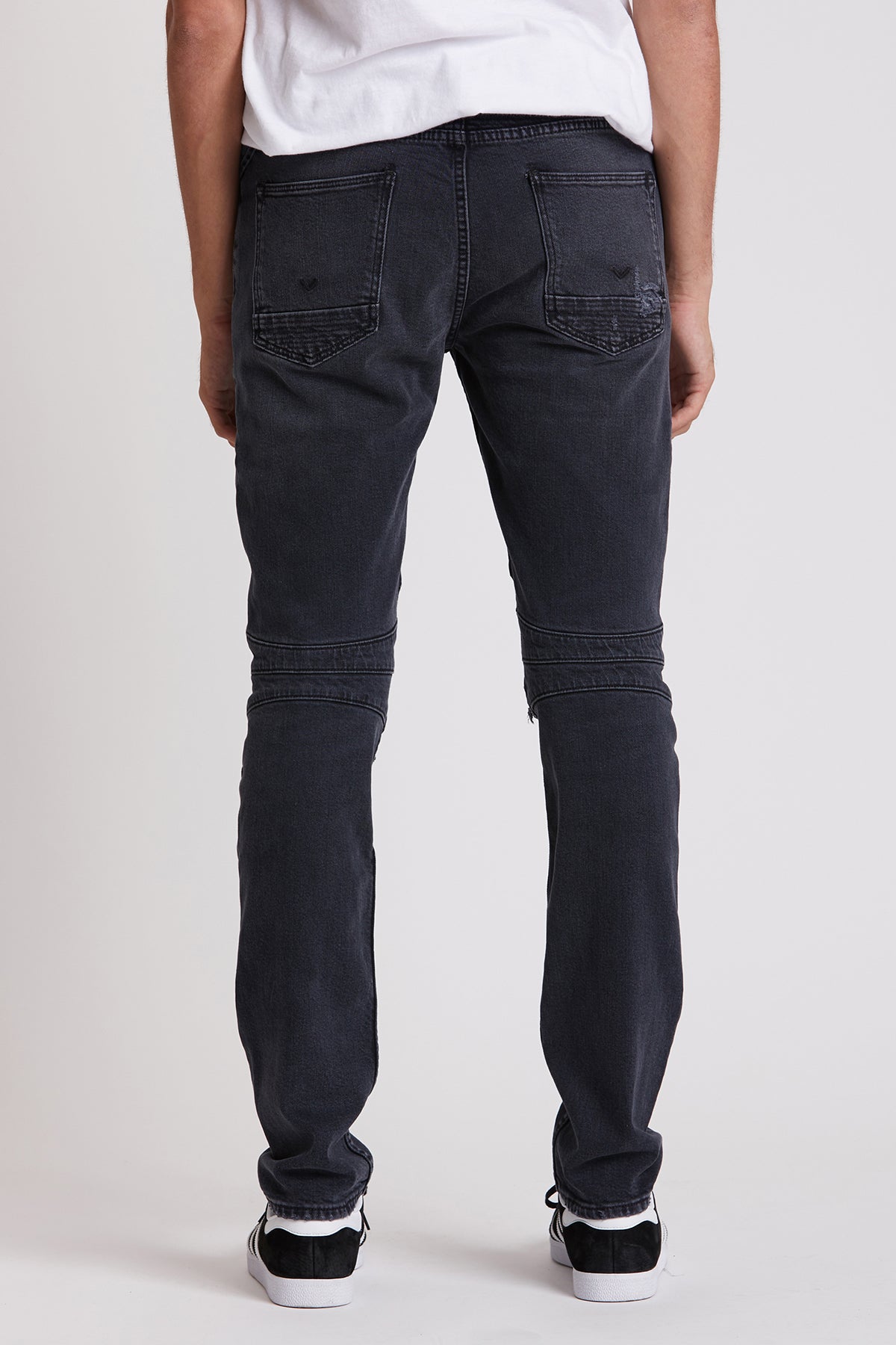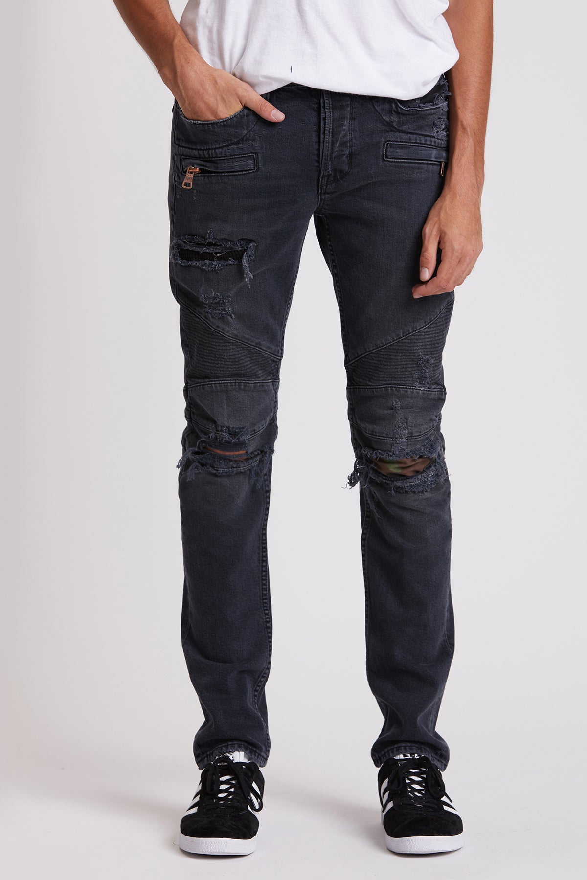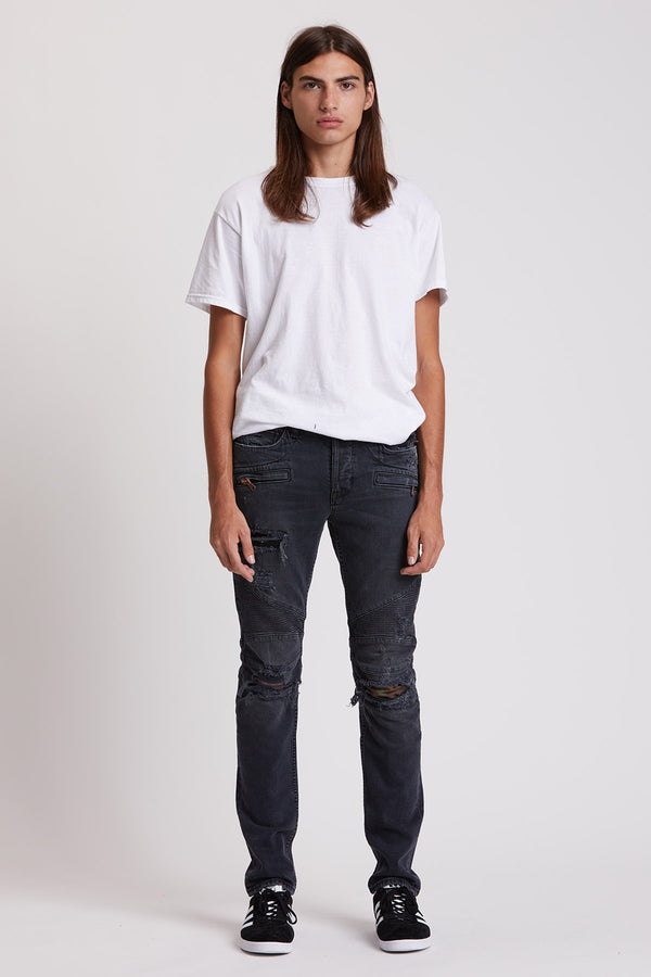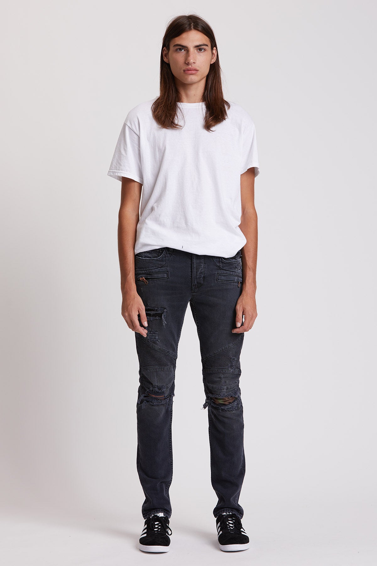 Inspired by moto styles, our Blinder Biker Jean is crafted from 12-ounce Italian denim with a hint of stretch for added softness, comfort, and flexibility. Zip pockets, ribbed leg panels. Heavily distressed, the vintage black Full Court wash features two blown-out knees-one with camo backing peeking through. -