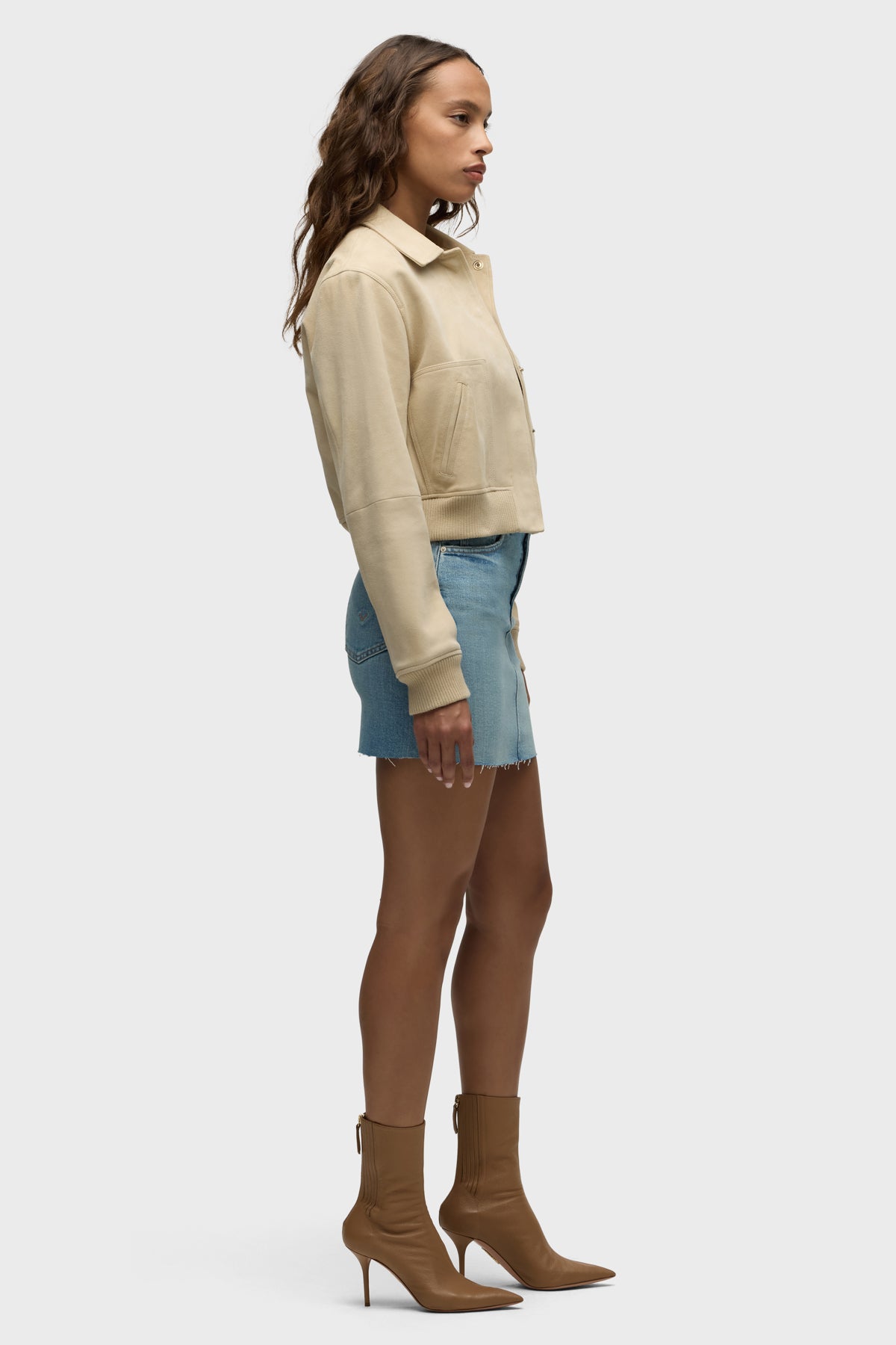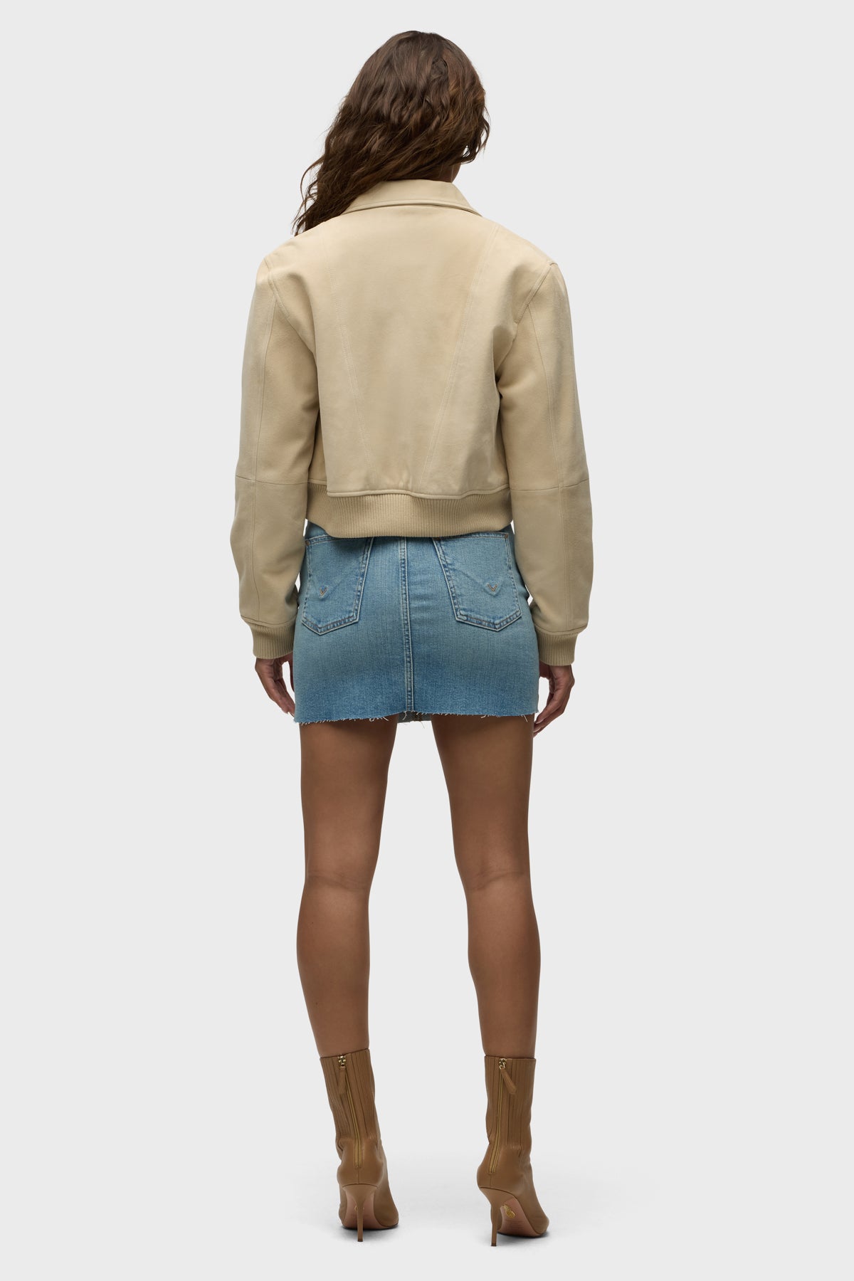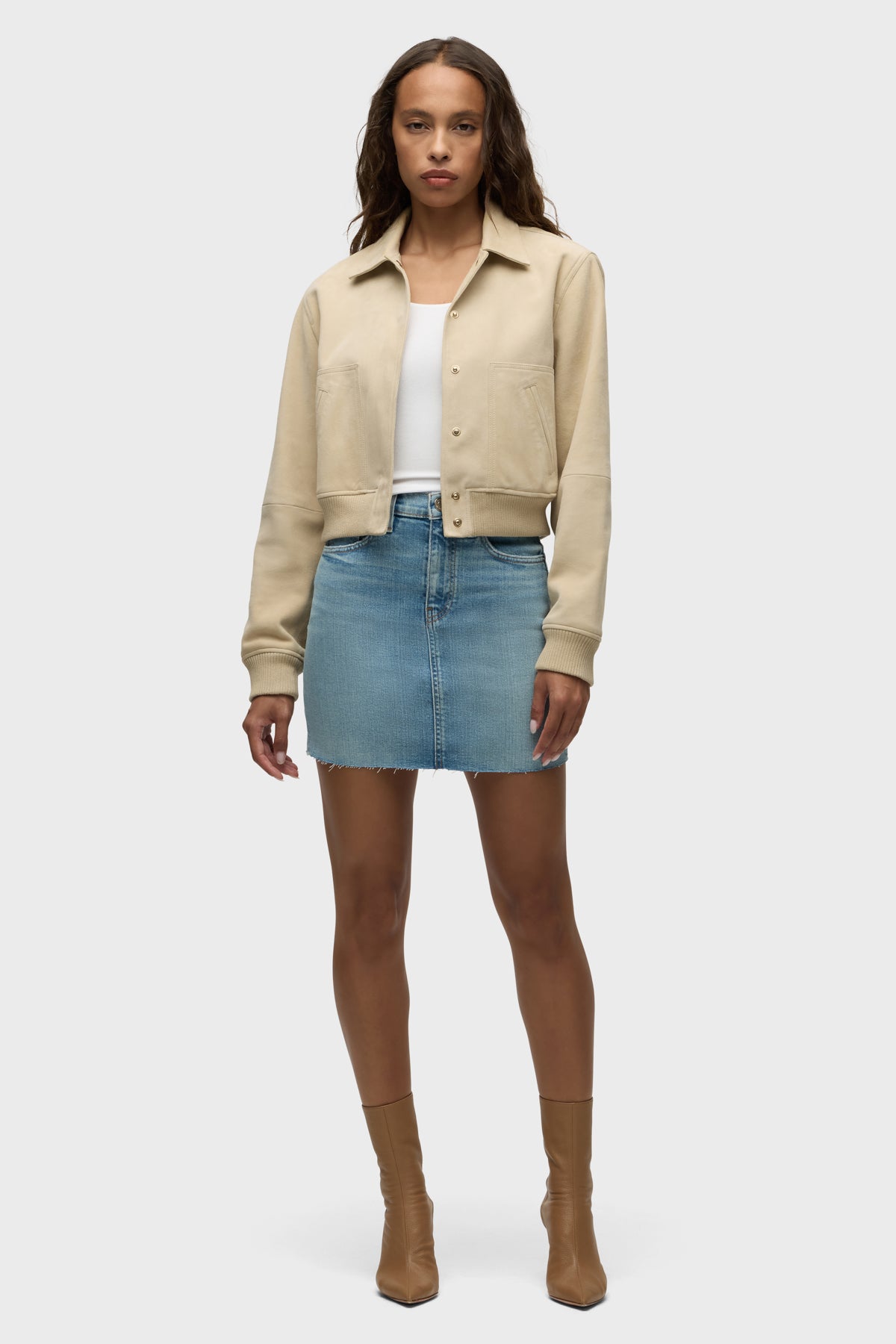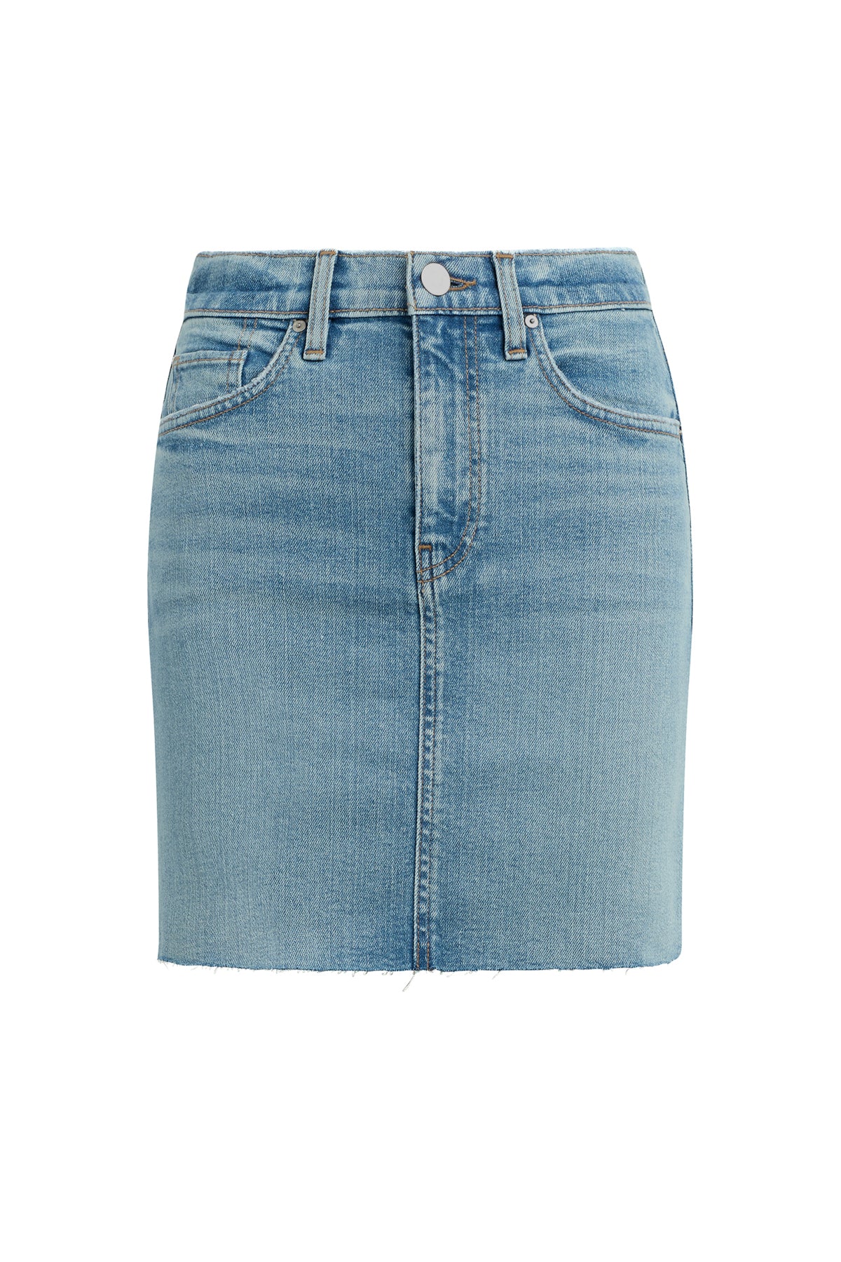 Our Viper Mini Skirt in medium-light Aviator is made from premium comfort stretch denim for flexibility. High-rise, A-line shape. Complete with whiskering, a raw hem and grinding along the edges.