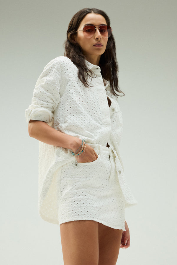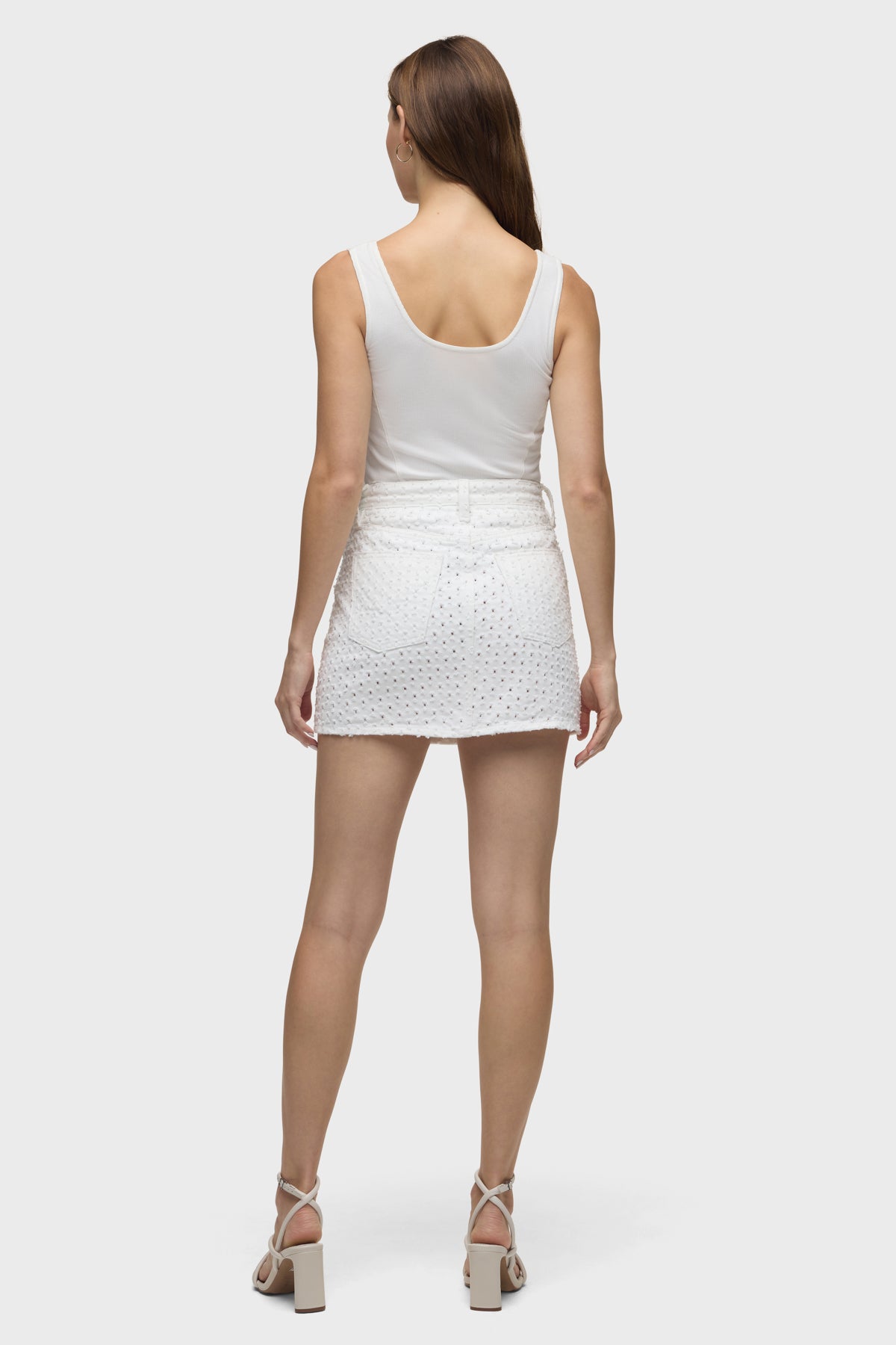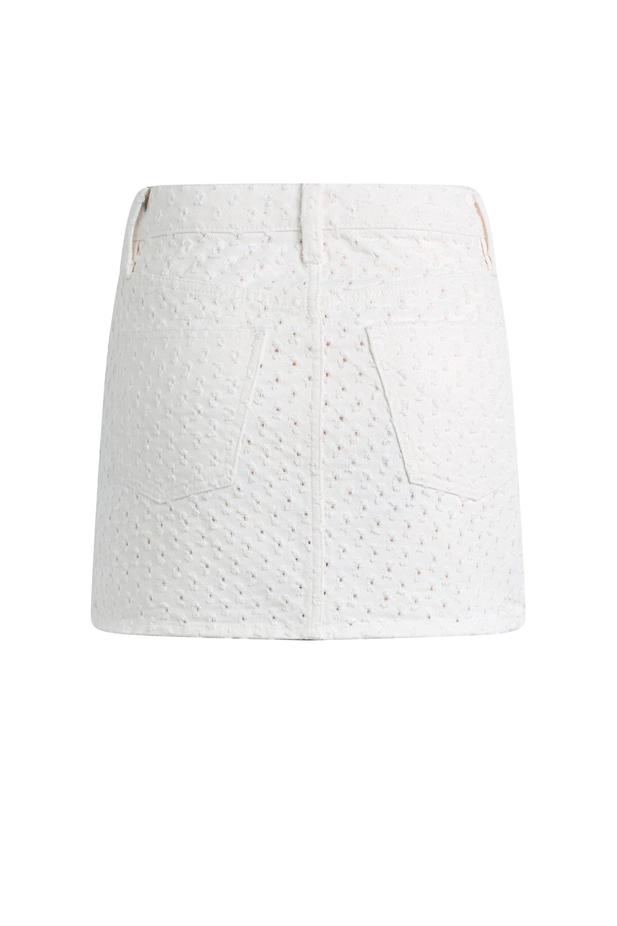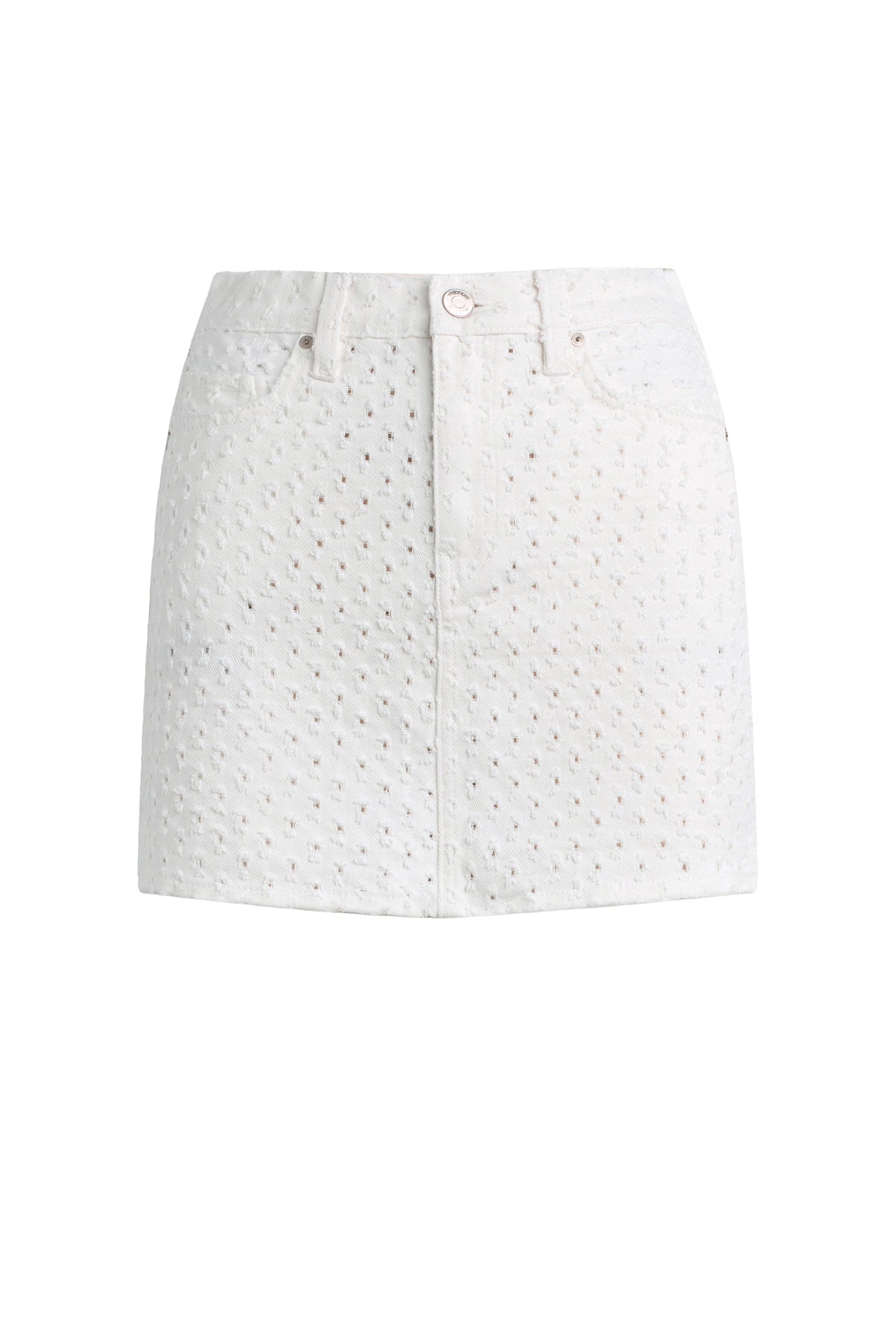 Our Viper Mini Skirt in Tattered White has a classic high-rise, A-line shape with classic five-pocket detailing. It is cut from rigid fabric with a tattered look and finished with a clean hem. -