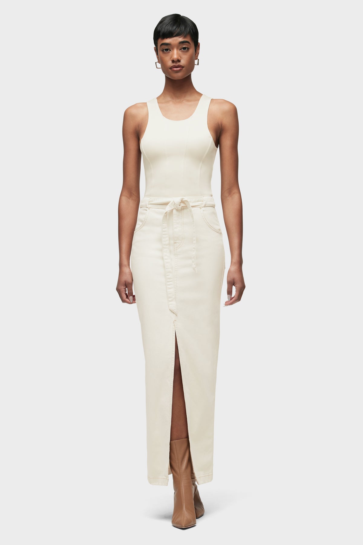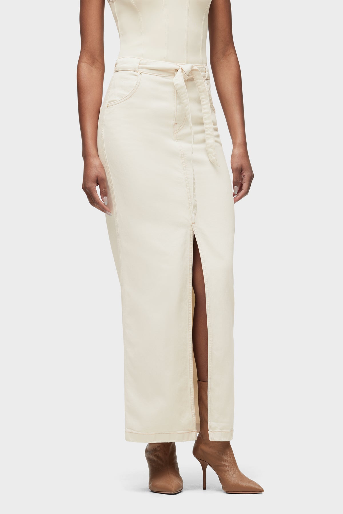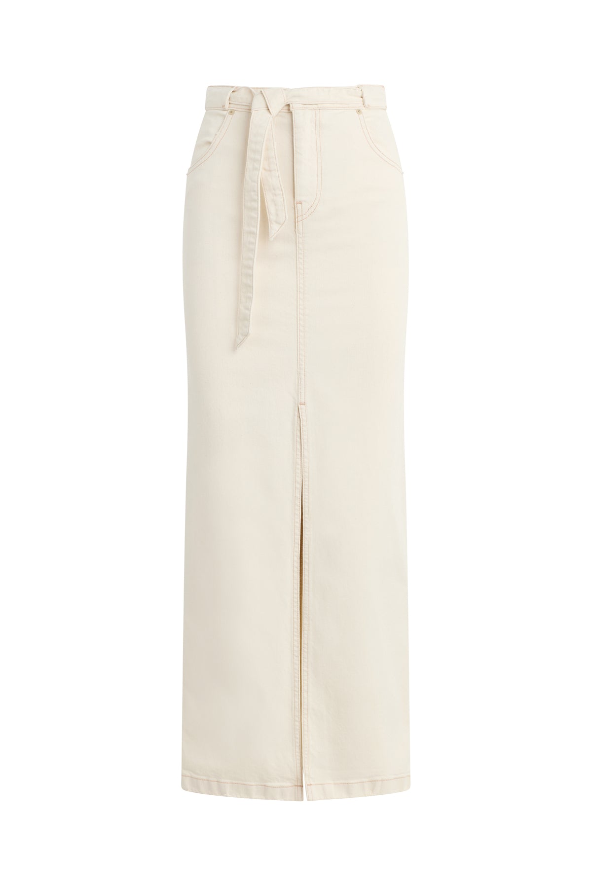 The Tie Waist Maxi Skirt in Ecru is cut from premium stretch fabric with a column fit. Self-tie belt, front scoop pocket and center-front slit complete the look. -