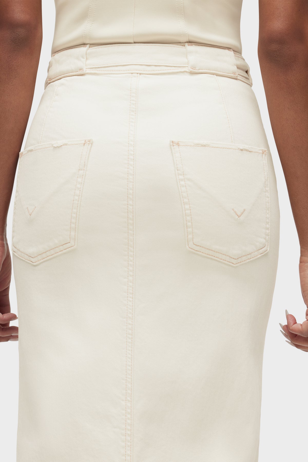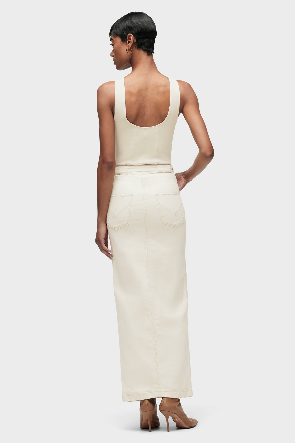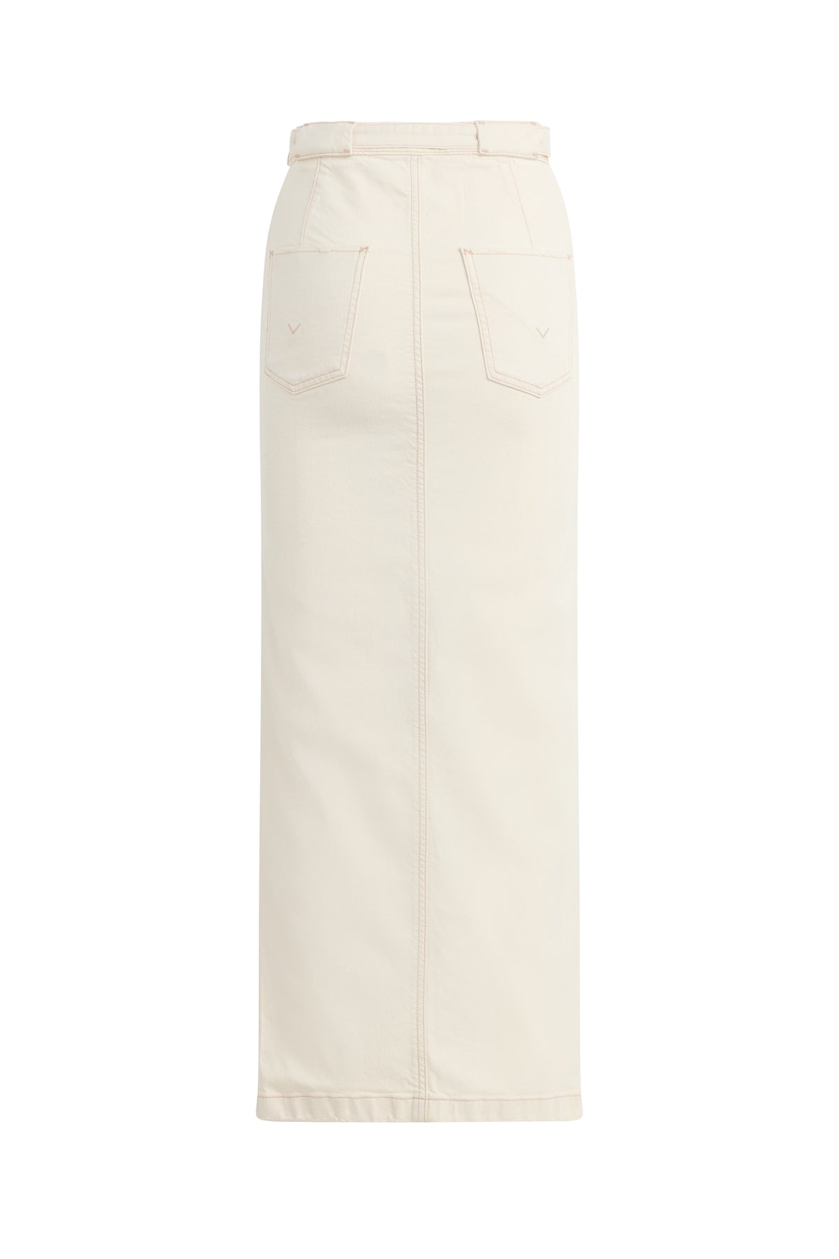 The Tie Waist Maxi Skirt in Ecru is cut from premium stretch fabric with a column fit. Self-tie belt, front scoop pocket and center-front slit complete the look. -