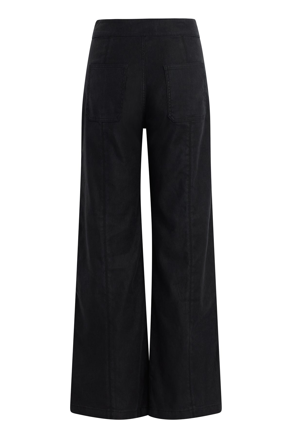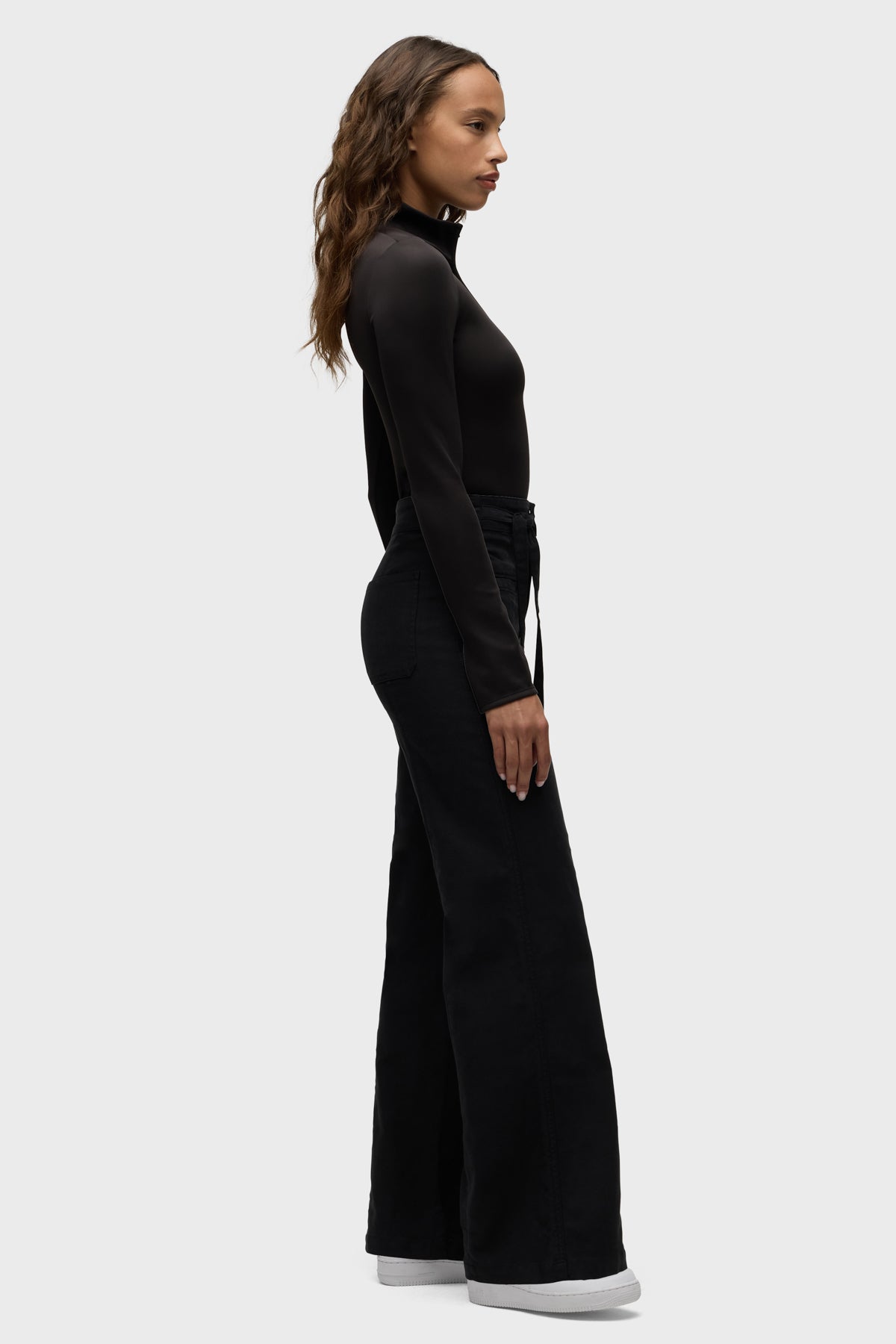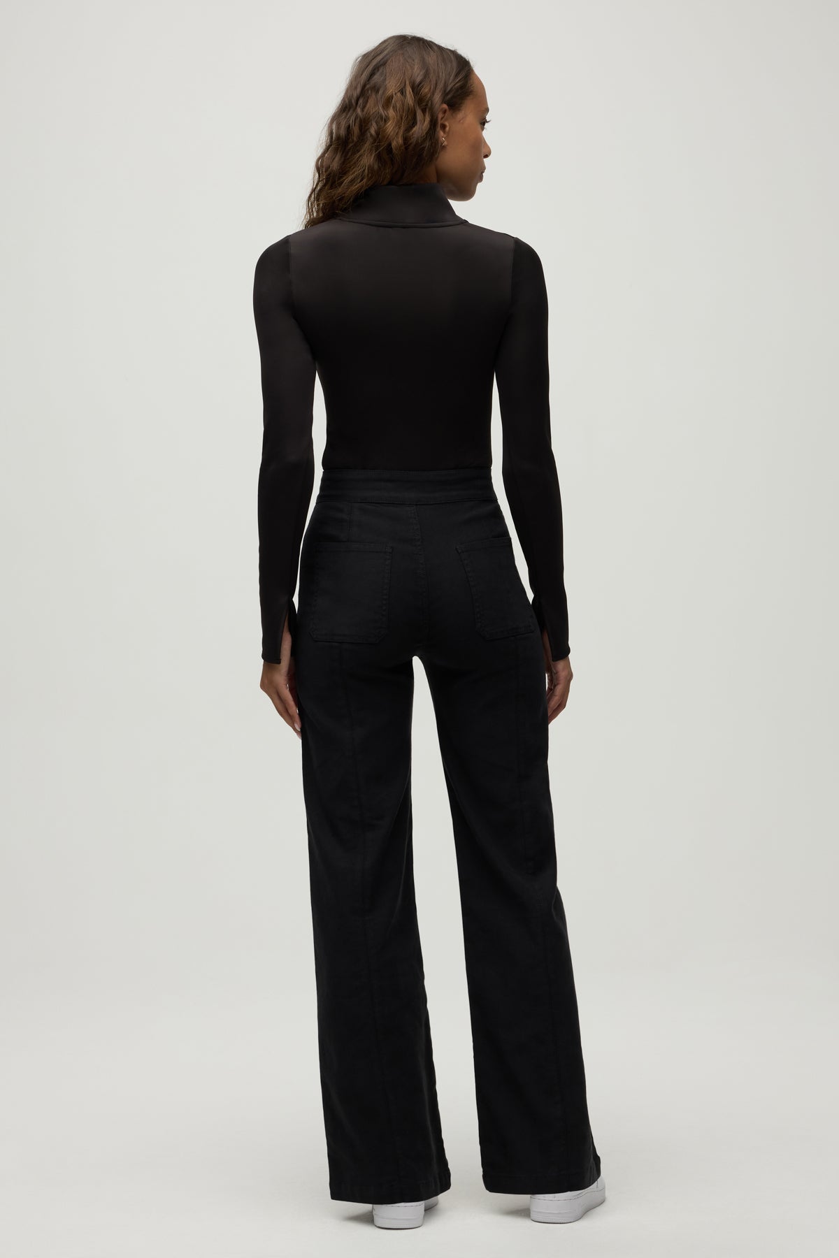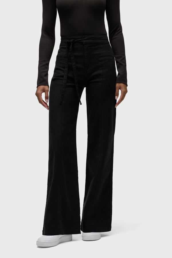 Our Tie Waist Pintucked Trouser Pant in Black Beauty is an overdyed black wash made from a linen-blend. Features an elevated waistline, front and back pintuck details, and a side tie belt with a 32" inseam. -