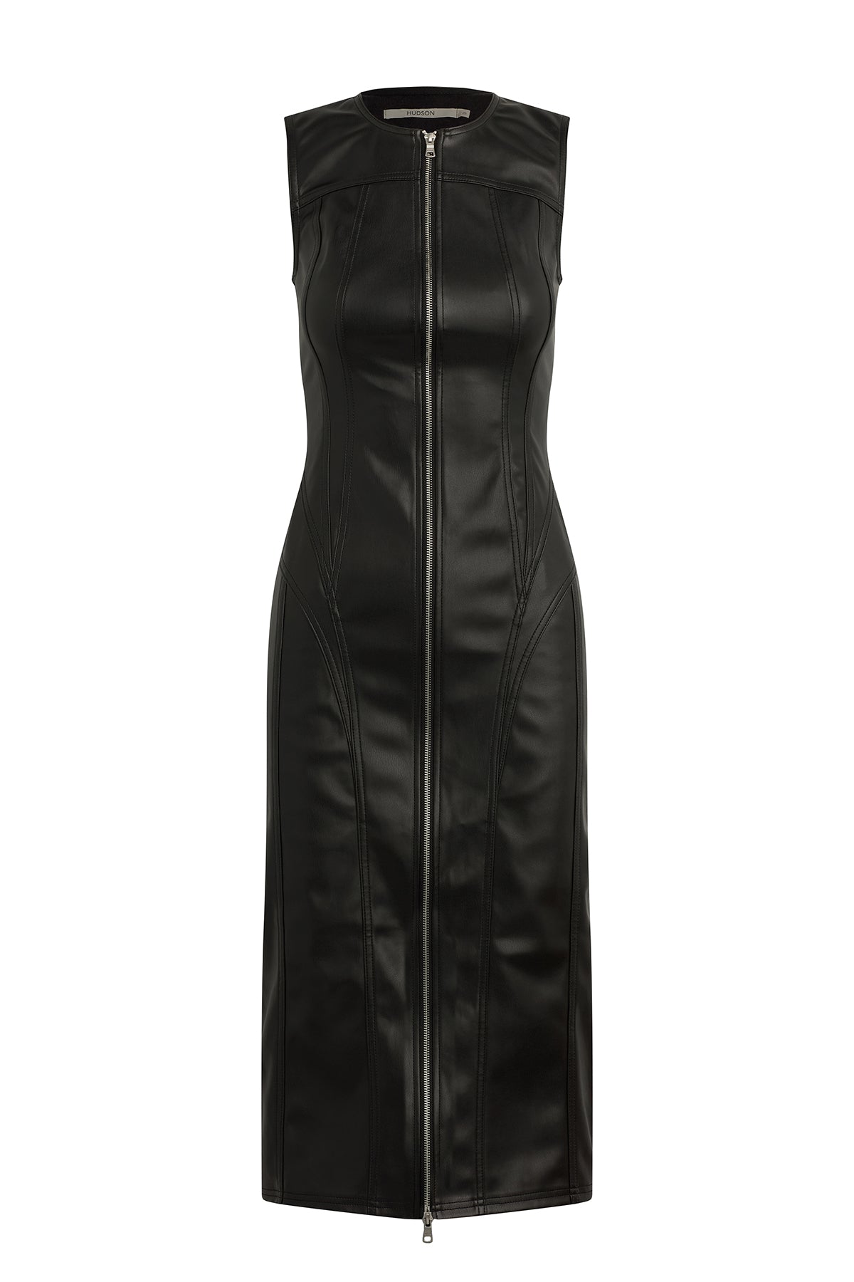 This Vegan Seamed Midi Dress in Black is sure to stun everywhere you go. This dress features a crewneck, a two-way zipper at the center front and seaming details to accentuate your curves. It is made of vegan leather with stretch. -