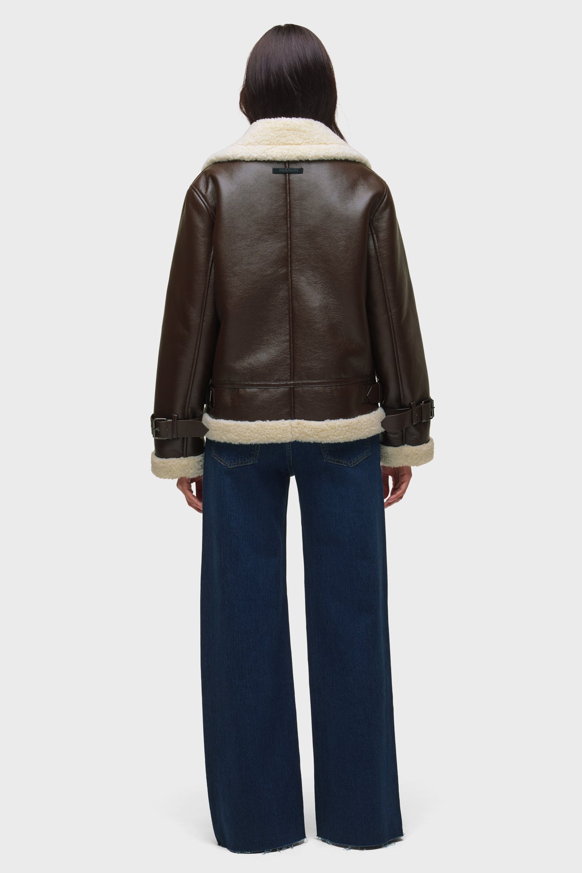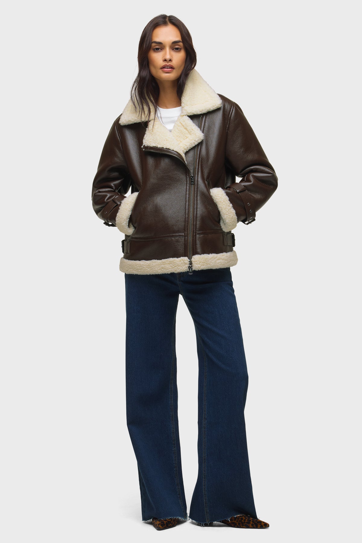 The Vegan Leather Sherpa Jacket in Black Coffee has a classic look, featuring vegan leather in a rich burgundy brown. This jacket features buckles at the sleeves and is fully lined with faux sherpa. -