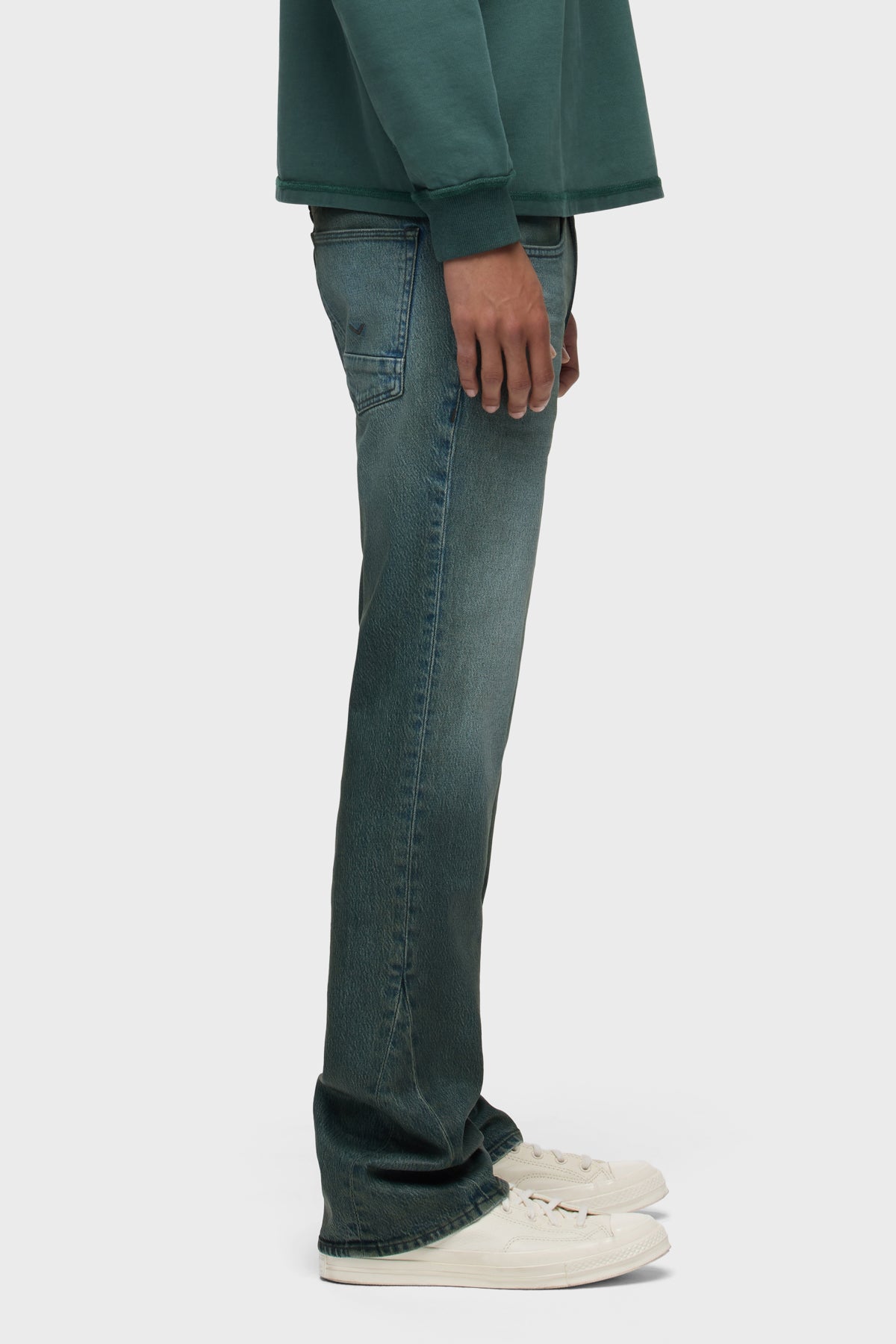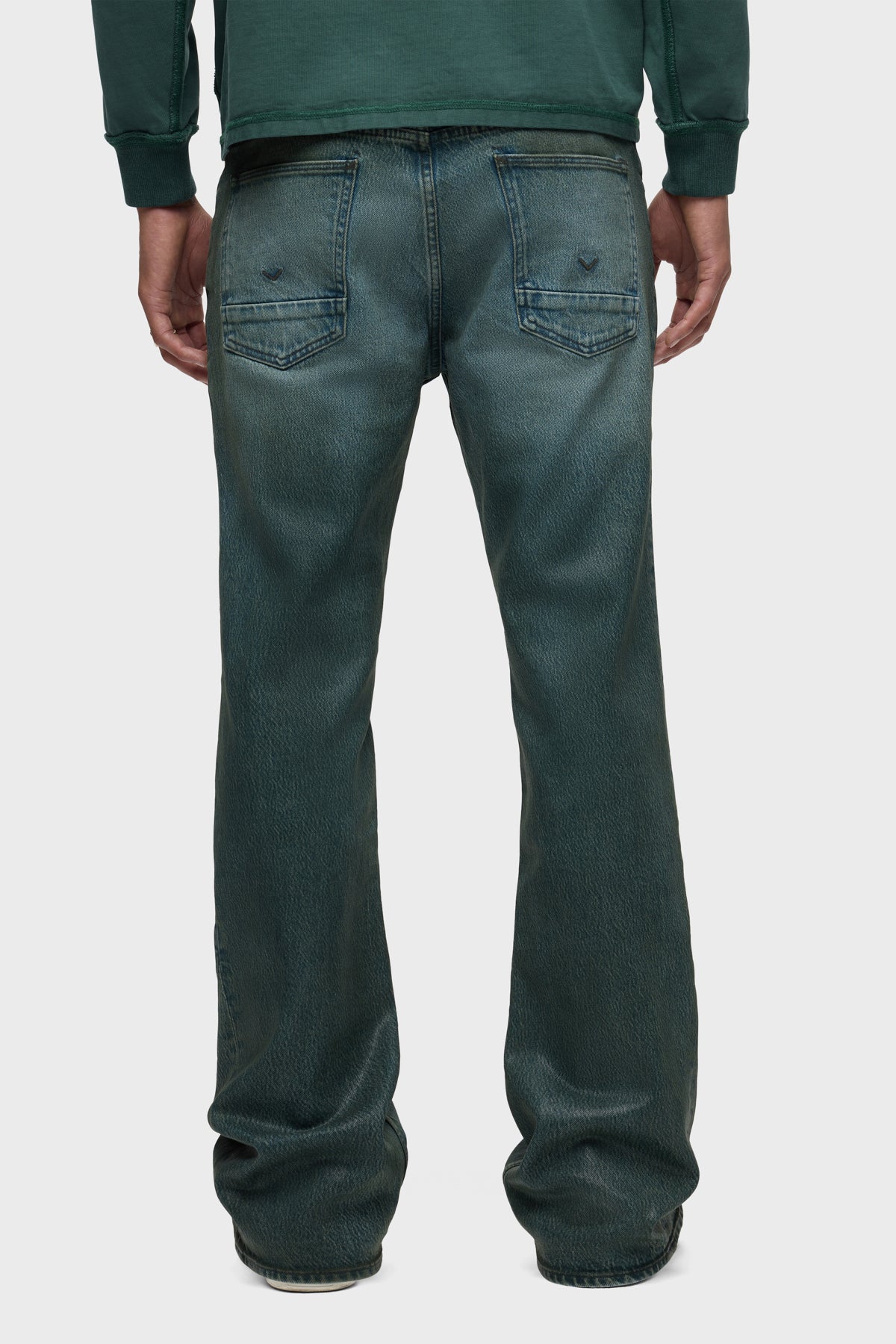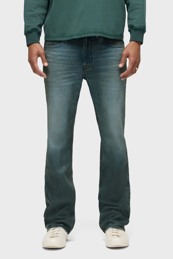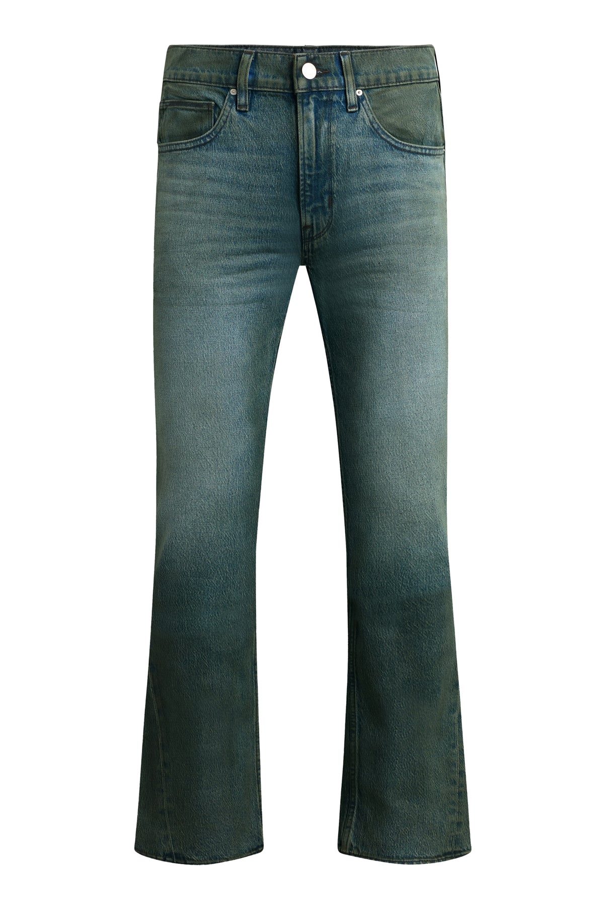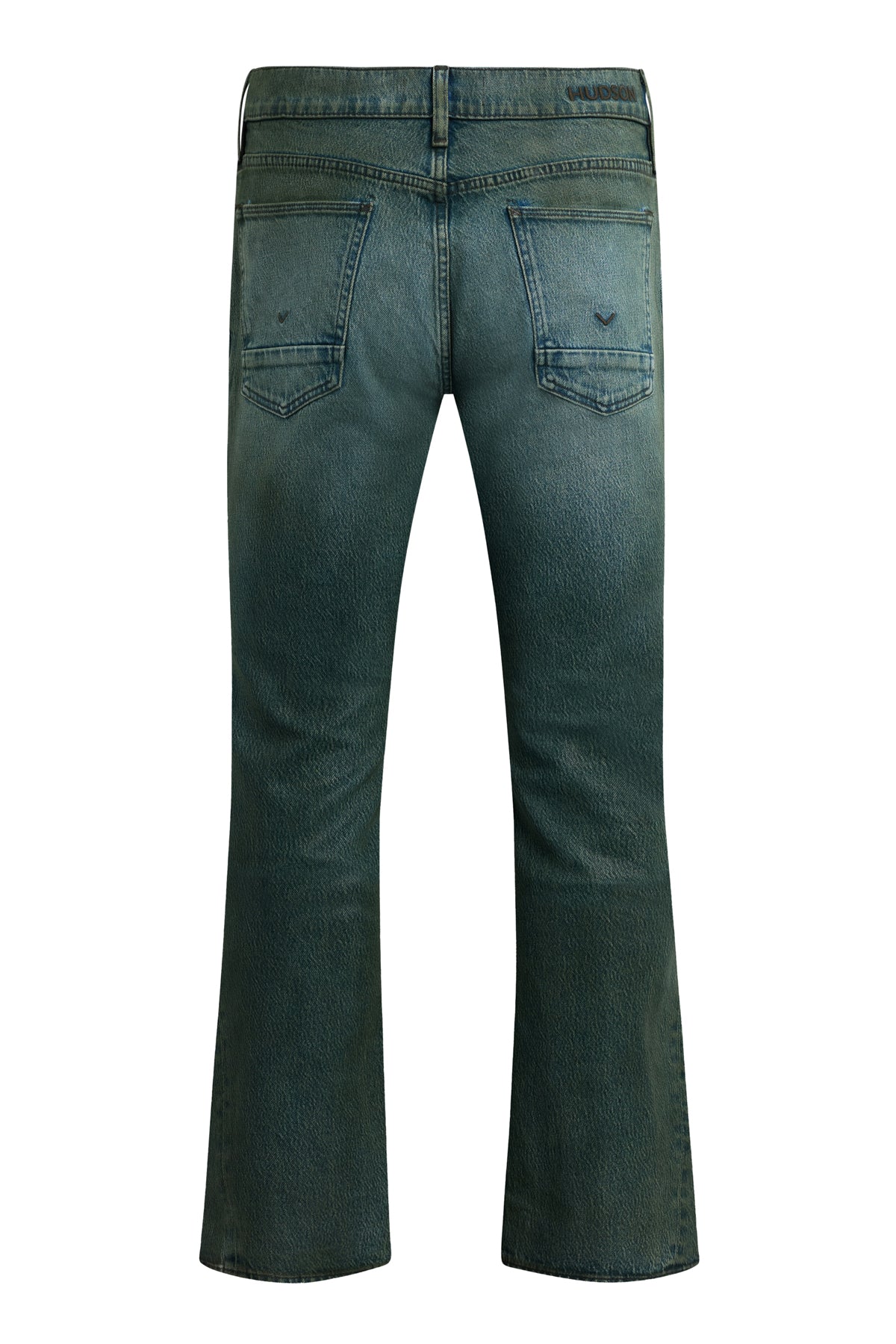 Our Walker Kick Flare is a mid rise, slim through the hip and thigh with a flared bootcut hem. Cut from premium comfort stretch denim, Coated Pine is a medium, vintage-inspired wash with a dark green base and mist coating for a subtle sheen and uneven pigmentation. Finished with classic five-pocket details, tonal stitching, matte nickel hardware and Hudson embroidery on back waistband. -