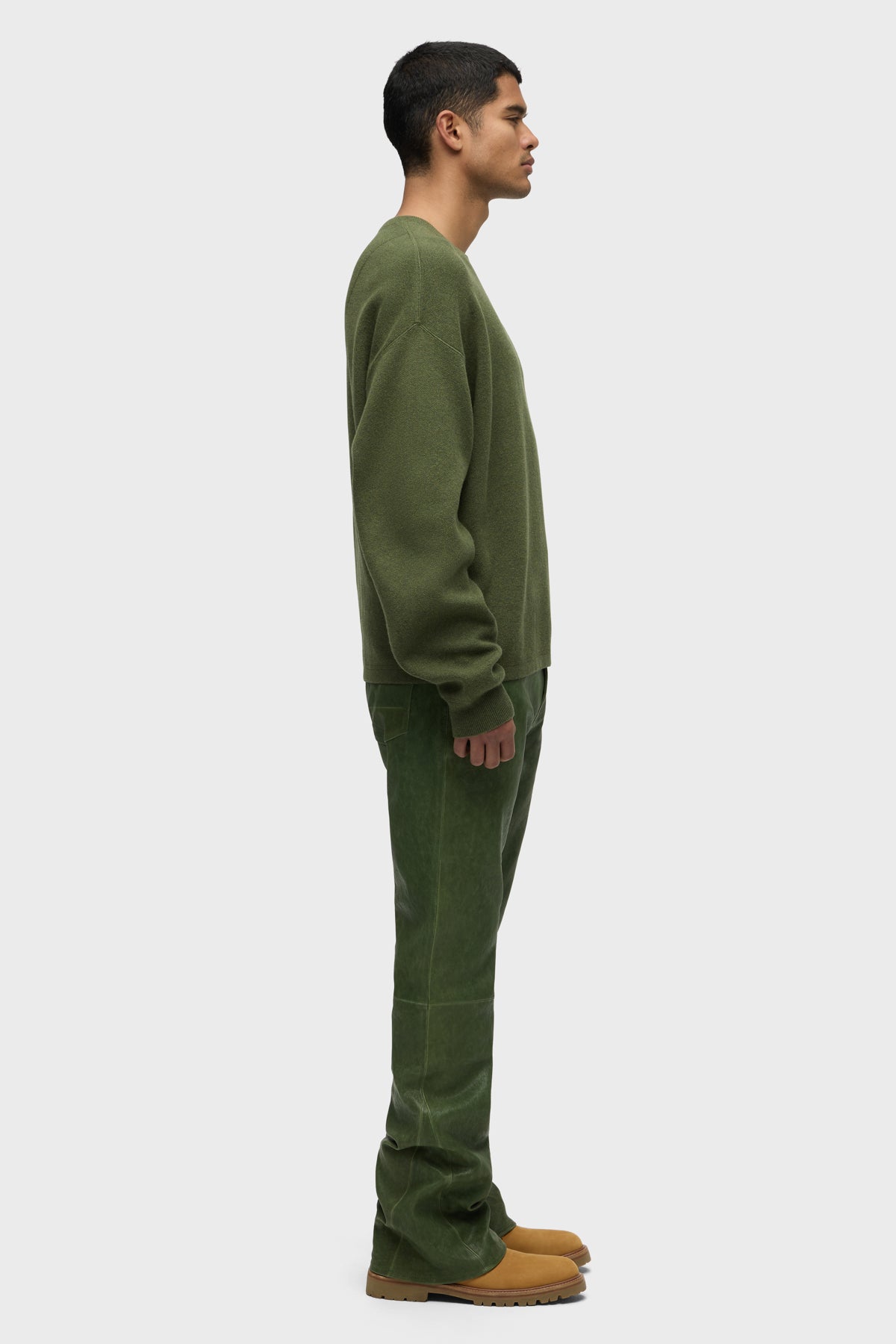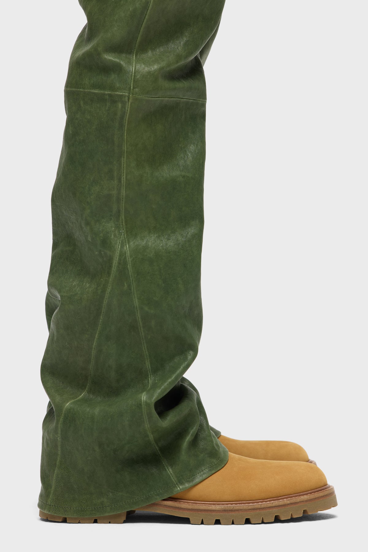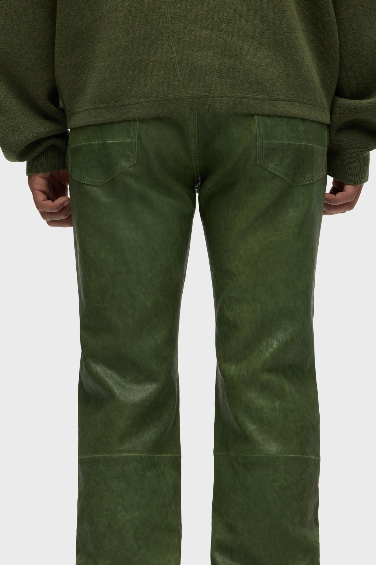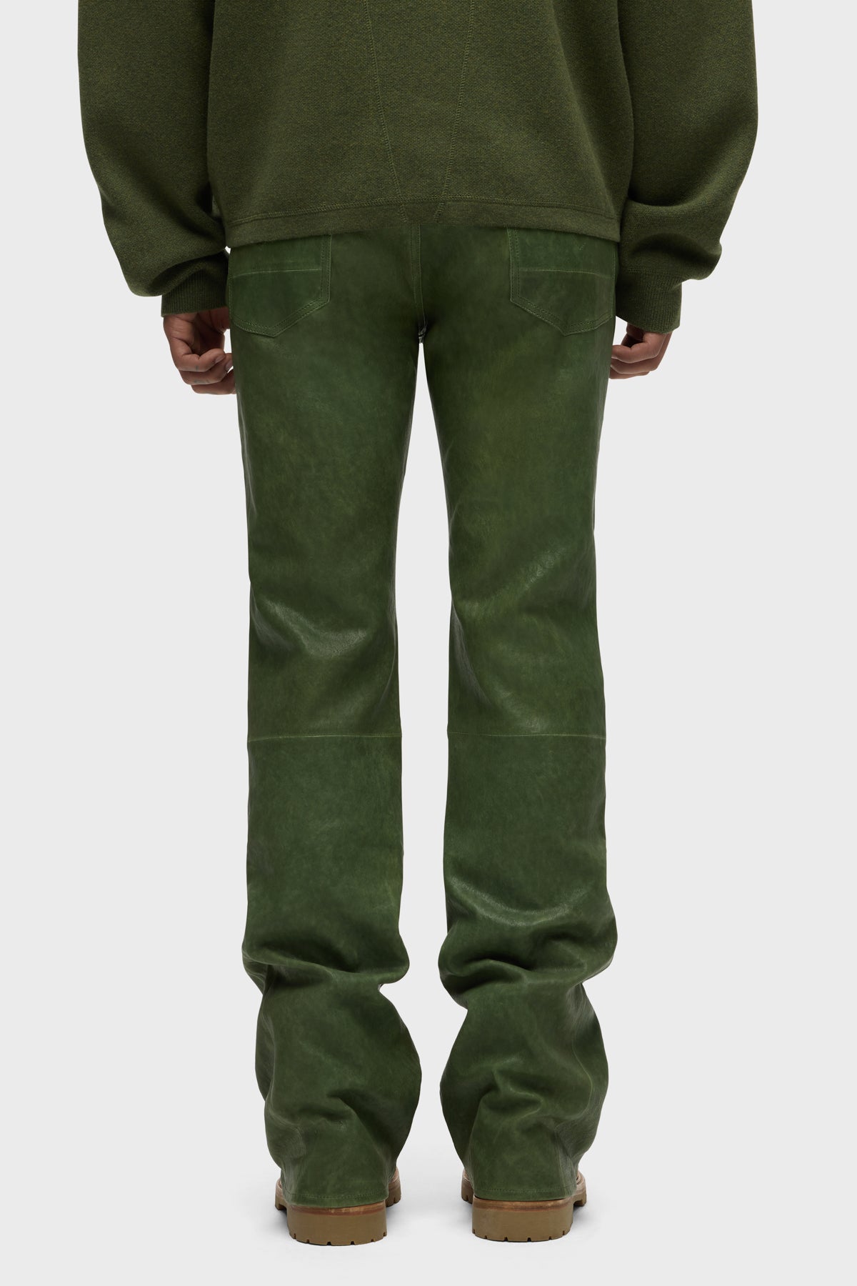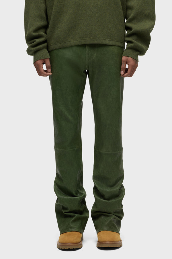 Our Walker Leather Kick Flare is a mid rise, slim through the hip and thigh with a flared bootcut hem. The olive Distress Pine wash is cut from genuine lamb leather and is finished with classic five-pocket details, matte black hardware and black leather back patch. -
