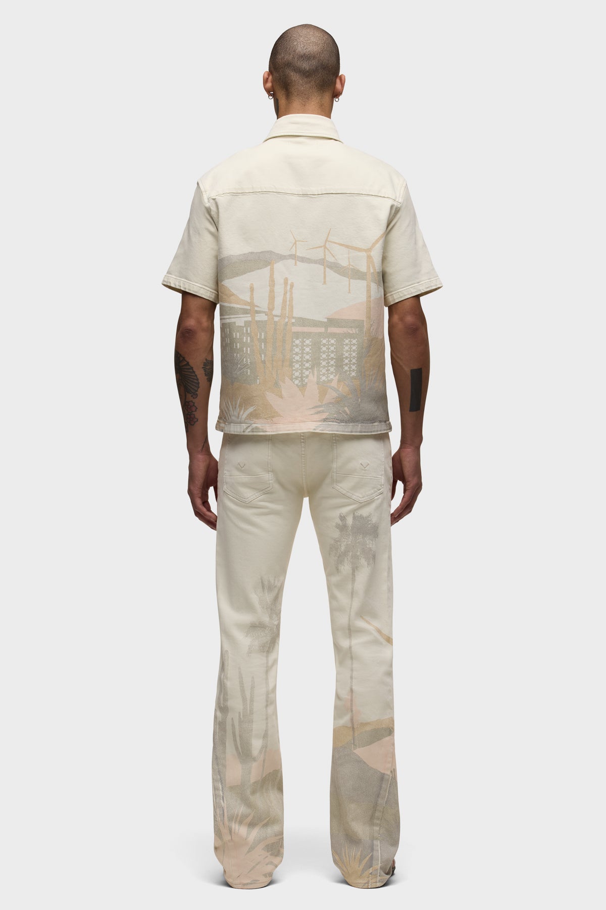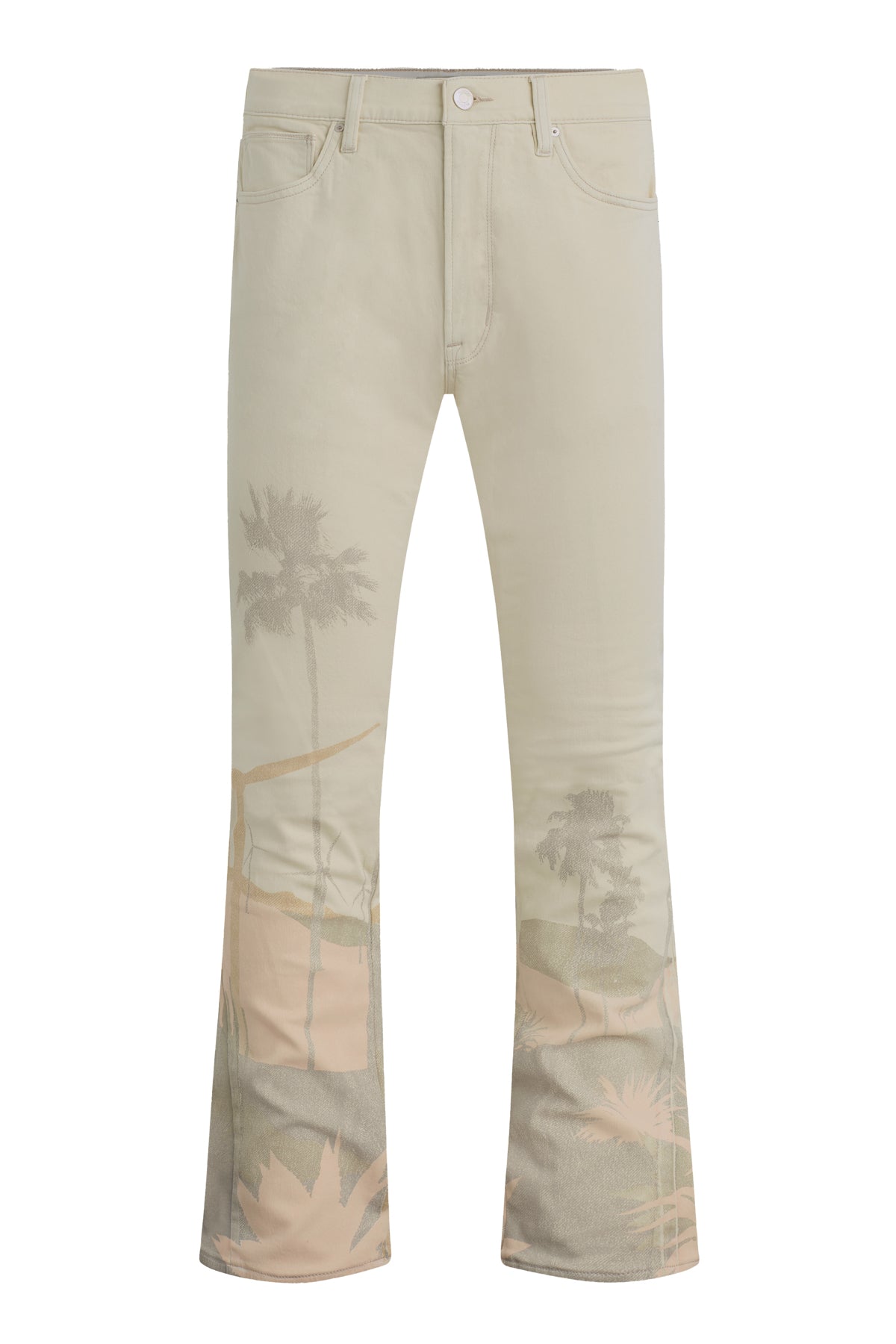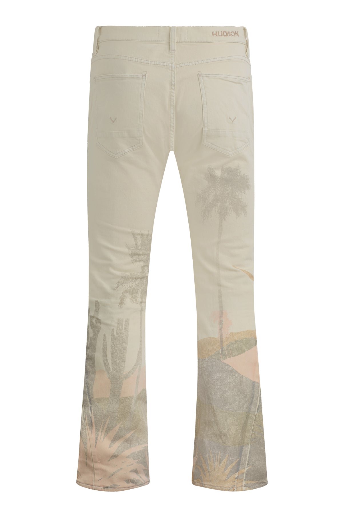 Our Walker Kick Flare Pant in Natural Desert is mid-rise and slim through the hip and thigh with a flared bootcut hem. This pair is made of stretch twill fabric in a light ecru wash with an all-over graphic print. Classic five-pocket detailing, contrast topstitching, dull nickel hardware and Hudson embroidery on the back waistband finish the look. -