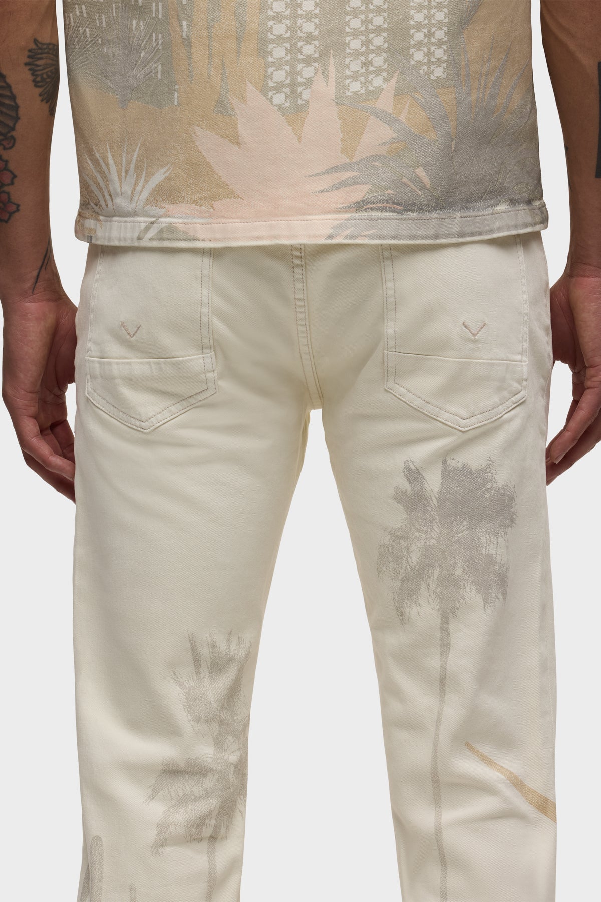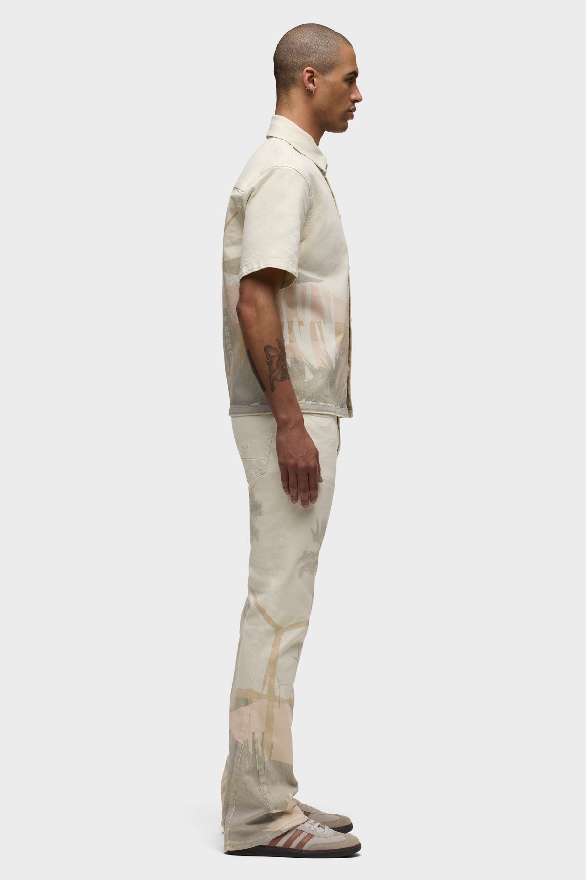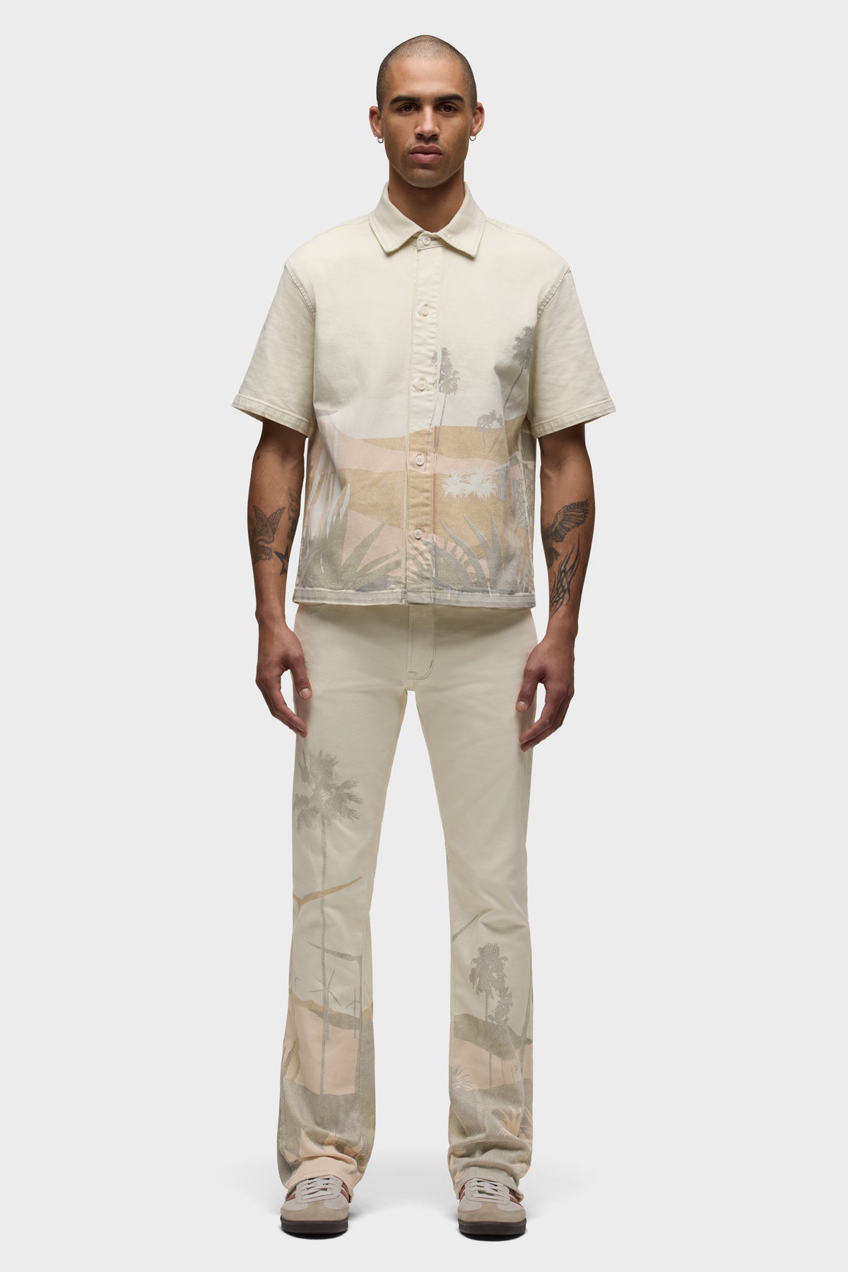 Our Walker Kick Flare Pant in Natural Desert is mid-rise and slim through the hip and thigh with a flared bootcut hem. This pair is made of stretch twill fabric in a light ecru wash with an all-over graphic print. Classic five-pocket detailing, contrast topstitching, dull nickel hardware and Hudson embroidery on the back waistband finish the look. -