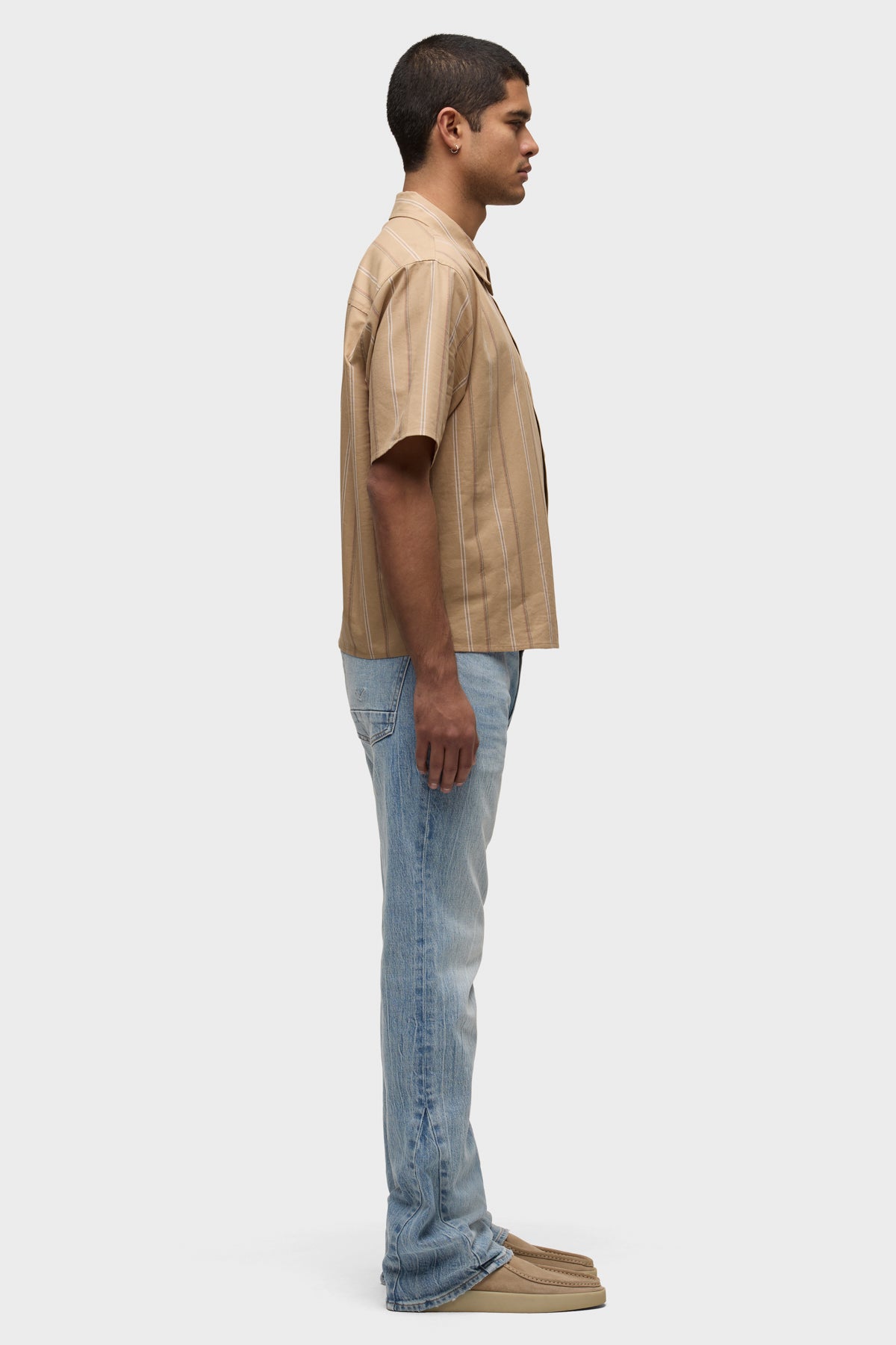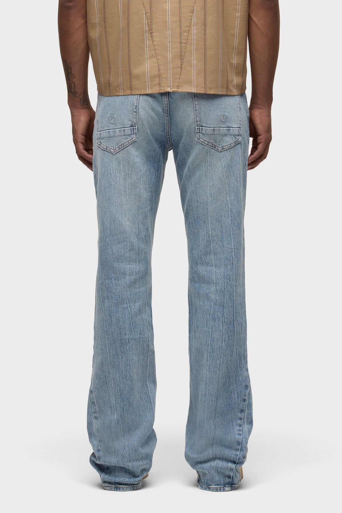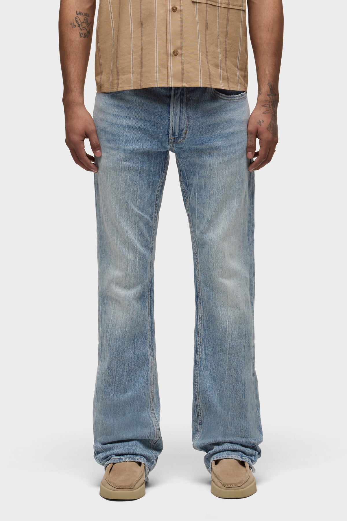 Our Walker Kick Flare Jean in Retreat is mid-rise and slim through the hip and thigh with a flared bootcut hem. Cut from comfort stretch denim in a light indigo wash, this pair is finished with classic five-pocket detailing and side seams. -