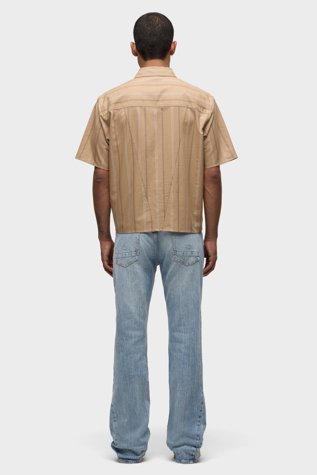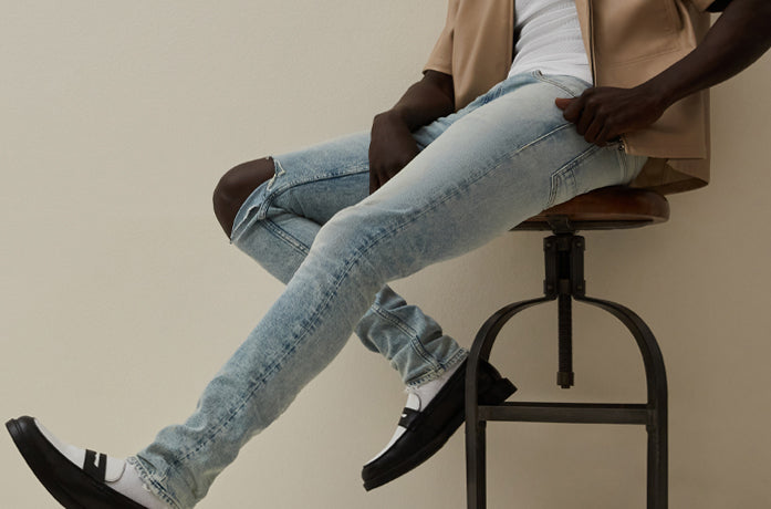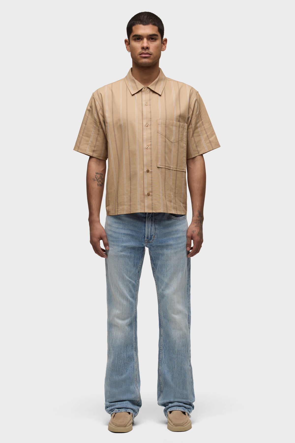 Our Walker Kick Flare Jean in Retreat is mid-rise and slim through the hip and thigh with a flared bootcut hem. Cut from comfort stretch denim in a light indigo wash, this pair is finished with classic five-pocket detailing and side seams. -