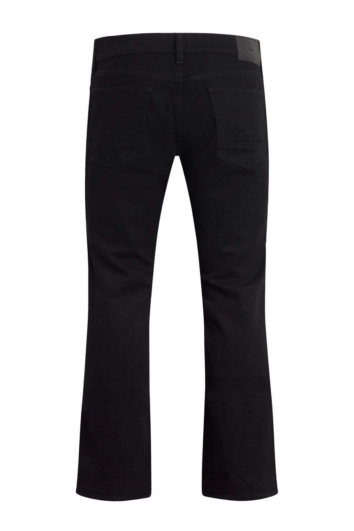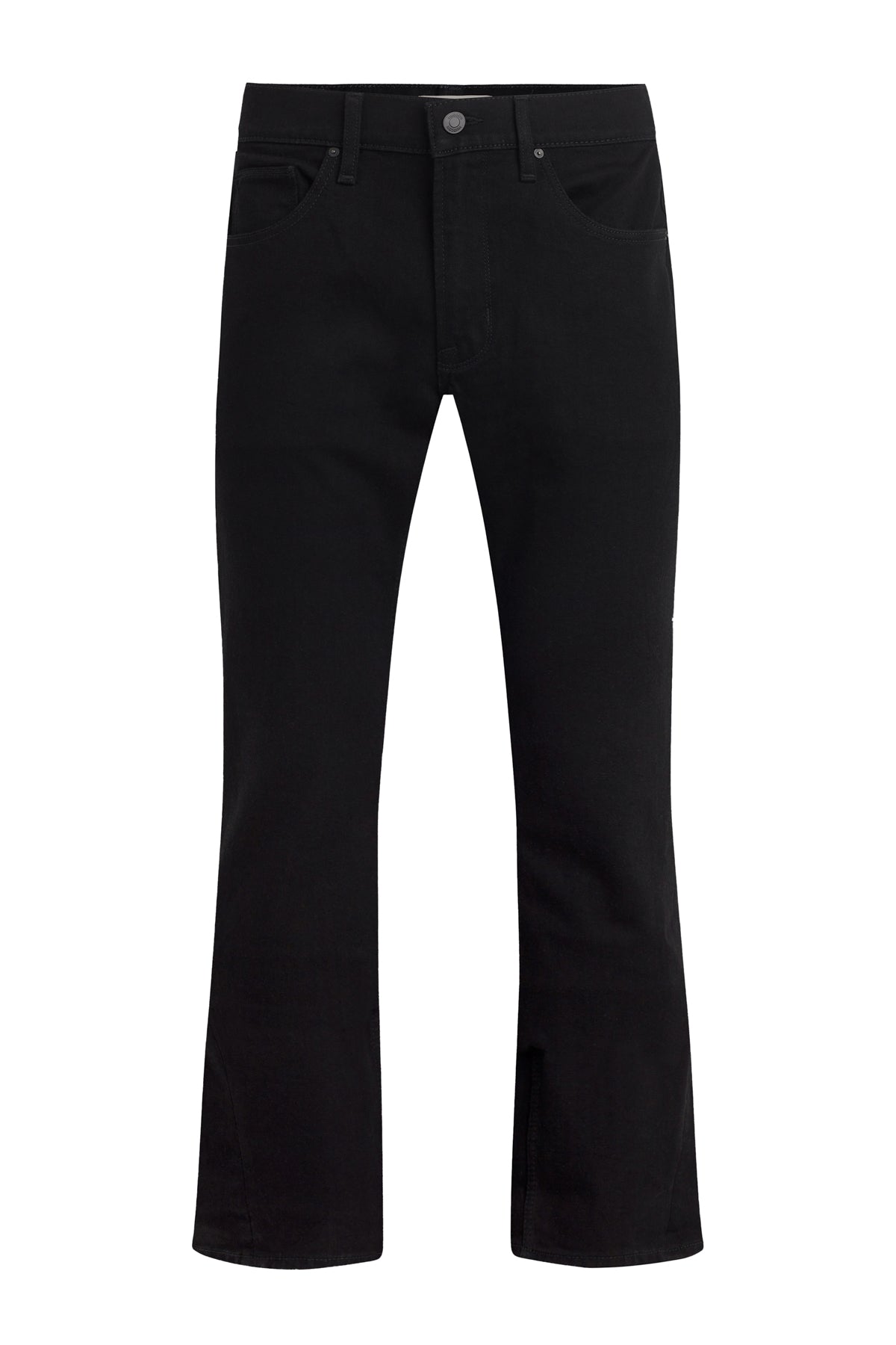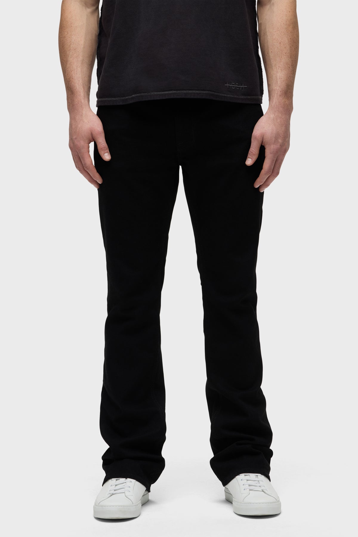 Our Walker Kick Flare is a mid-rise, slim through the hip and thigh with a flared bootcut hem. The black rinse Raven wash is finished with matte black hardware and black leather back patch. -