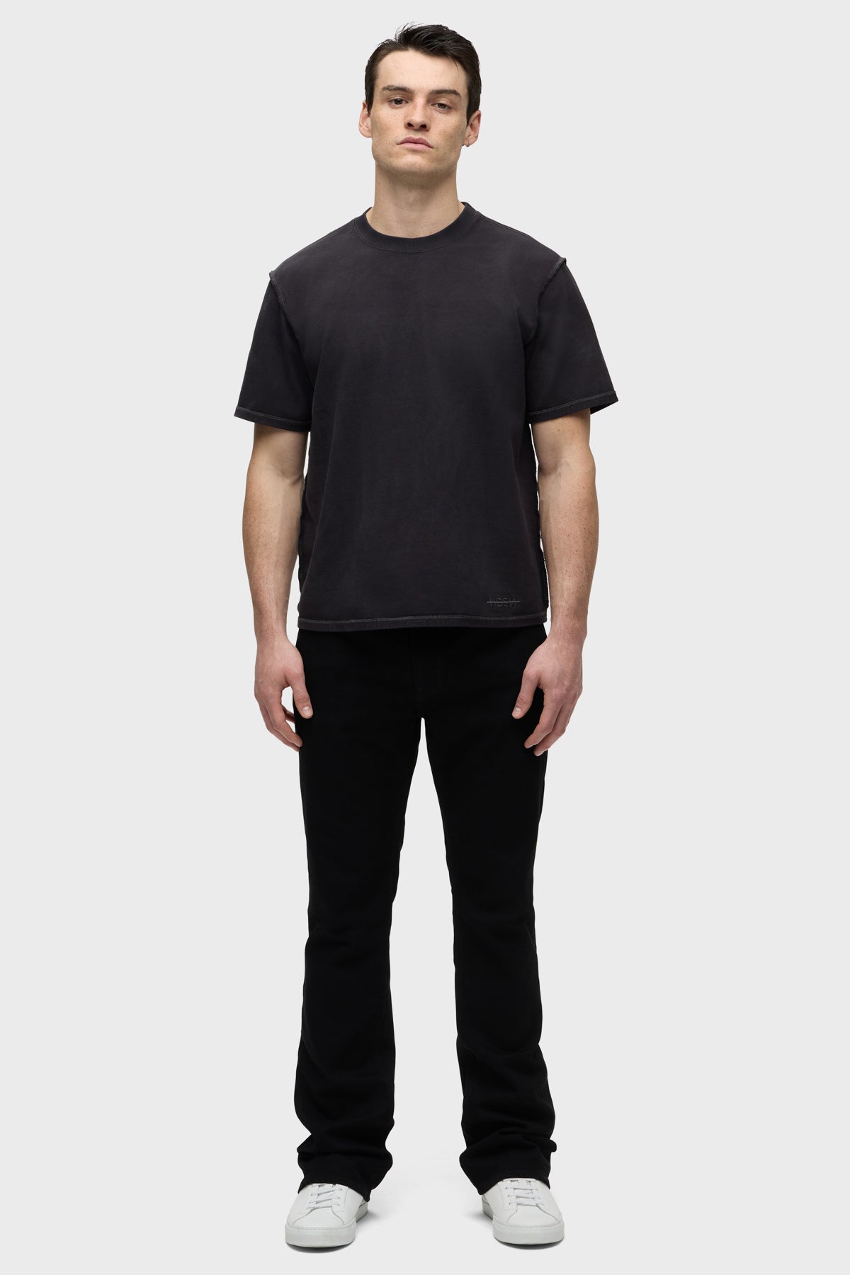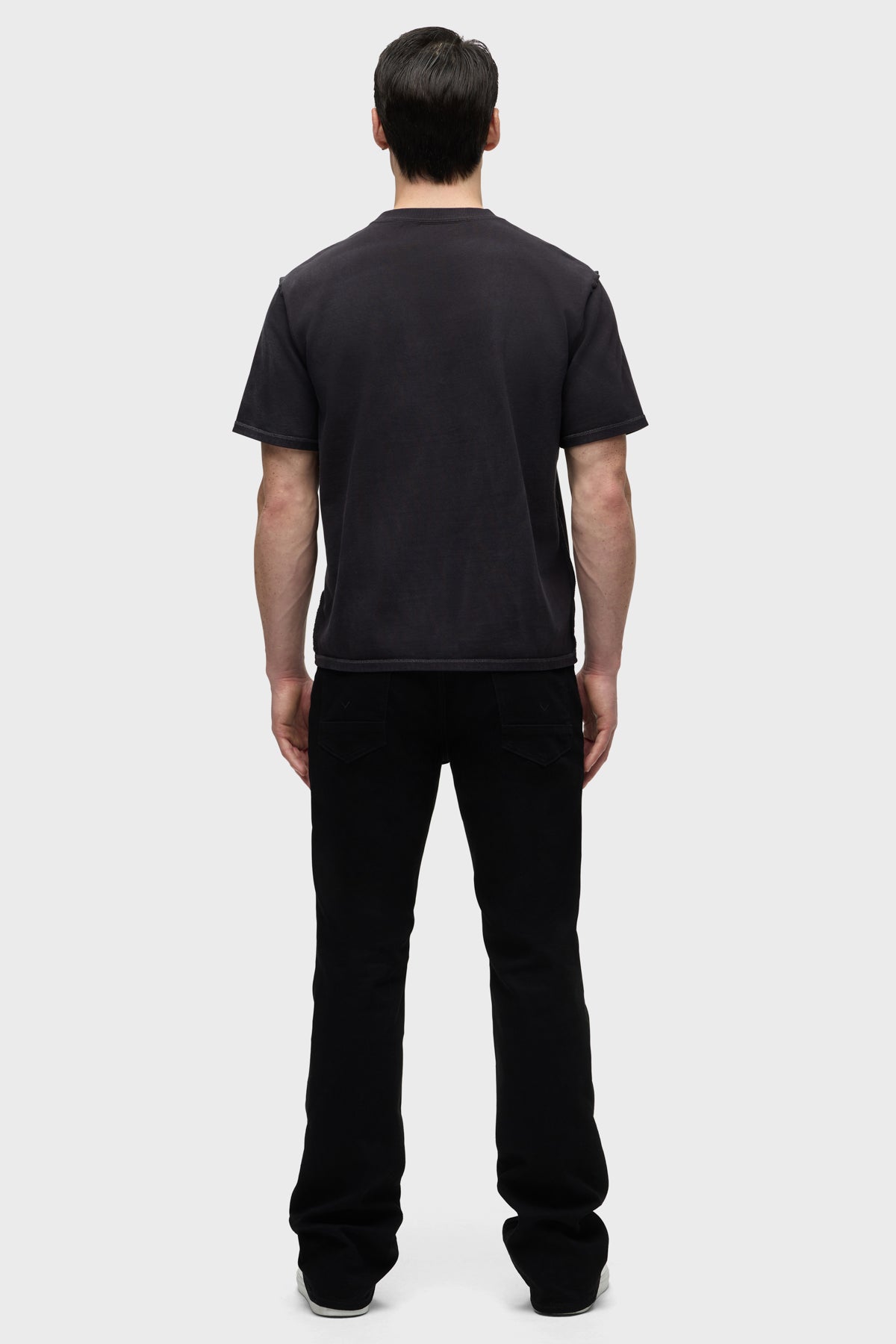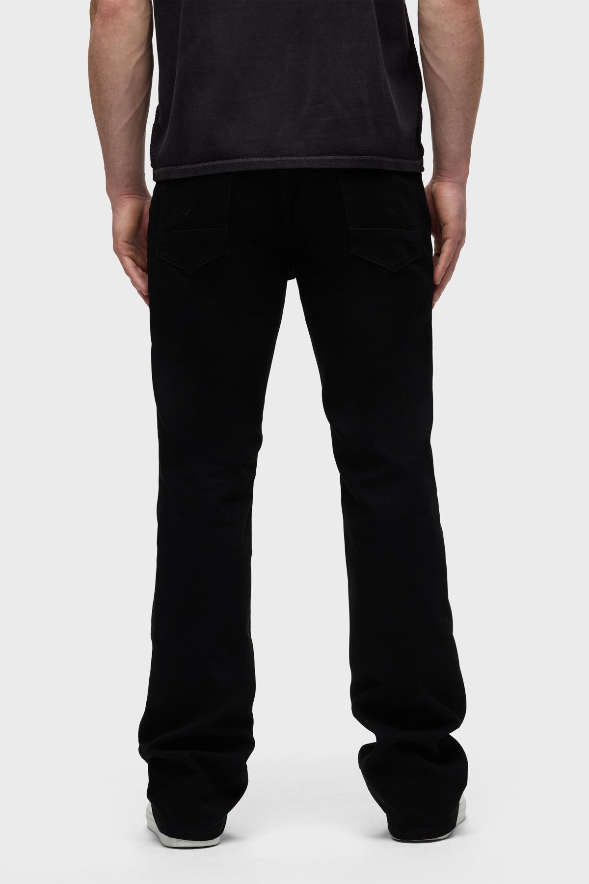 Our Walker Kick Flare is a mid-rise, slim through the hip and thigh with a flared bootcut hem. The black rinse Raven wash is finished with matte black hardware and black leather back patch. -