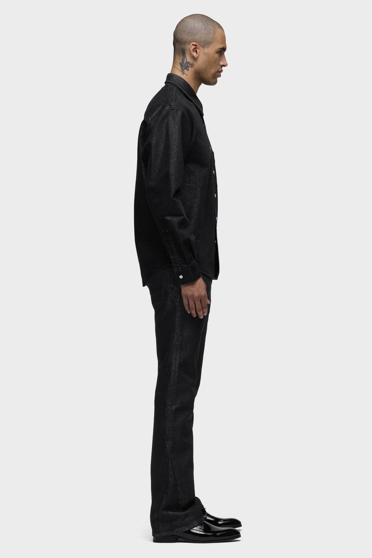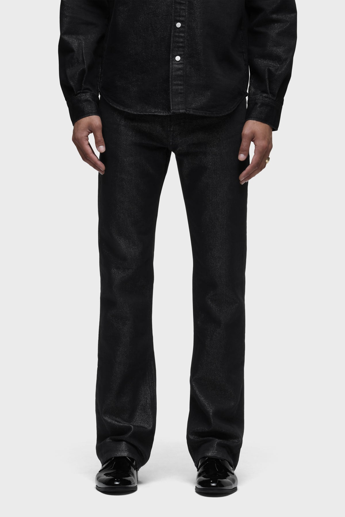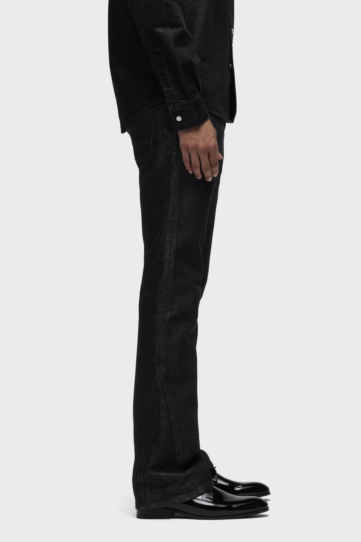 Our Walker Kick Flare Jean in Stargazer has a mid-rise and slim fit through the hip and thigh with a flared bootcut hem. It is cut from black comfort stretch denim woven with silver Lurex for a subtle shimmer. This pair is finished with classic five-pocket detailing and side seams. Pair it with the coordinating Long Sleeve Shirt for a sleek set. -