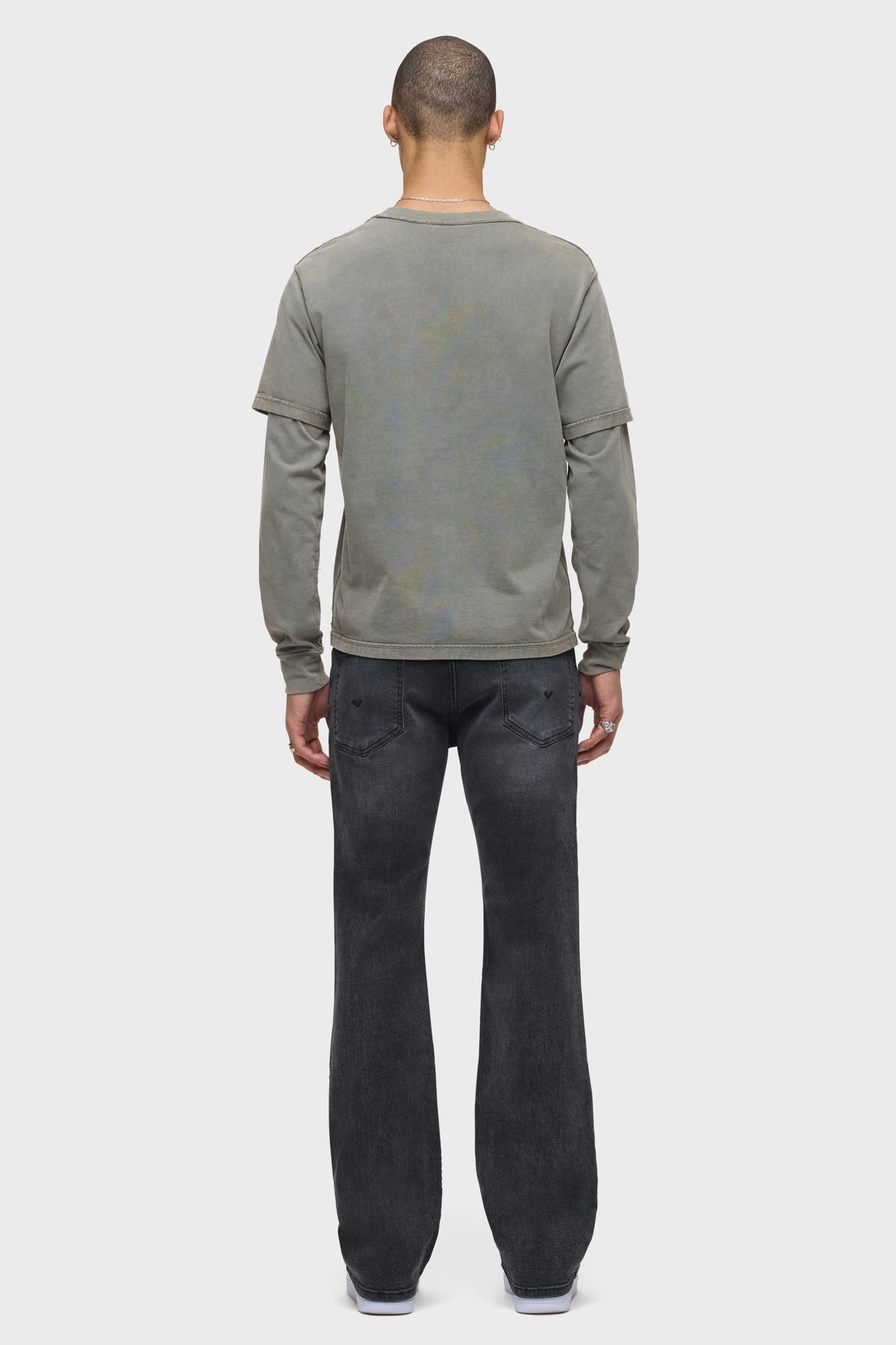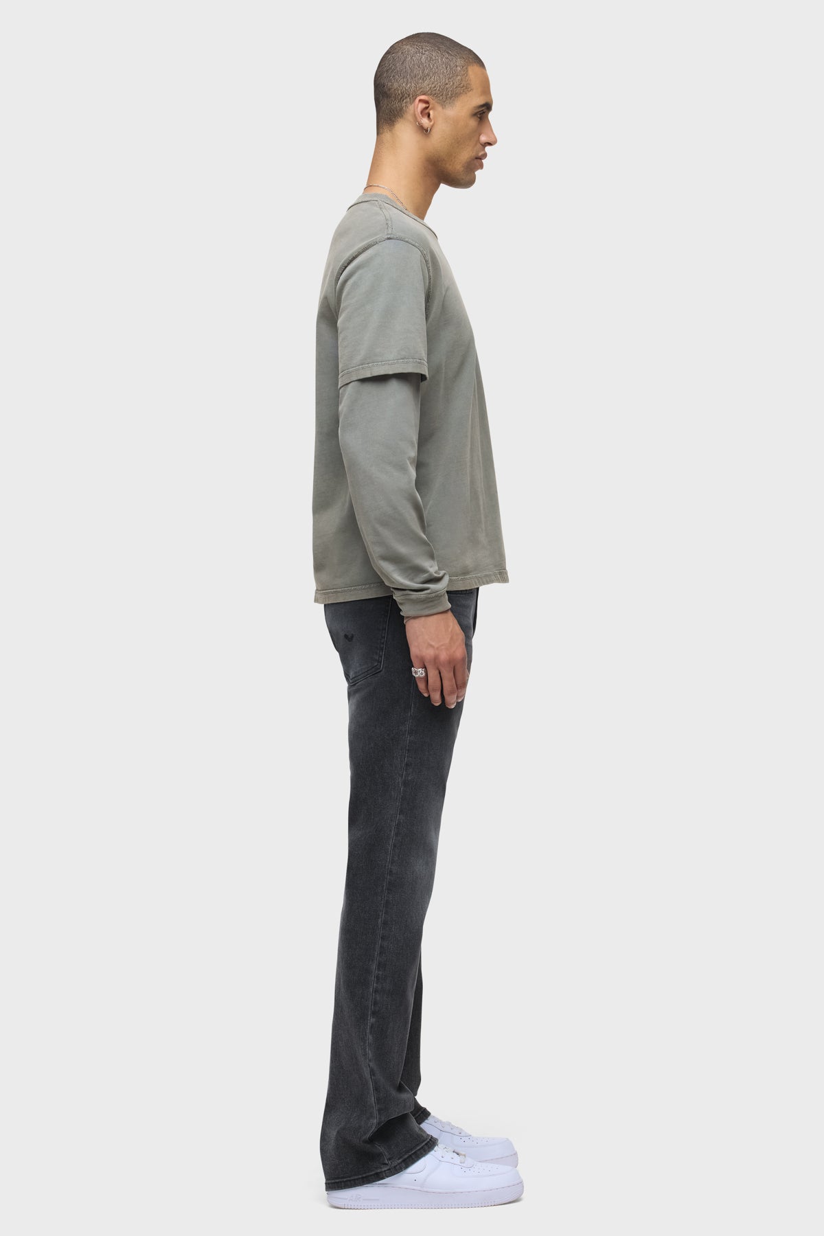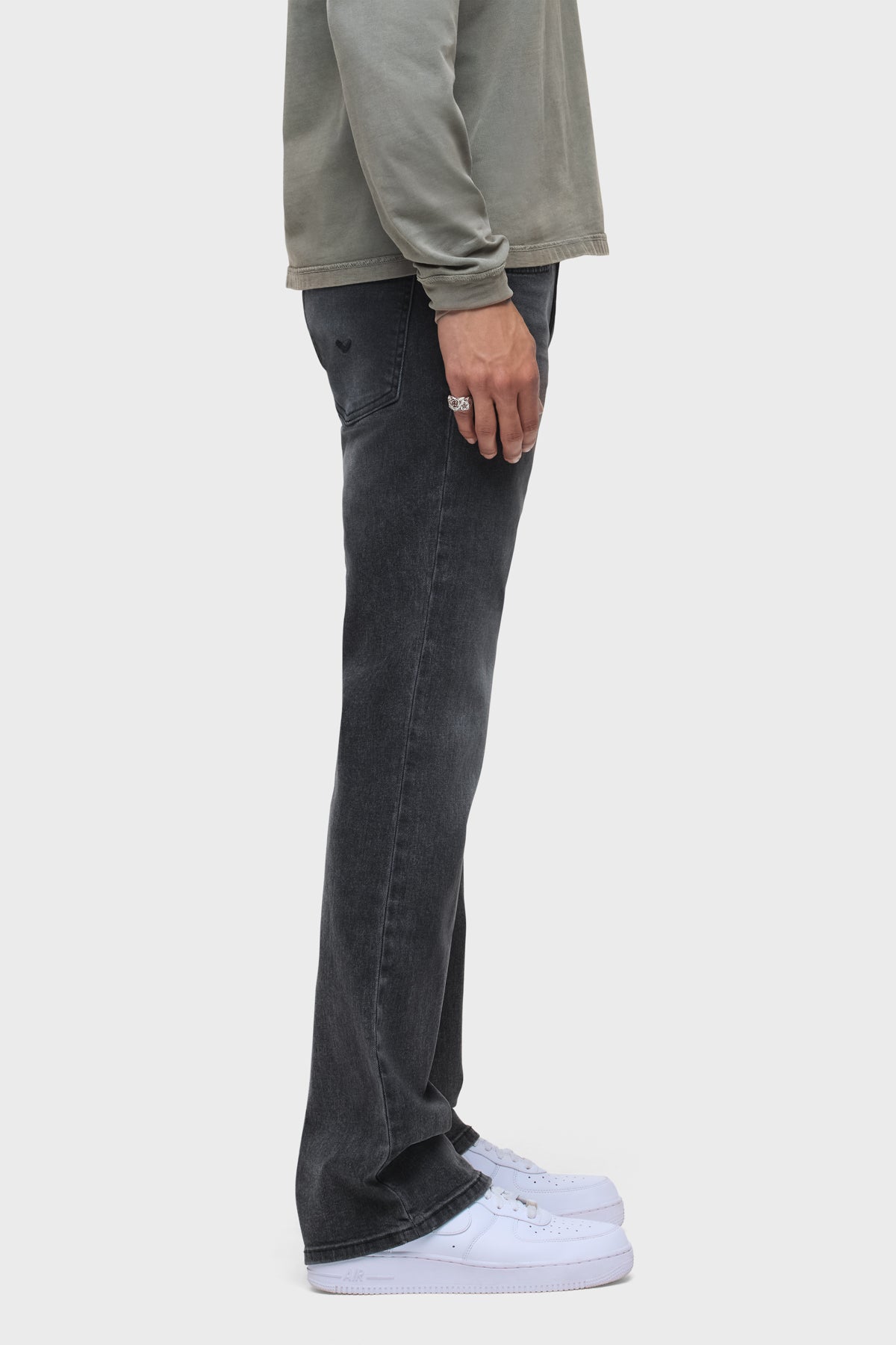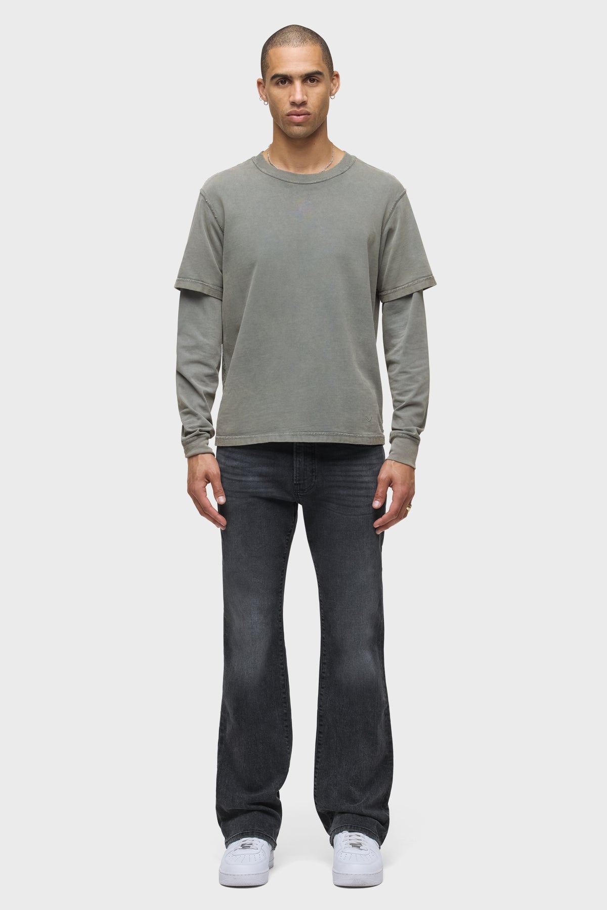 Our Walker Kick Flare Jean has a mid-rise and slim fit through the hip and thigh with a flared bootcut hem. This pair is finished with classic five-pocket detailing and side seams. -