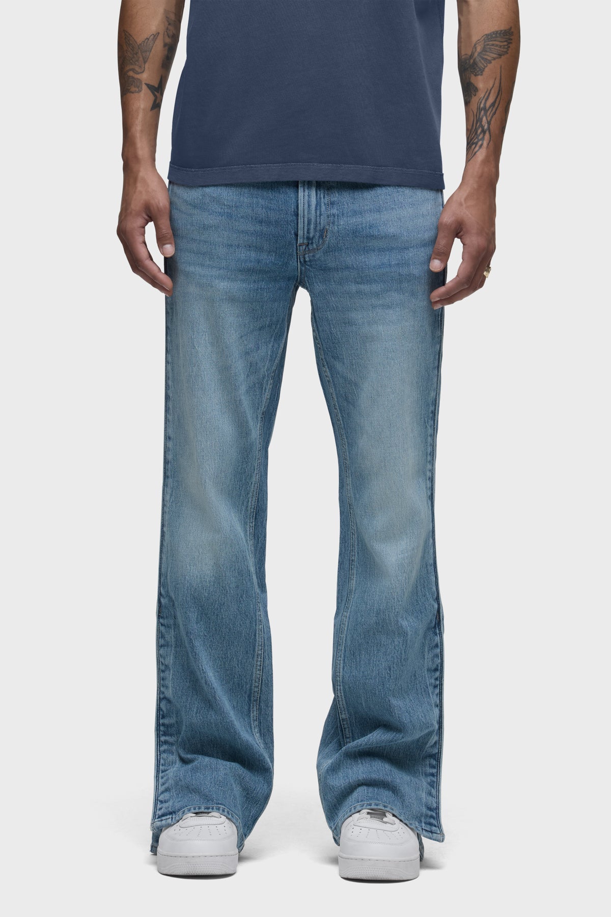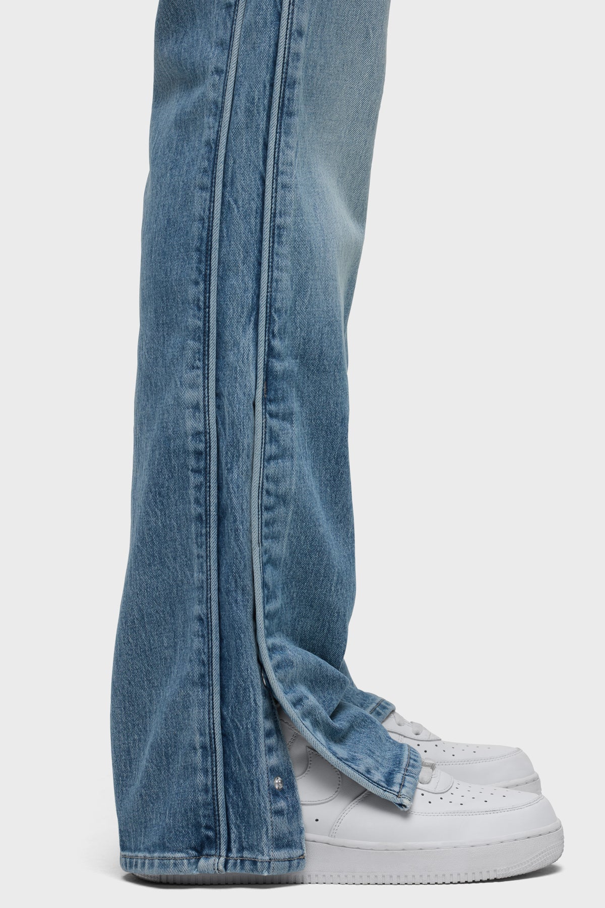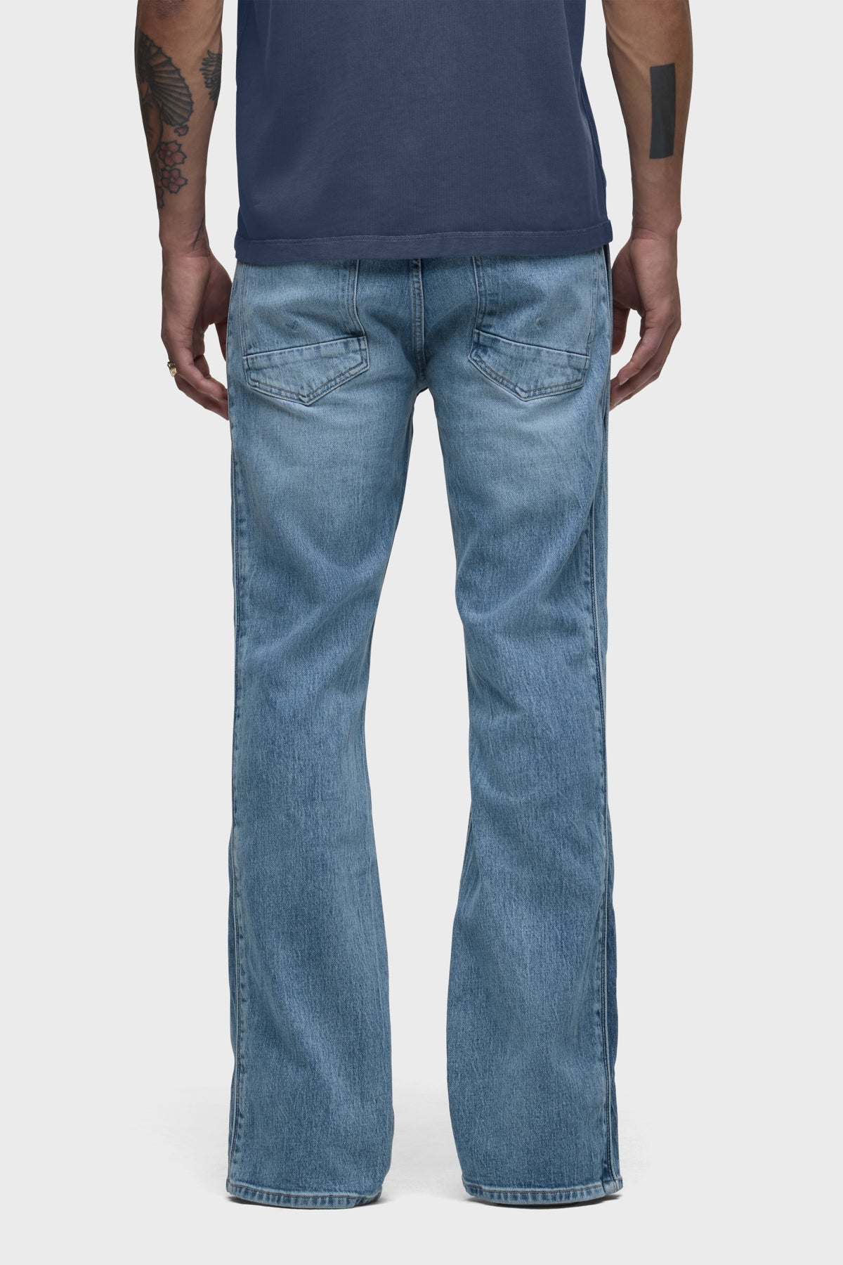 Our Walker Track Jean is an easy, mid-rise fit with a flared bootcut hem and track-inspired details. Cut from premium comfort stretch denim, it features Henderson, a light indigo wash. This pair is finished with side-seam panels, contrast piping details, hidden hem snaps and classic five-pocket detailing. -