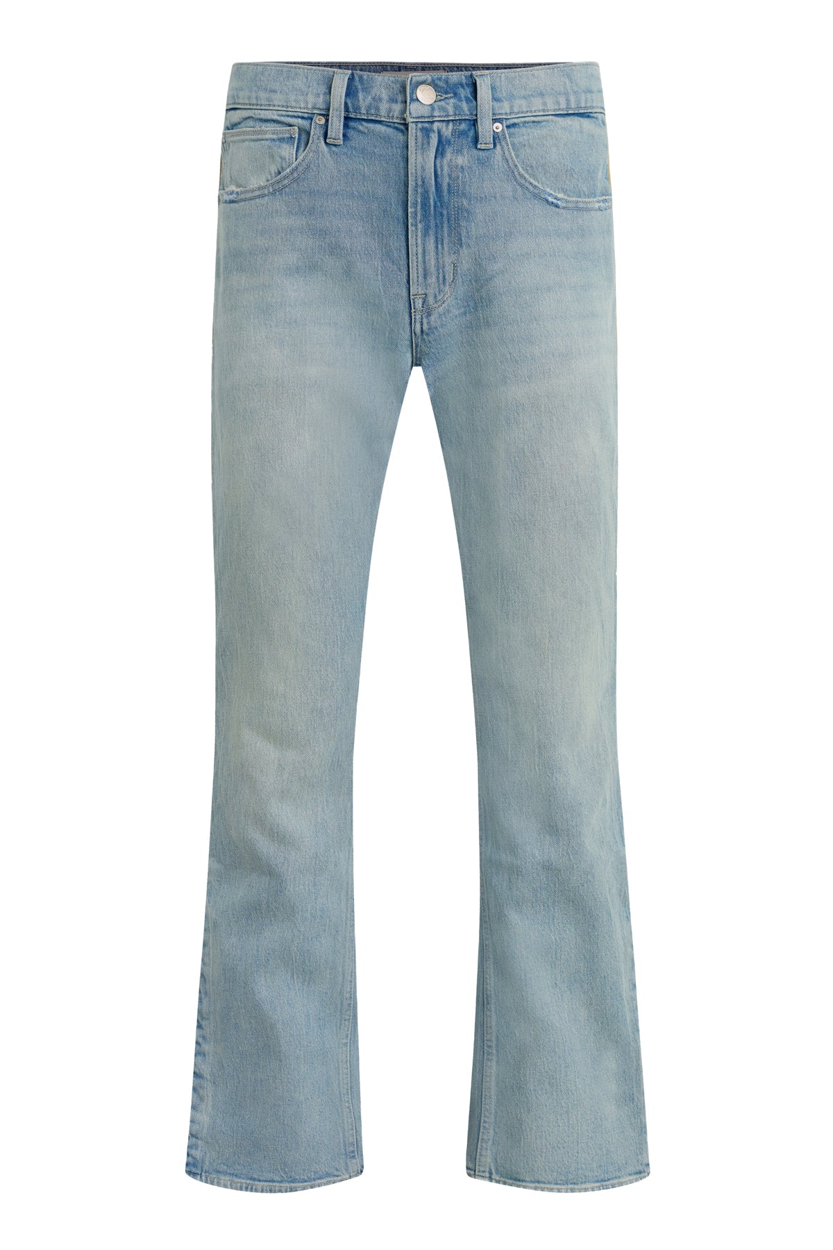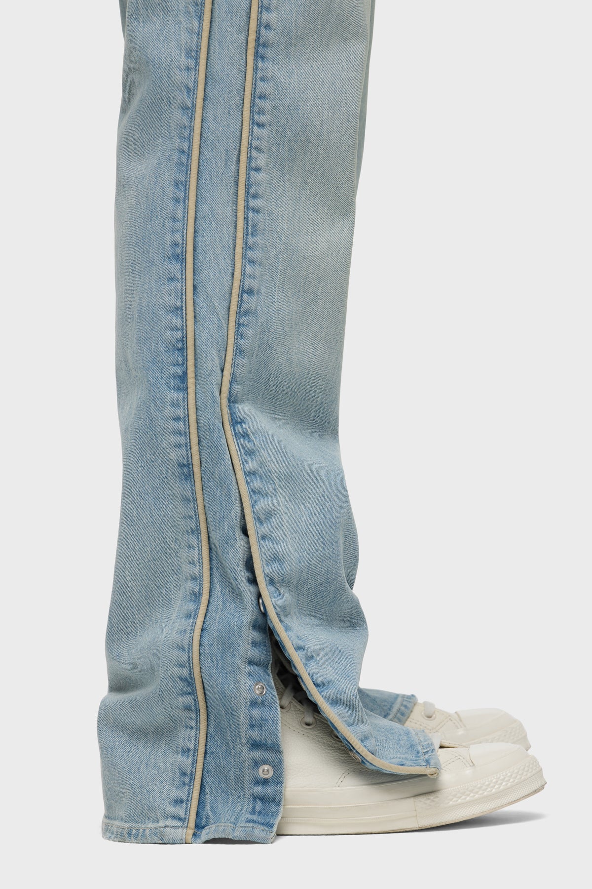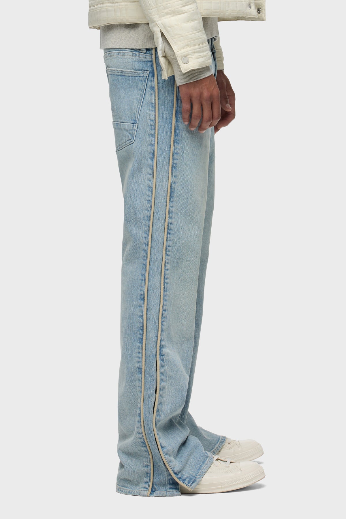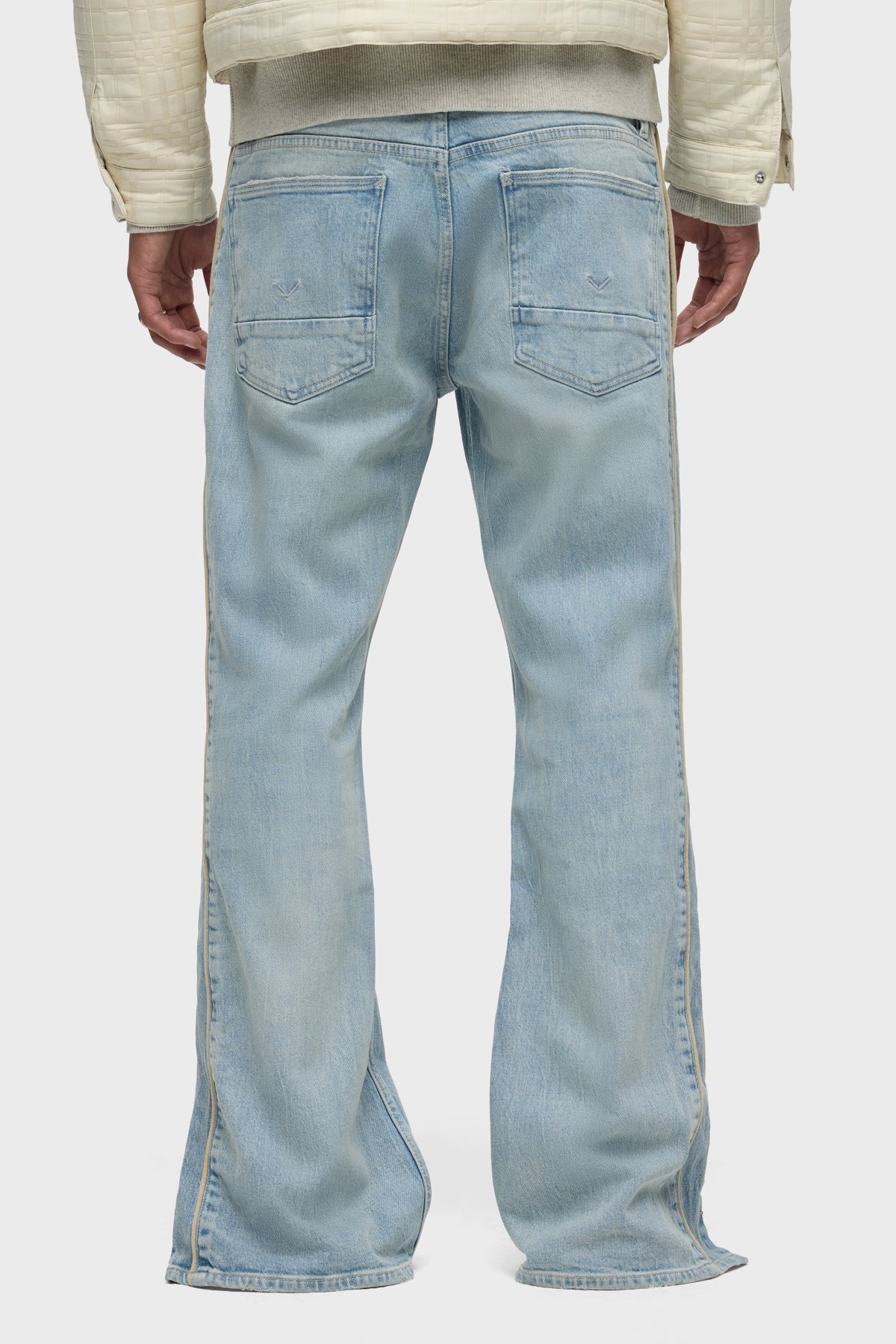 Our Walker Track is an easy, mid-rise fit with a flared bootcut hem and track-inspired details. Cut from premium comfort stretch denim, the light wash Indigo Dusk has whiskering and heavy grinding along with edges with classic five-pocket construction, side seam panels and cream piping details. Finished with hidden hem snaps, dull nickel hardware and signature embroidery on back waistband. -