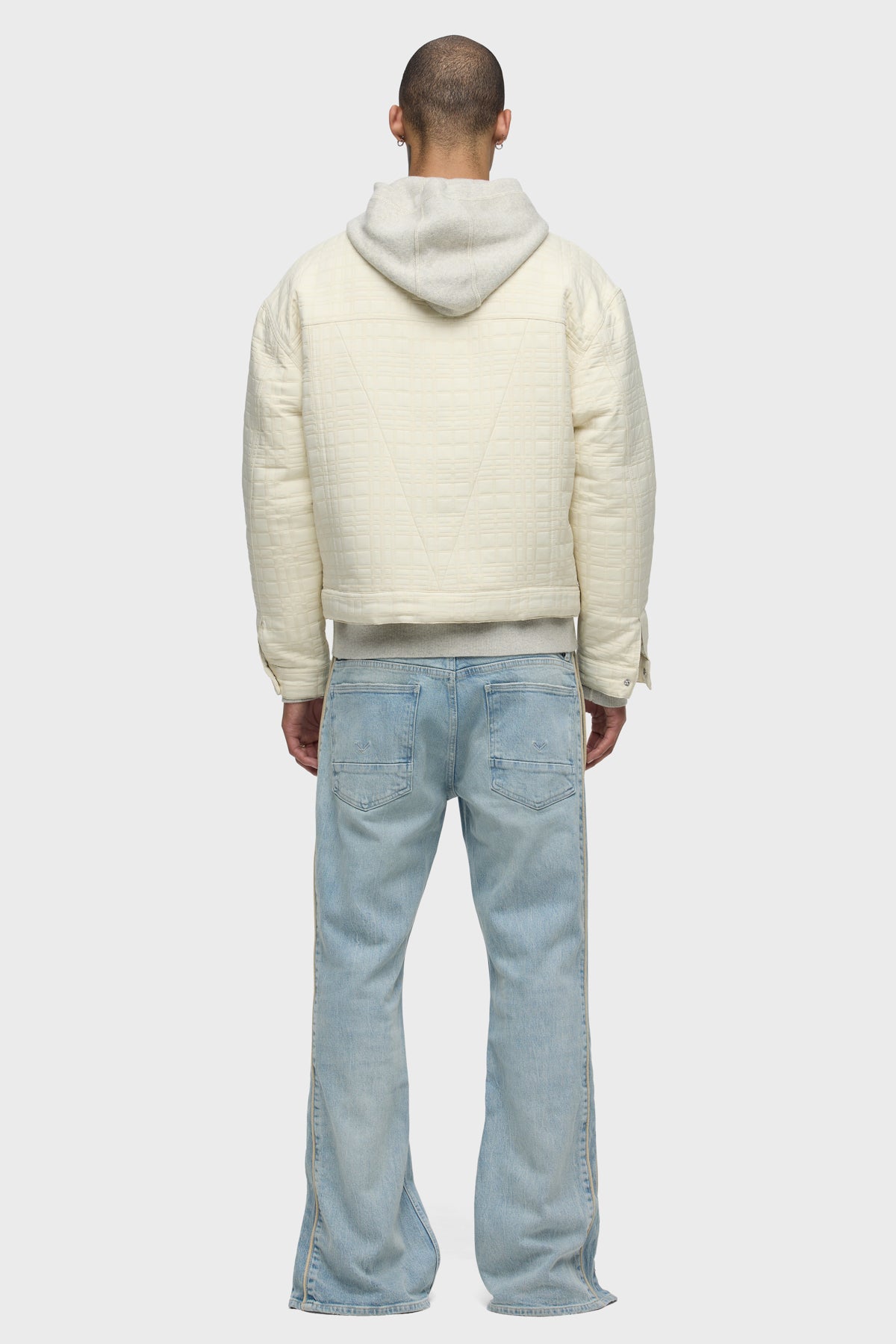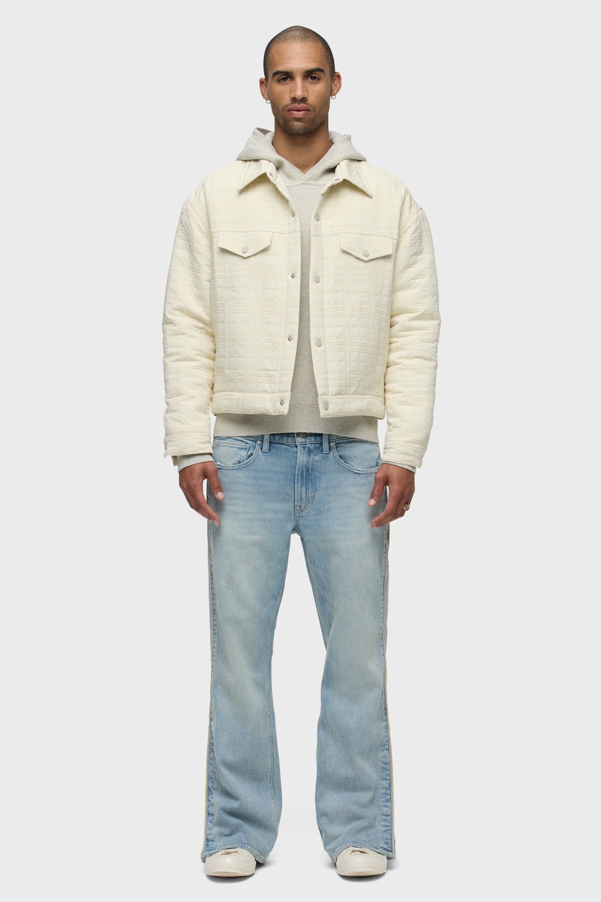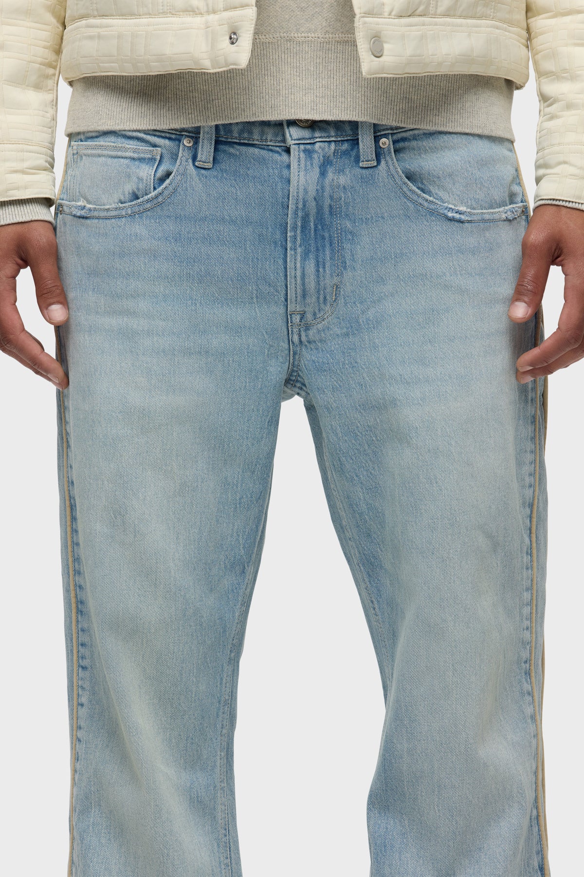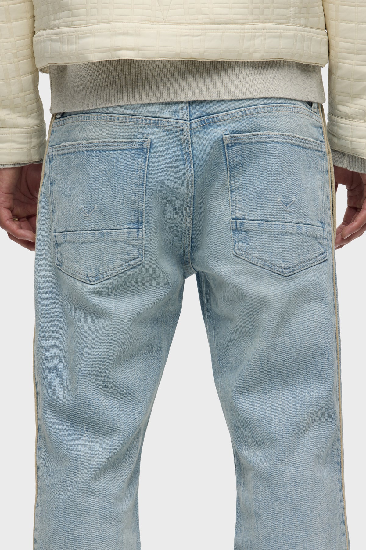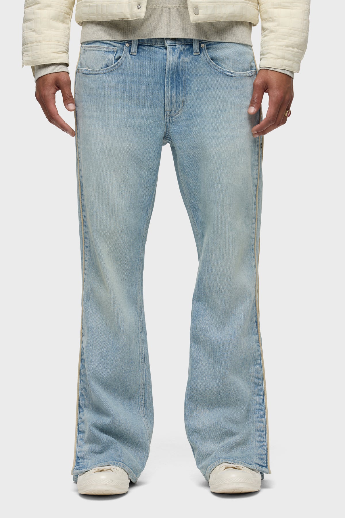 Our Walker Track is an easy, mid-rise fit with a flared bootcut hem and track-inspired details. Cut from premium comfort stretch denim, the light wash Indigo Dusk has whiskering and heavy grinding along with edges with classic five-pocket construction, side seam panels and cream piping details. Finished with hidden hem snaps, dull nickel hardware and signature embroidery on back waistband. -