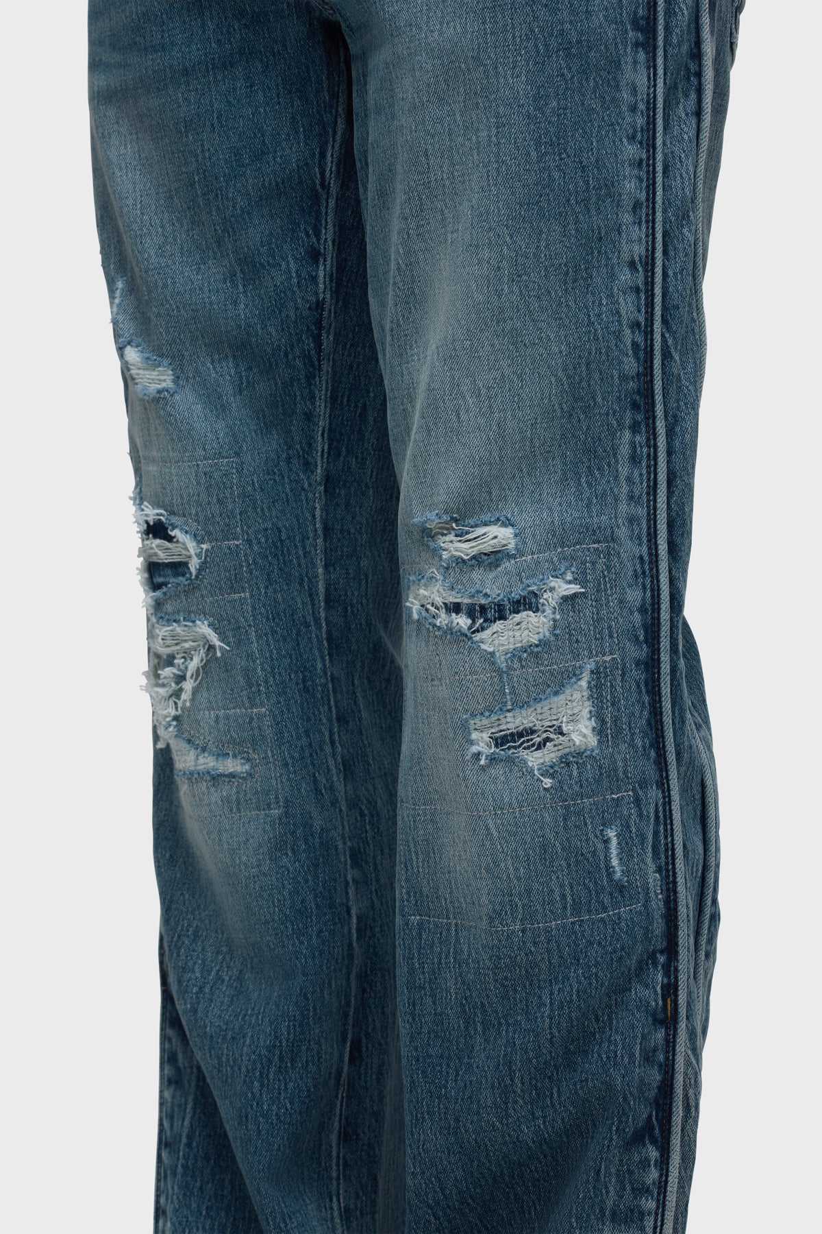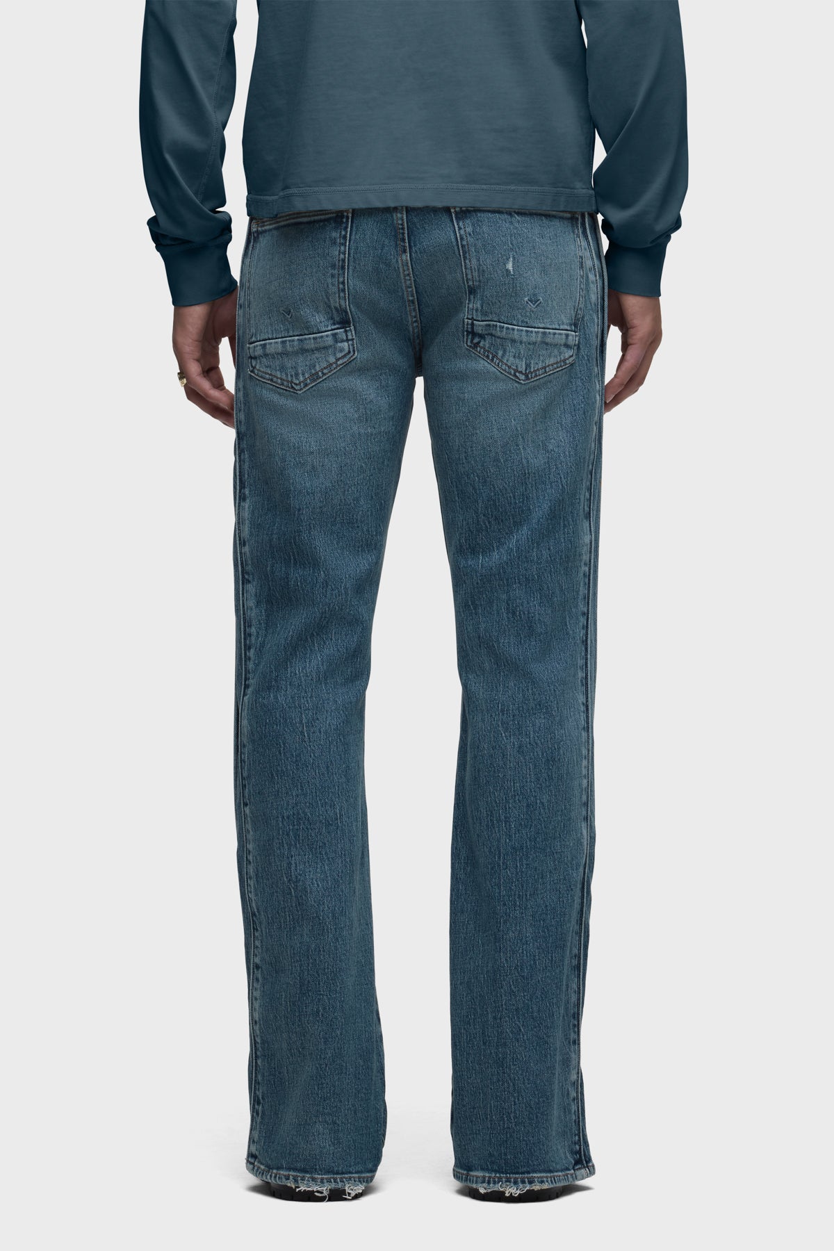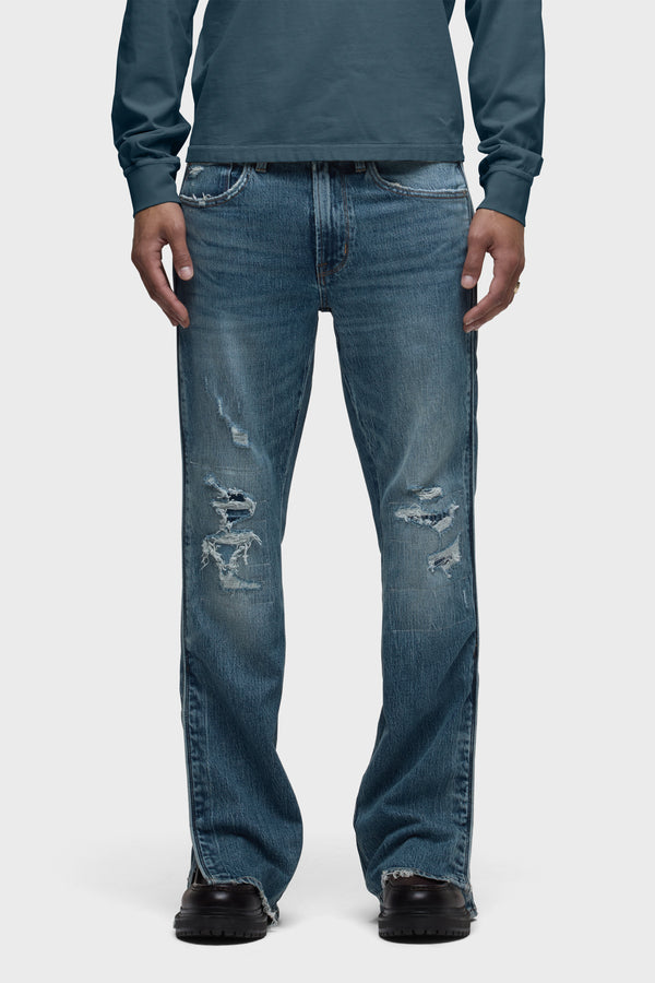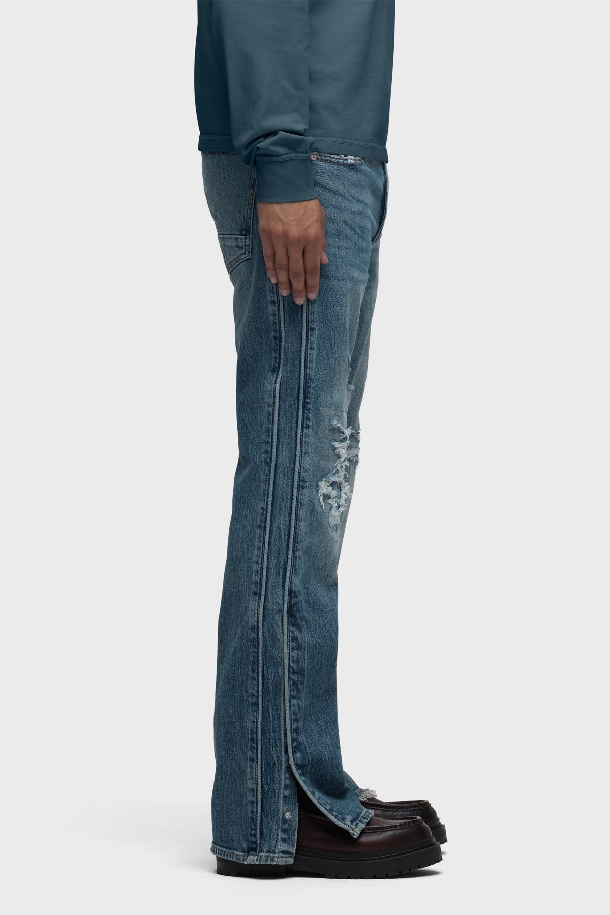 Our Walker Track Jean is an easy, mid-rise fit with a flared bootcut hem and track-inspired details. Cut from premium comfort stretch denim, it features Riverside, a medium-dark indigo wash. This pair is finished with side-seam panels, piping details, hidden hem snaps, destruction holes at both legs and classic five-pocket detailing. -