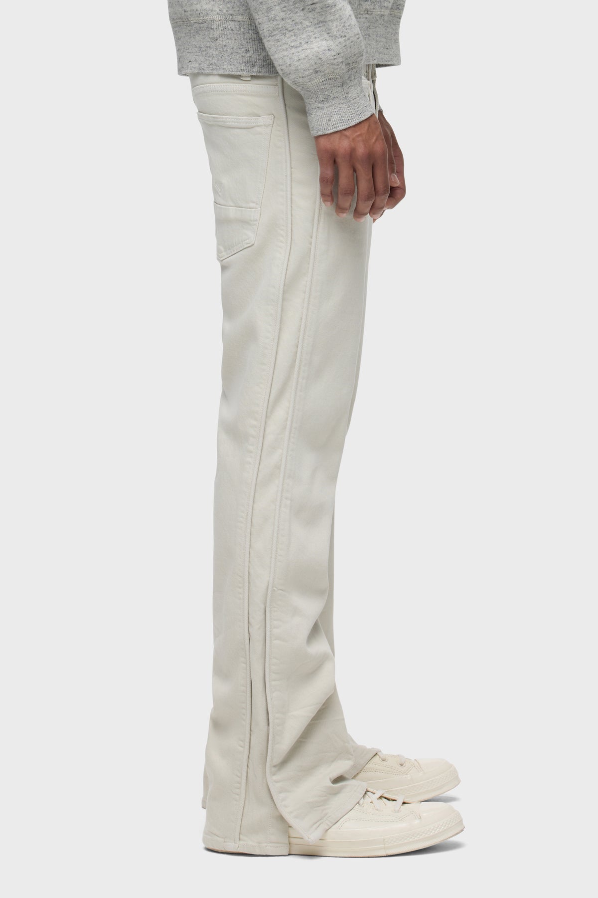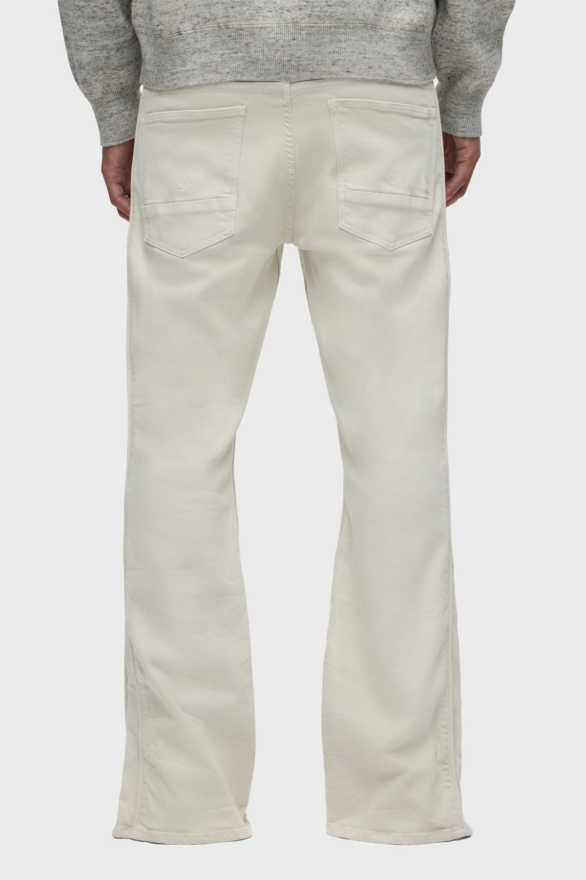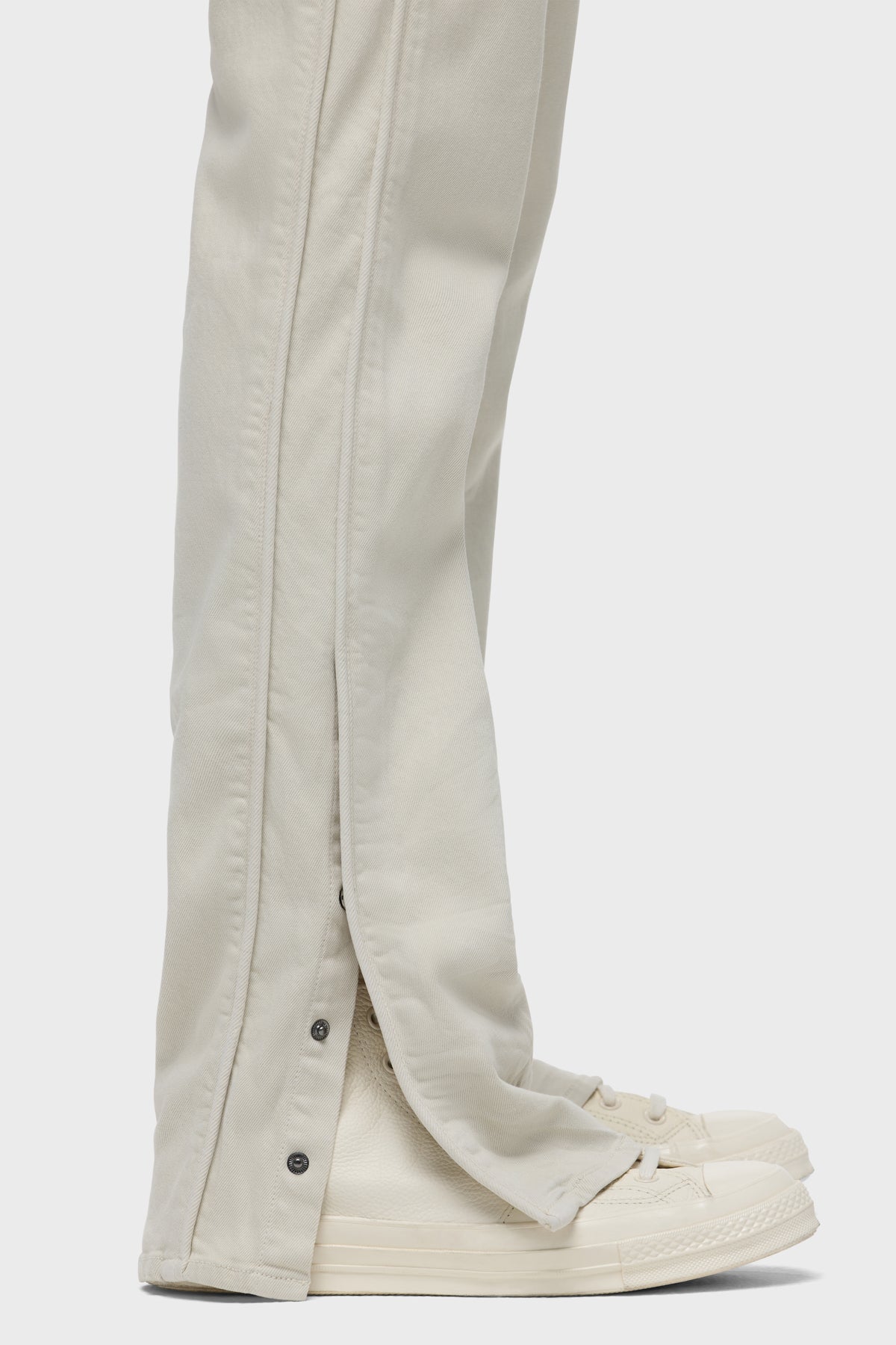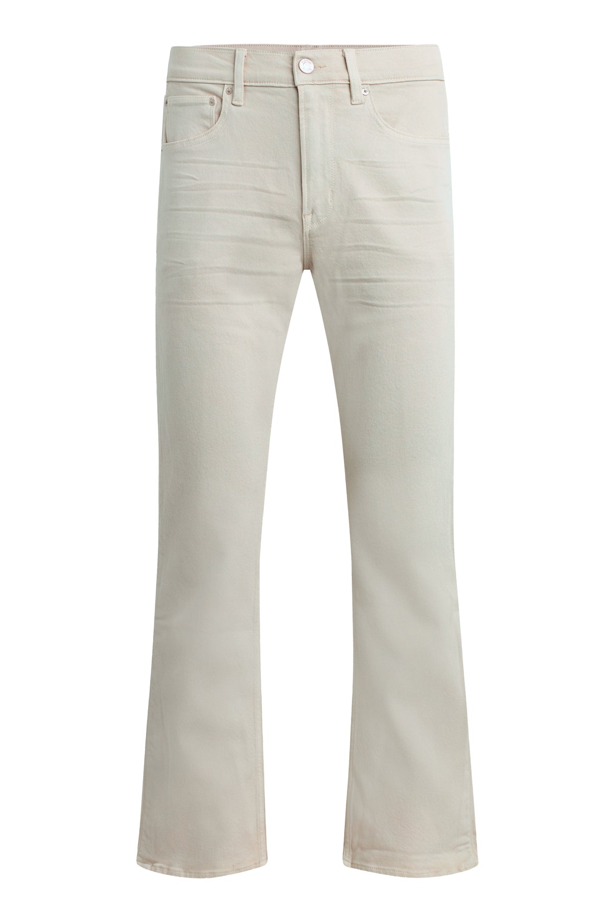 Our Walker Track is an easy, mid-rise fit with a flared bootcut hem and track-inspired details. Cut from comfort stretch twill, the overdyed cream Washed Oak has a subtle worn-in look with classic five-pocket construction, side seam panels and piping details. Finished with hidden hem snaps, grey hardware and signature embroidery on back waistband. -