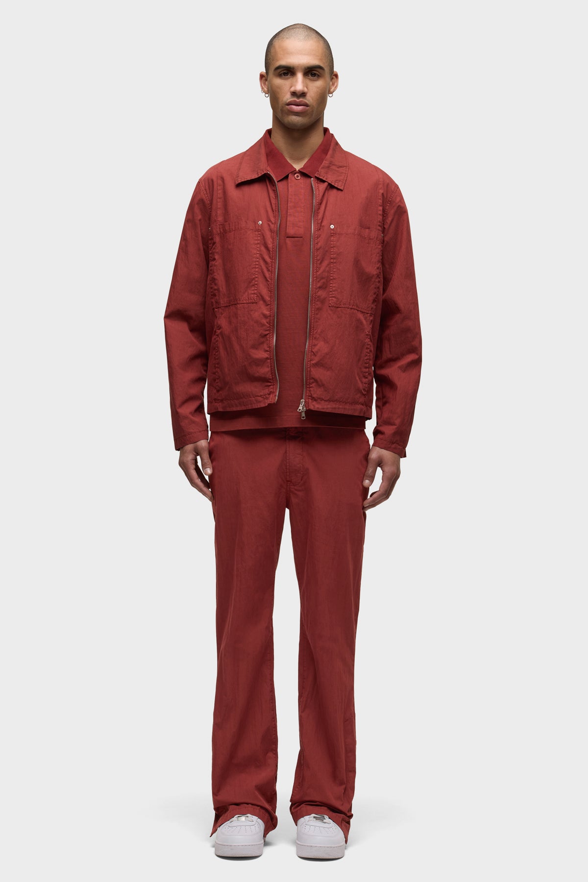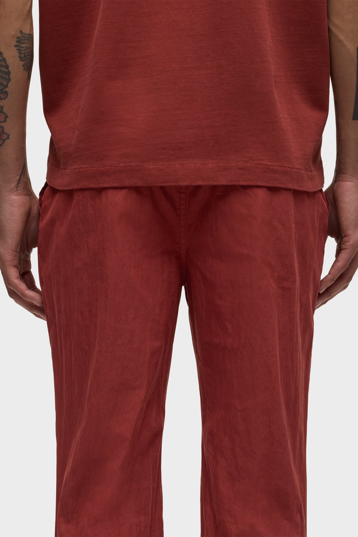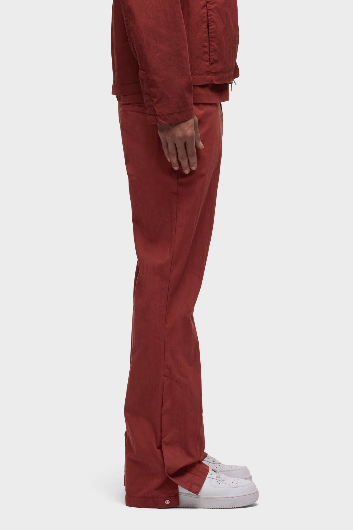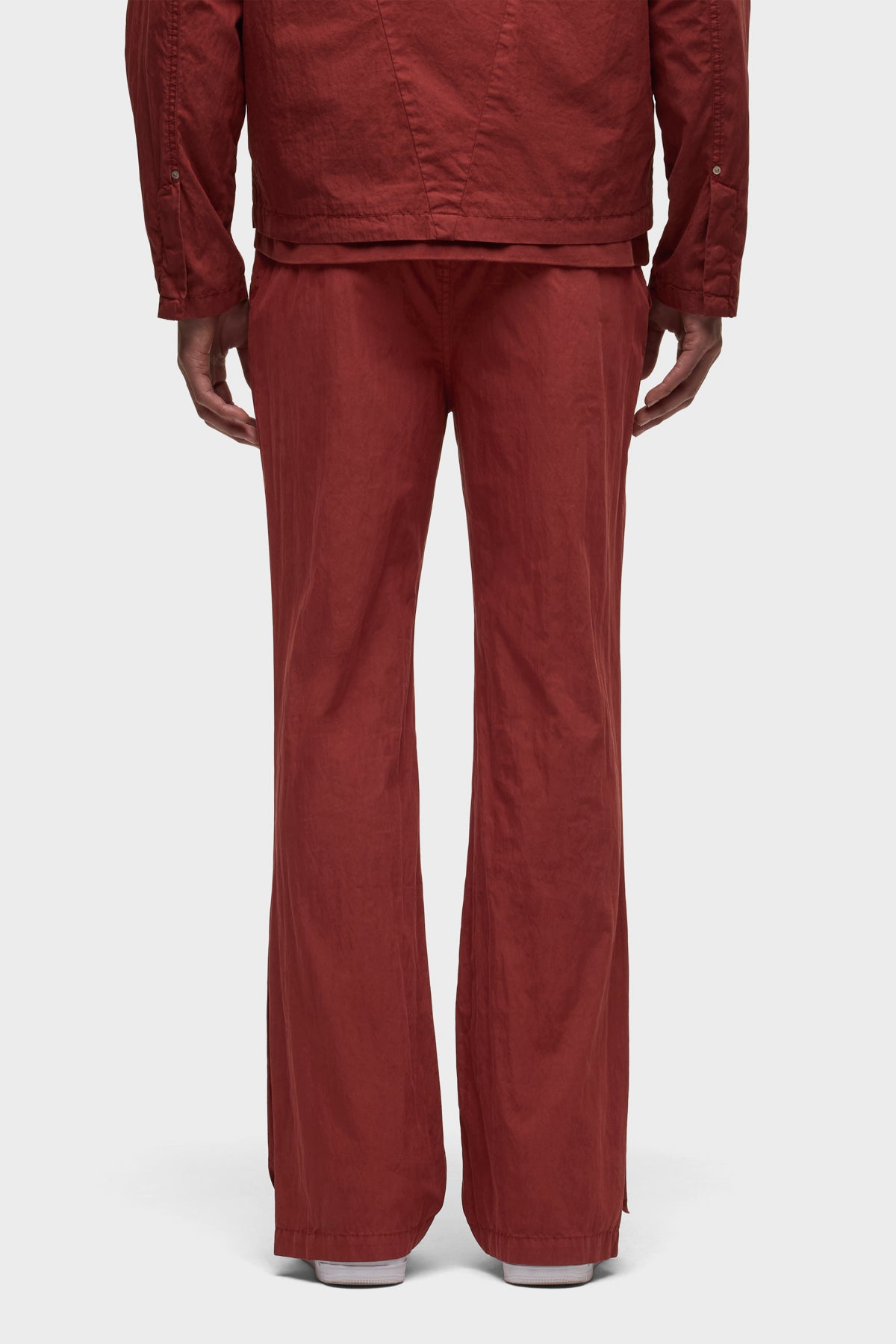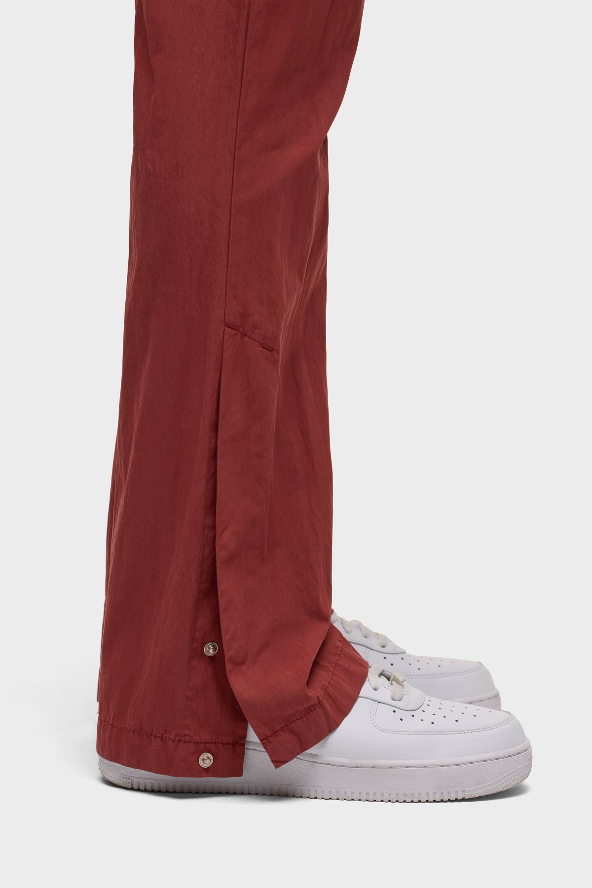 Our Walker Trouser Pant in Red Clay is an easy, mid-rise fit with a flared bootcut hem, track-inspired details, slash front pockets and back welt pockets. This pair is made of lightweight nylon in a reactive overdyed red color and finished with hidden hem snaps, a hook-and-eye closure, and our signature "V" embroidery above the wearer's right back pocket. -