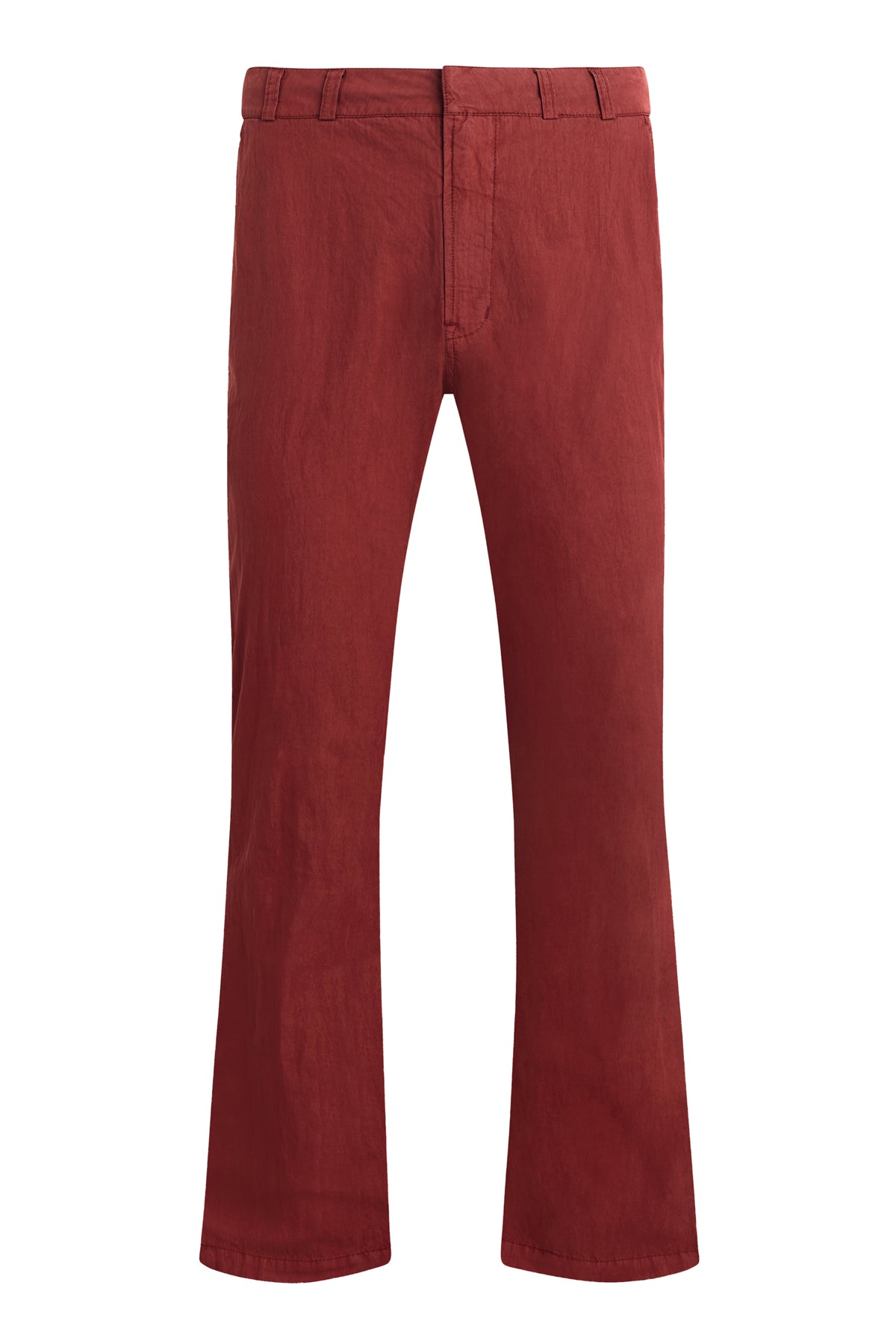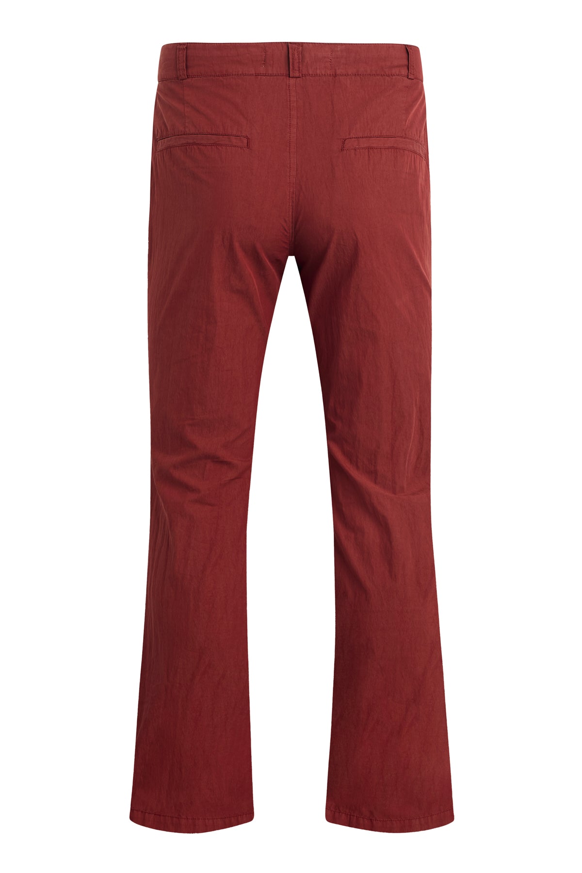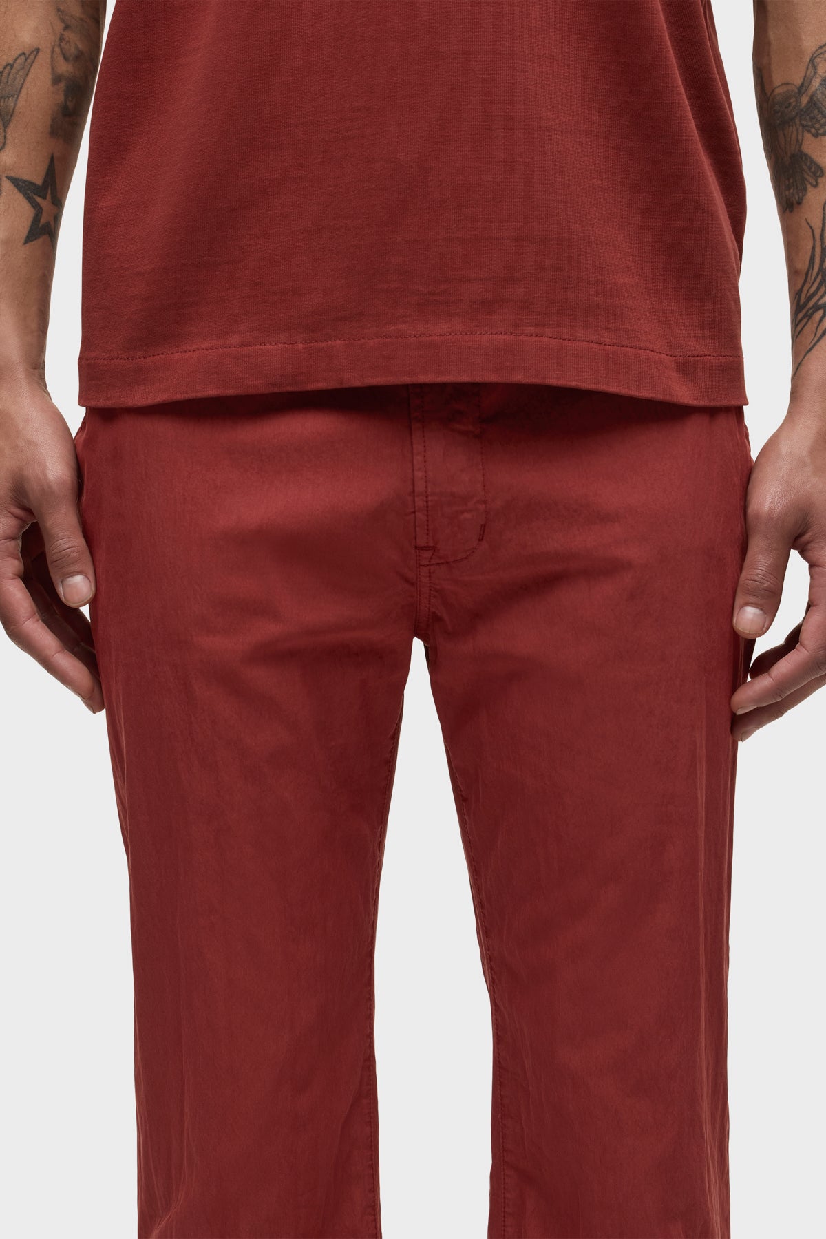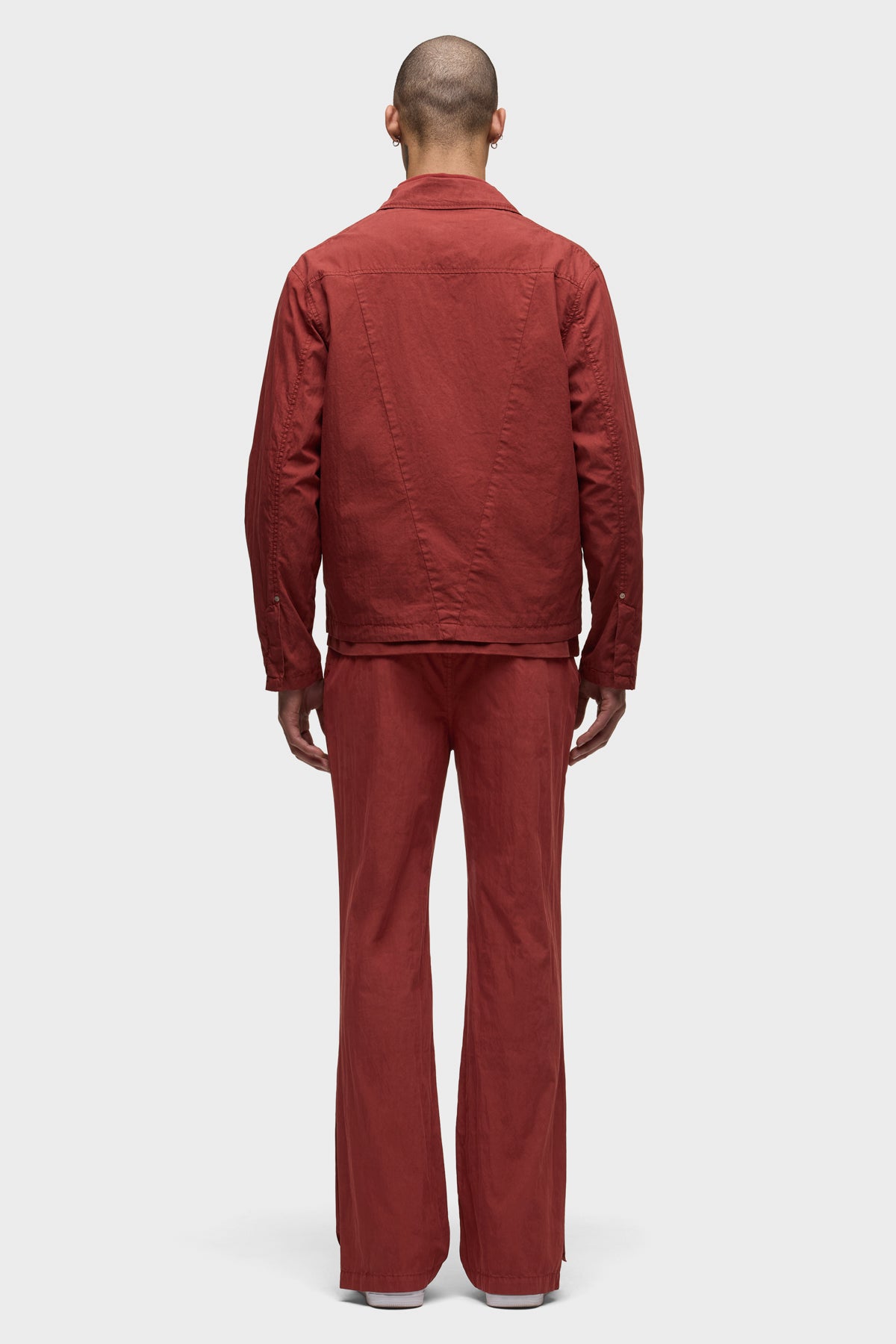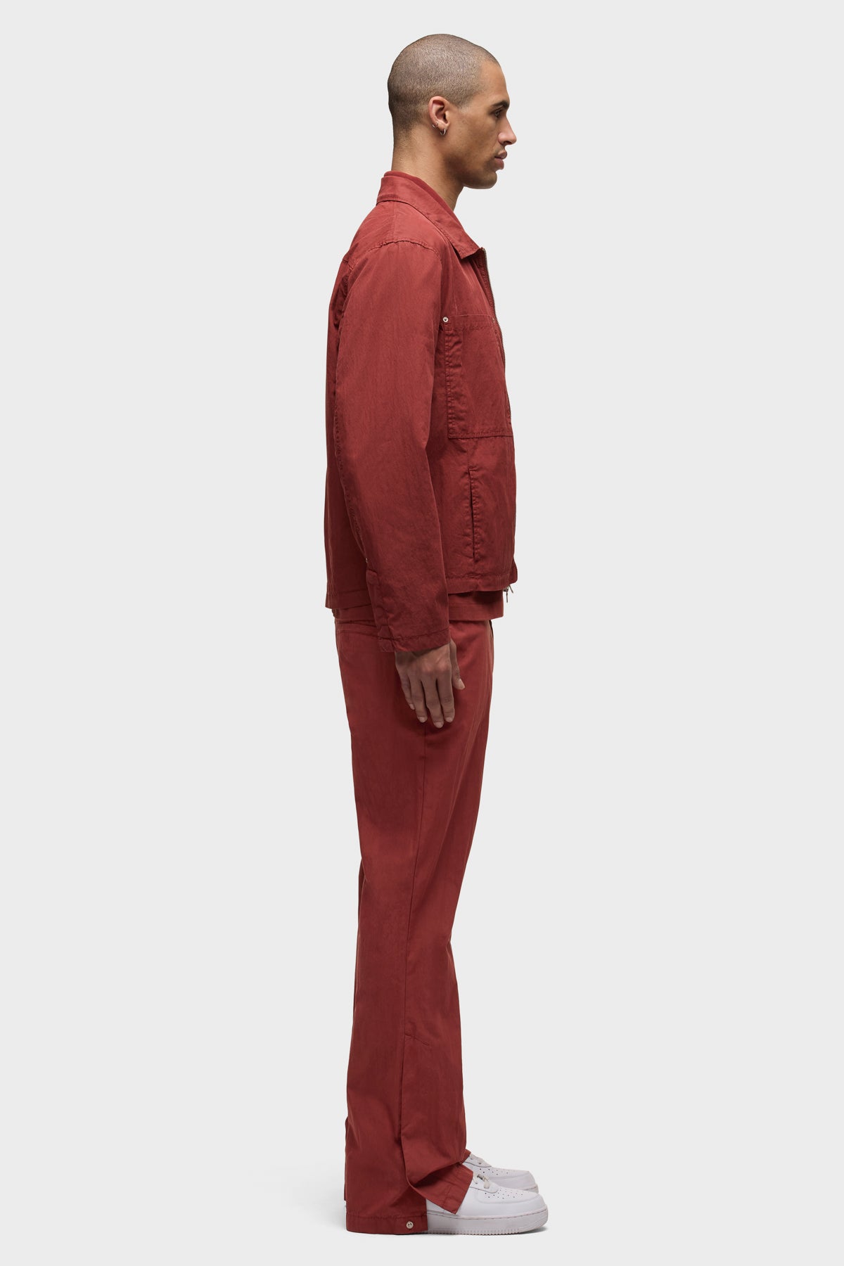 Our Walker Trouser Pant in Red Clay is an easy, mid-rise fit with a flared bootcut hem, track-inspired details, slash front pockets and back welt pockets. This pair is made of lightweight nylon in a reactive overdyed red color and finished with hidden hem snaps, a hook-and-eye closure, and our signature "V" embroidery above the wearer's right back pocket. -