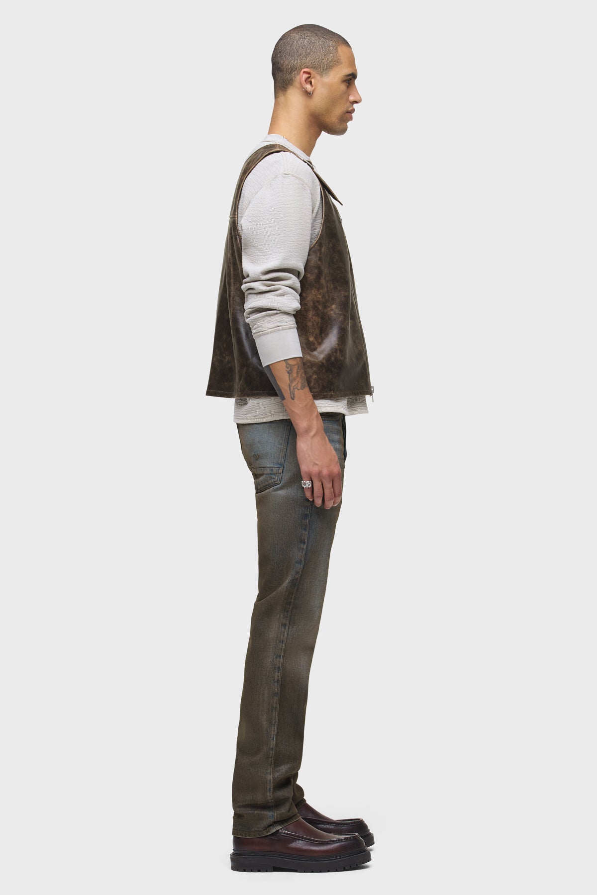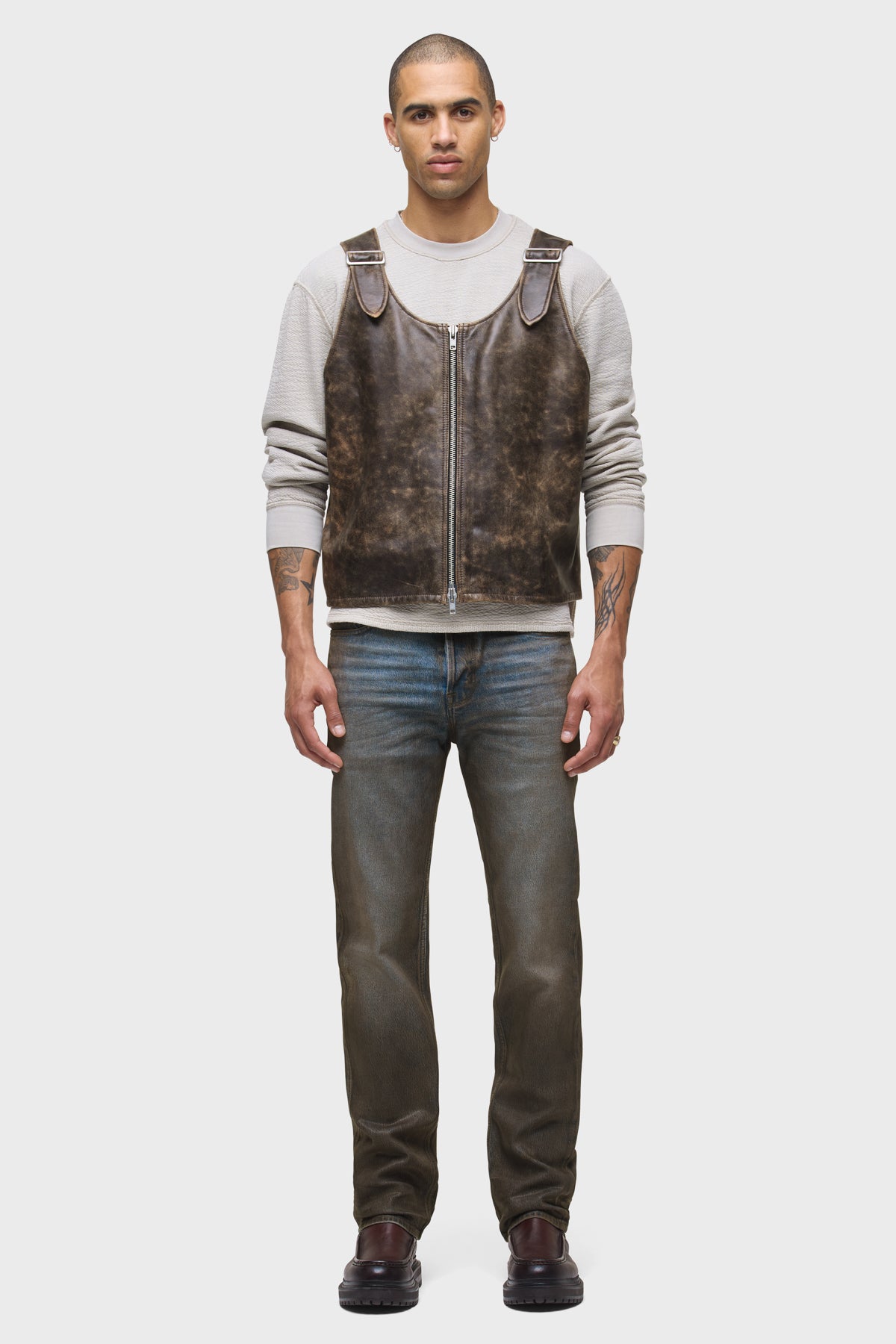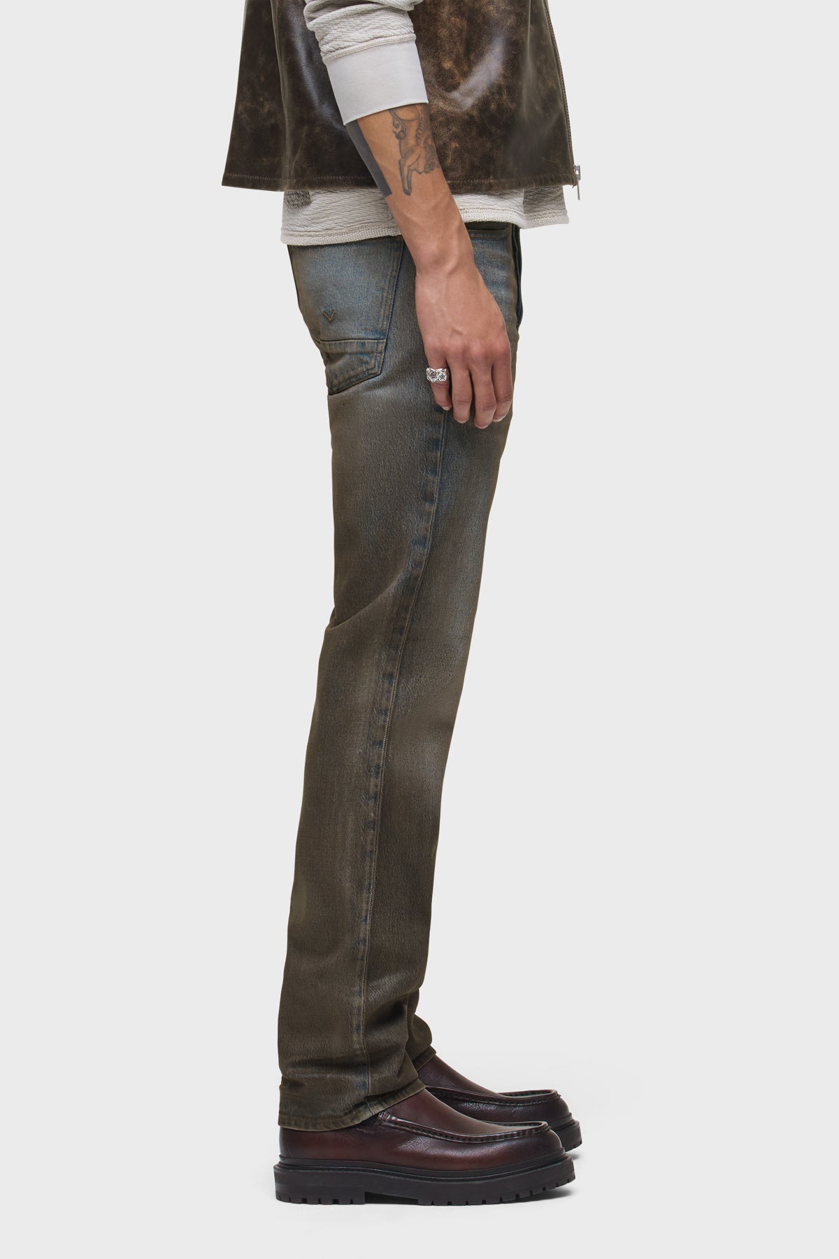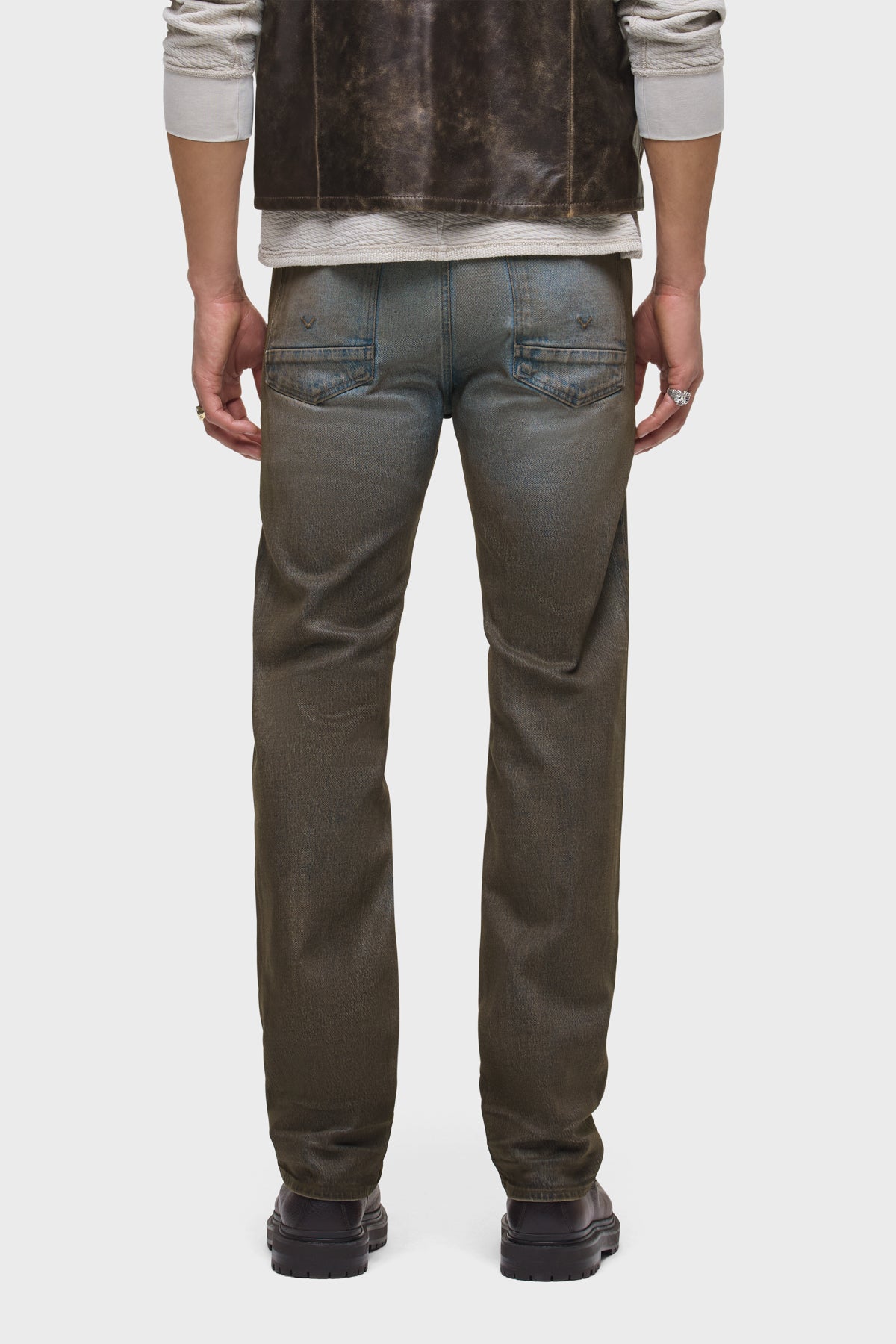 The Wes Classic Straight Leg Pant in Coated Chocolate is a mid-rise, easy straight leg that fits slim through the hip. Cut from premium comfort stretch denim, this pair features a medium, vintage-inspired wash with a dark brown base and mist coating for a subtle sheen and uneven pigmentation. -