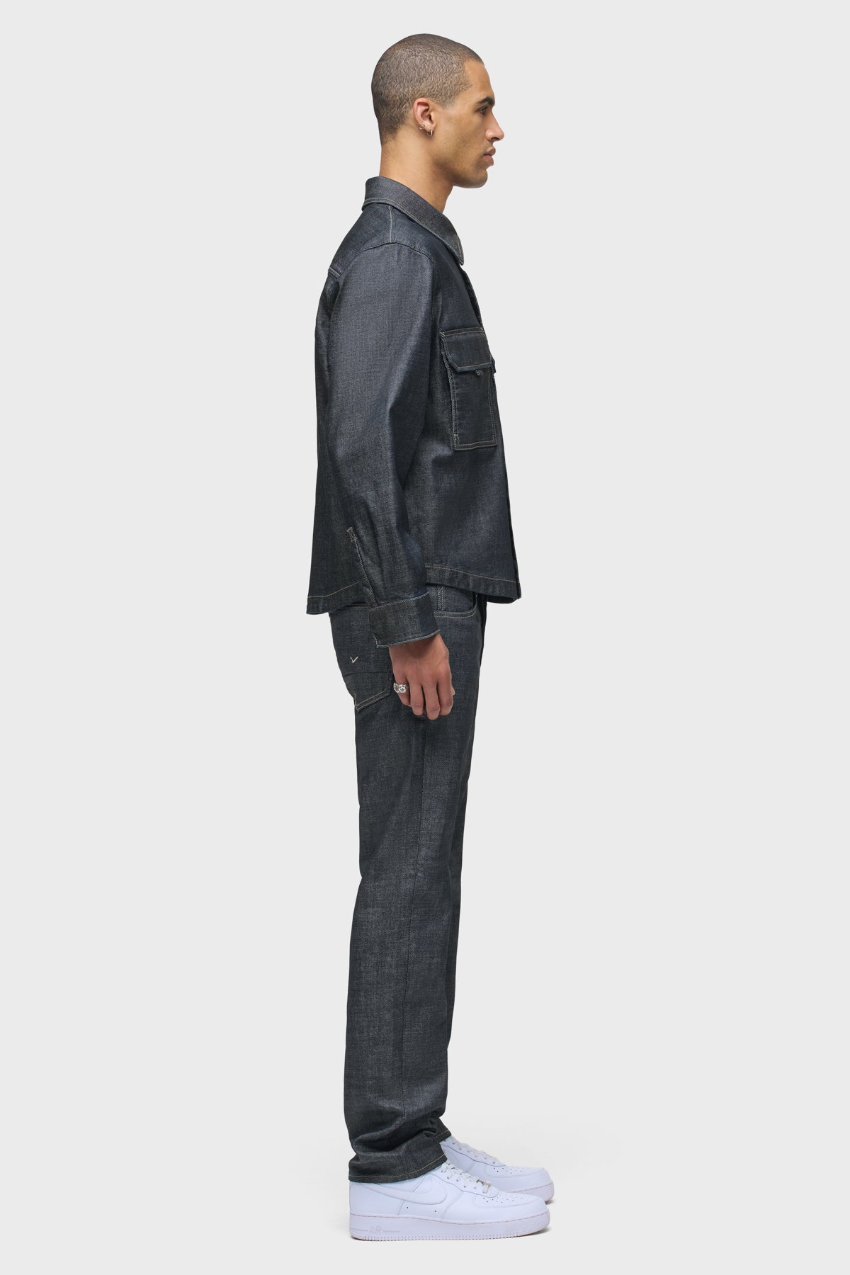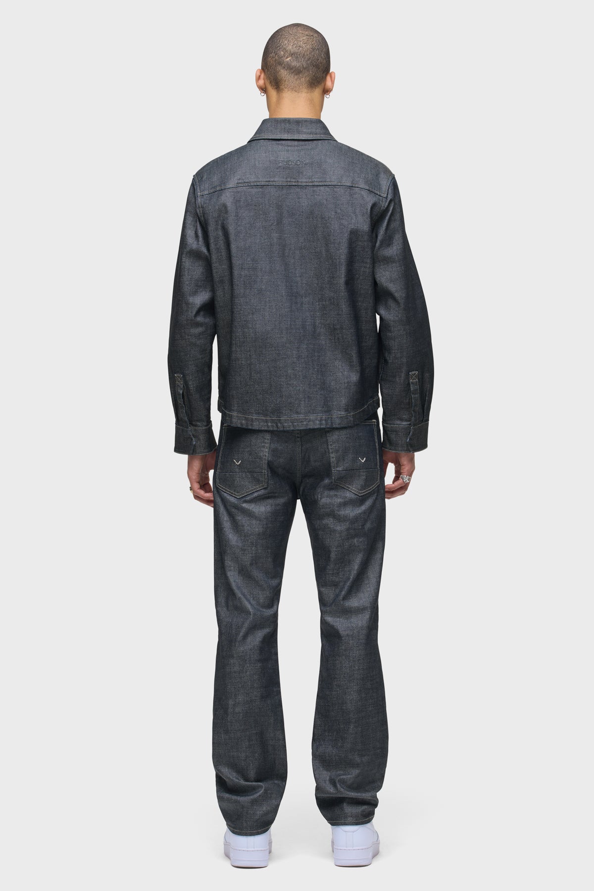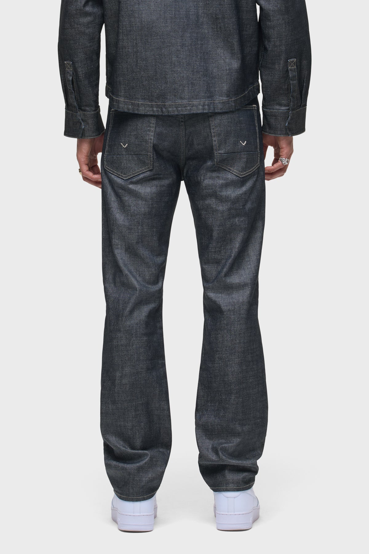 The Wes Classic Straight Leg Pant in Coated Gunmetal is a mid-rise, easy straight leg that fits slim through the hip in a pre-coated dark grey rinsed fabric for added shine and texture. -