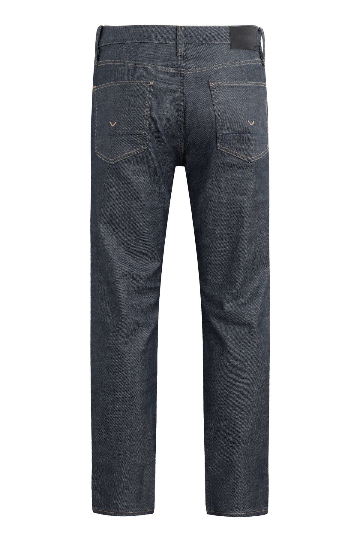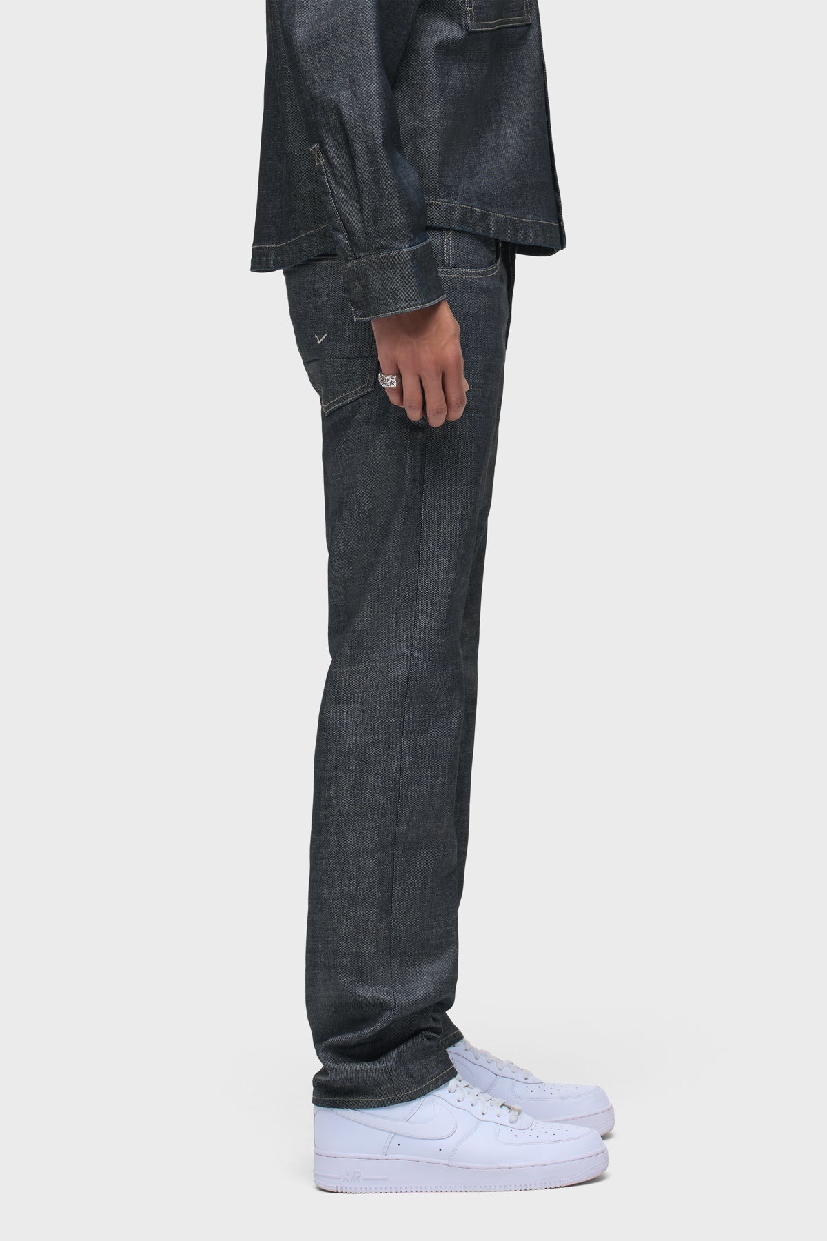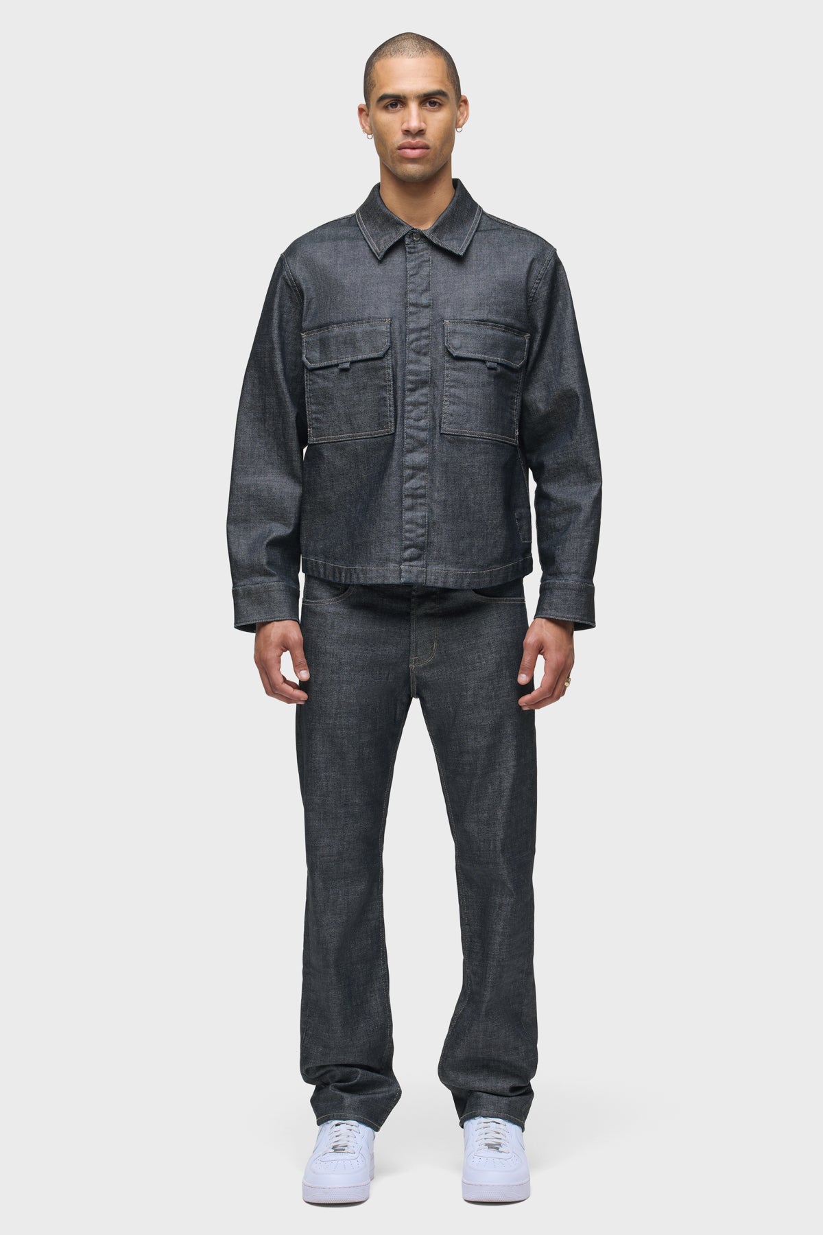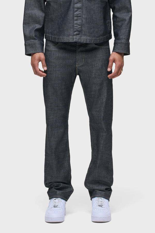 The Wes Classic Straight Leg Pant in Coated Gunmetal is a mid-rise, easy straight leg that fits slim through the hip in a pre-coated dark grey rinsed fabric for added shine and texture. -