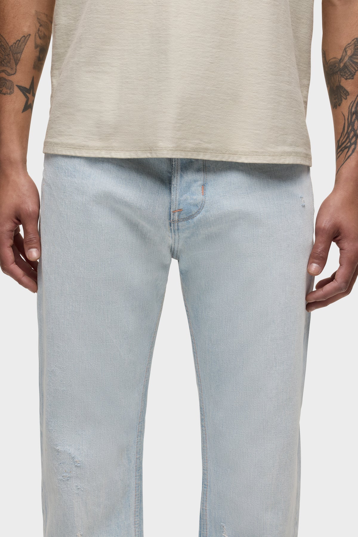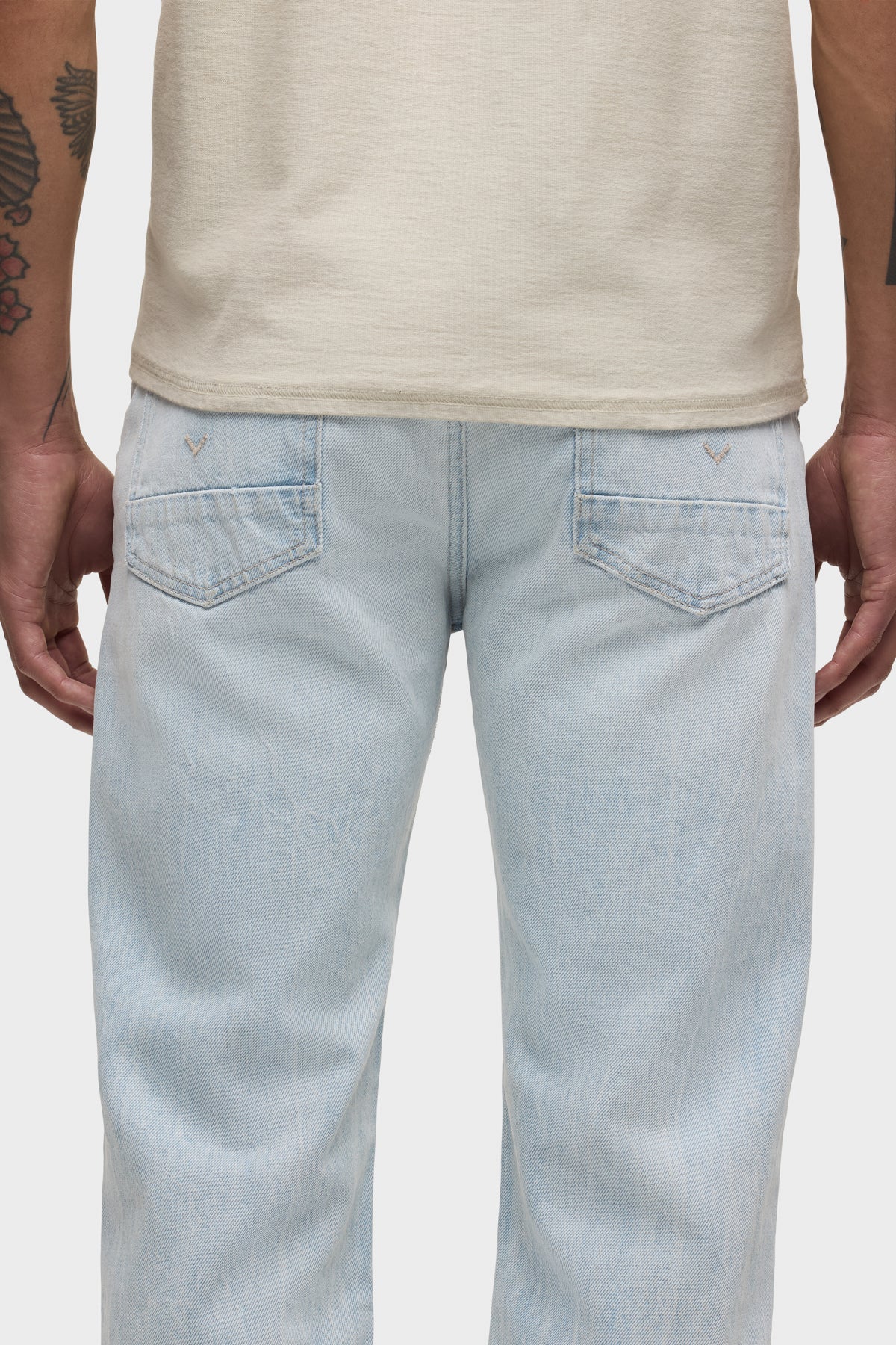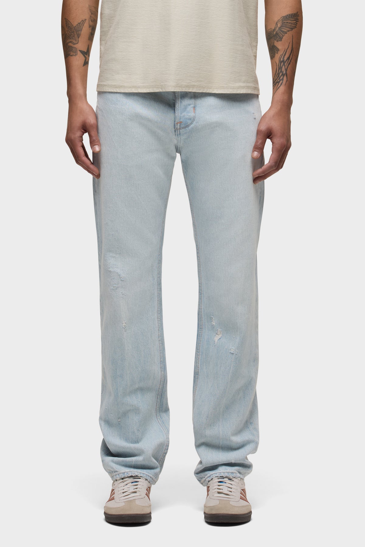 The Wes Classic Straight Leg Jean is a mid-rise, easy straight leg that fits slim through the hip. The super light indigo wash, Illusion Blue, is finished with heavy stone washing, bleaching, all-over subtle veining, whiskering, destruction and subtle pigment splatter. This pair is made of rigid denim with classic five-pocket detailing, contrast topstitching, black bright-copper hardware and a white leather back patch. -