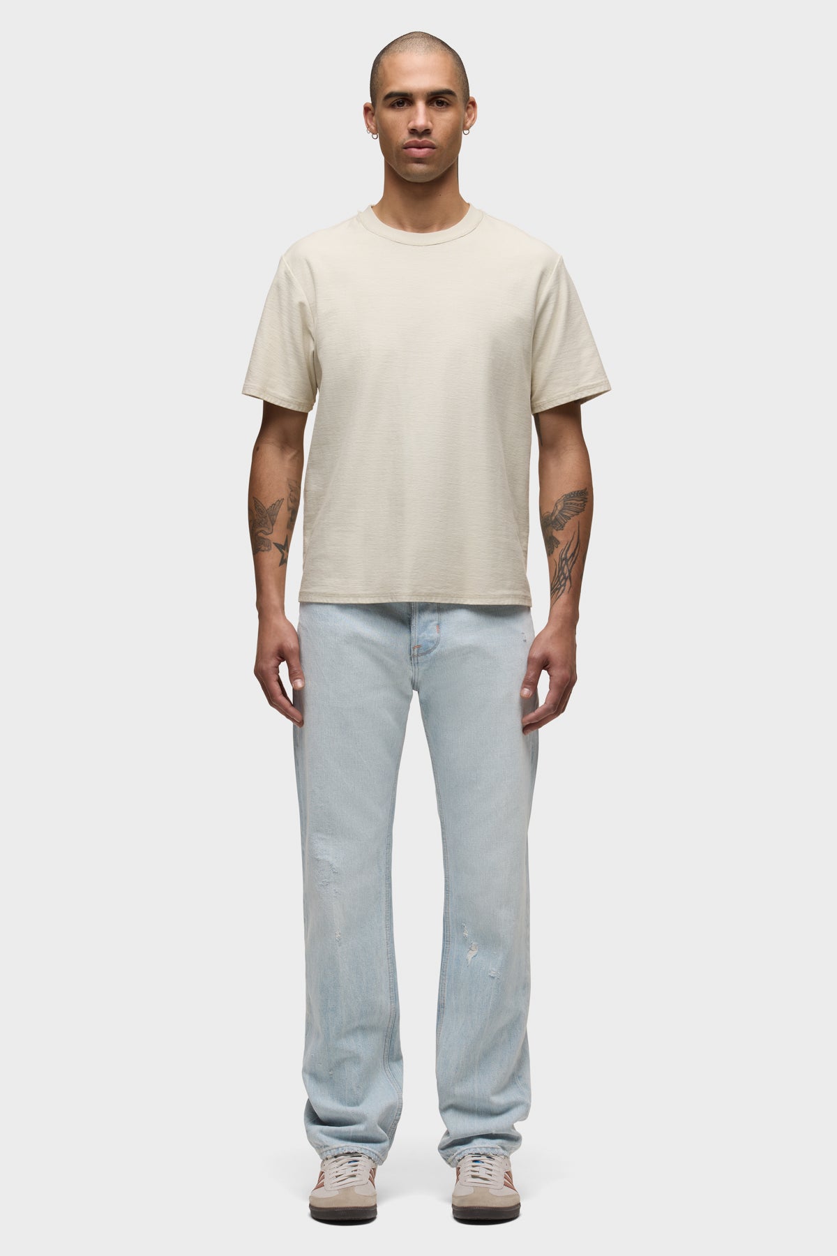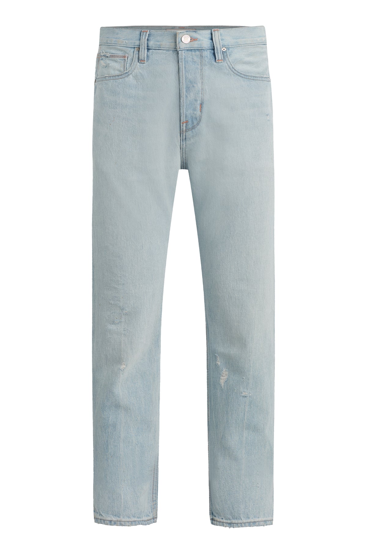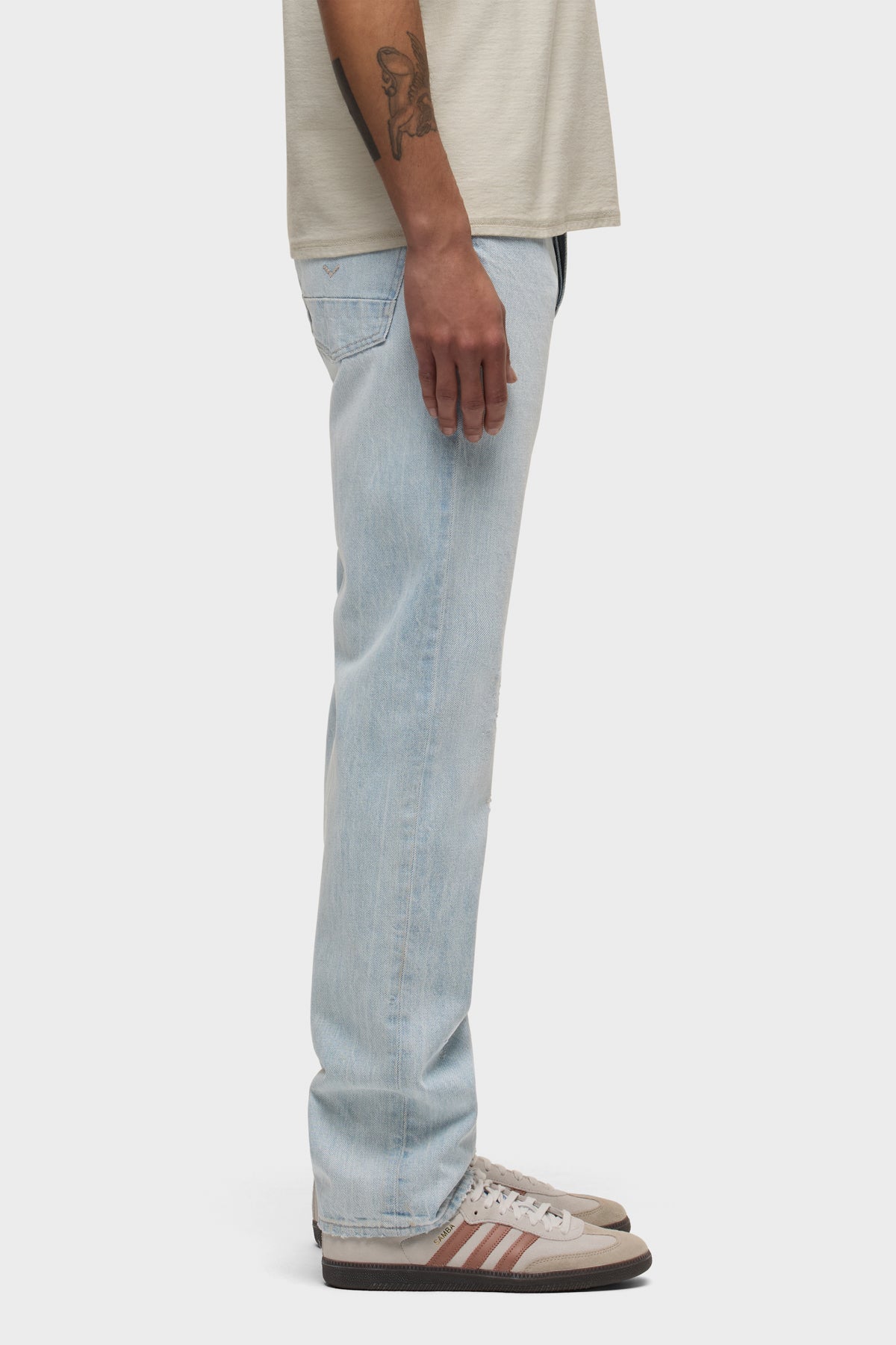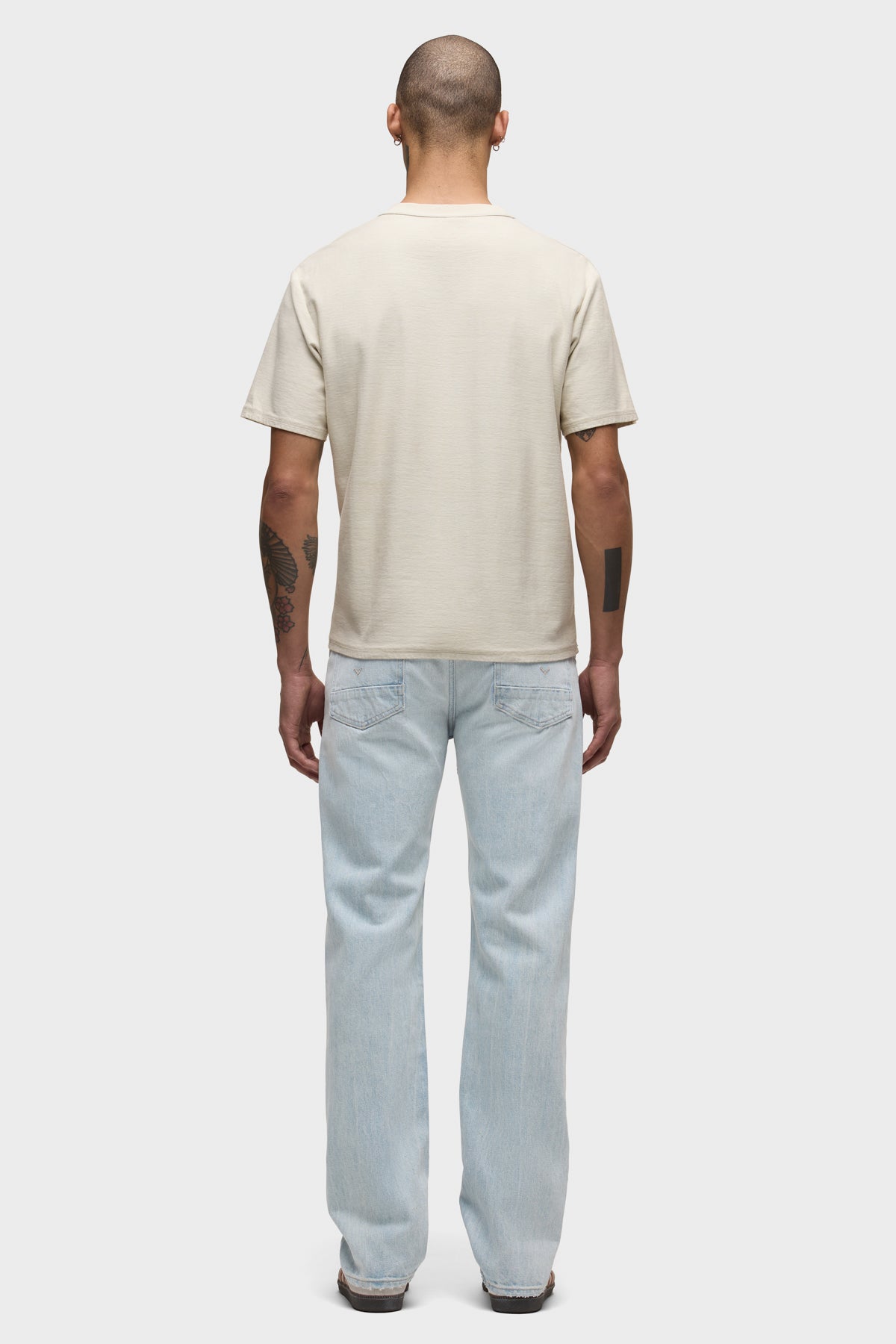 The Wes Classic Straight Leg Jean is a mid-rise, easy straight leg that fits slim through the hip. The super light indigo wash, Illusion Blue, is finished with heavy stone washing, bleaching, all-over subtle veining, whiskering, destruction and subtle pigment splatter. This pair is made of rigid denim with classic five-pocket detailing, contrast topstitching, black bright-copper hardware and a white leather back patch. -