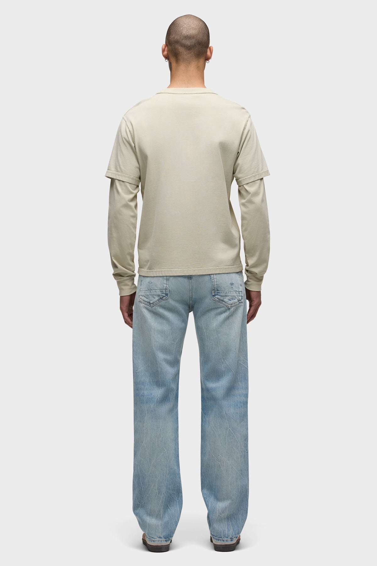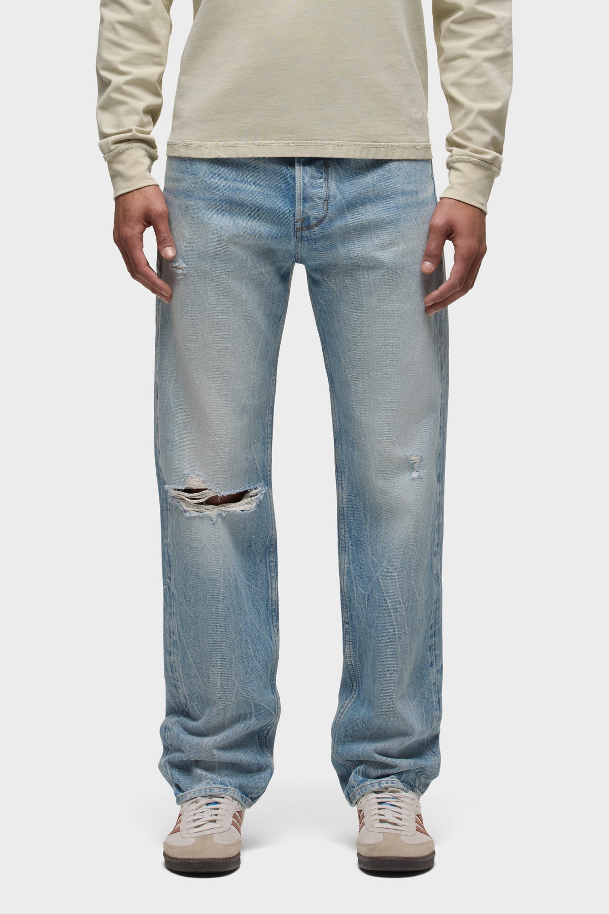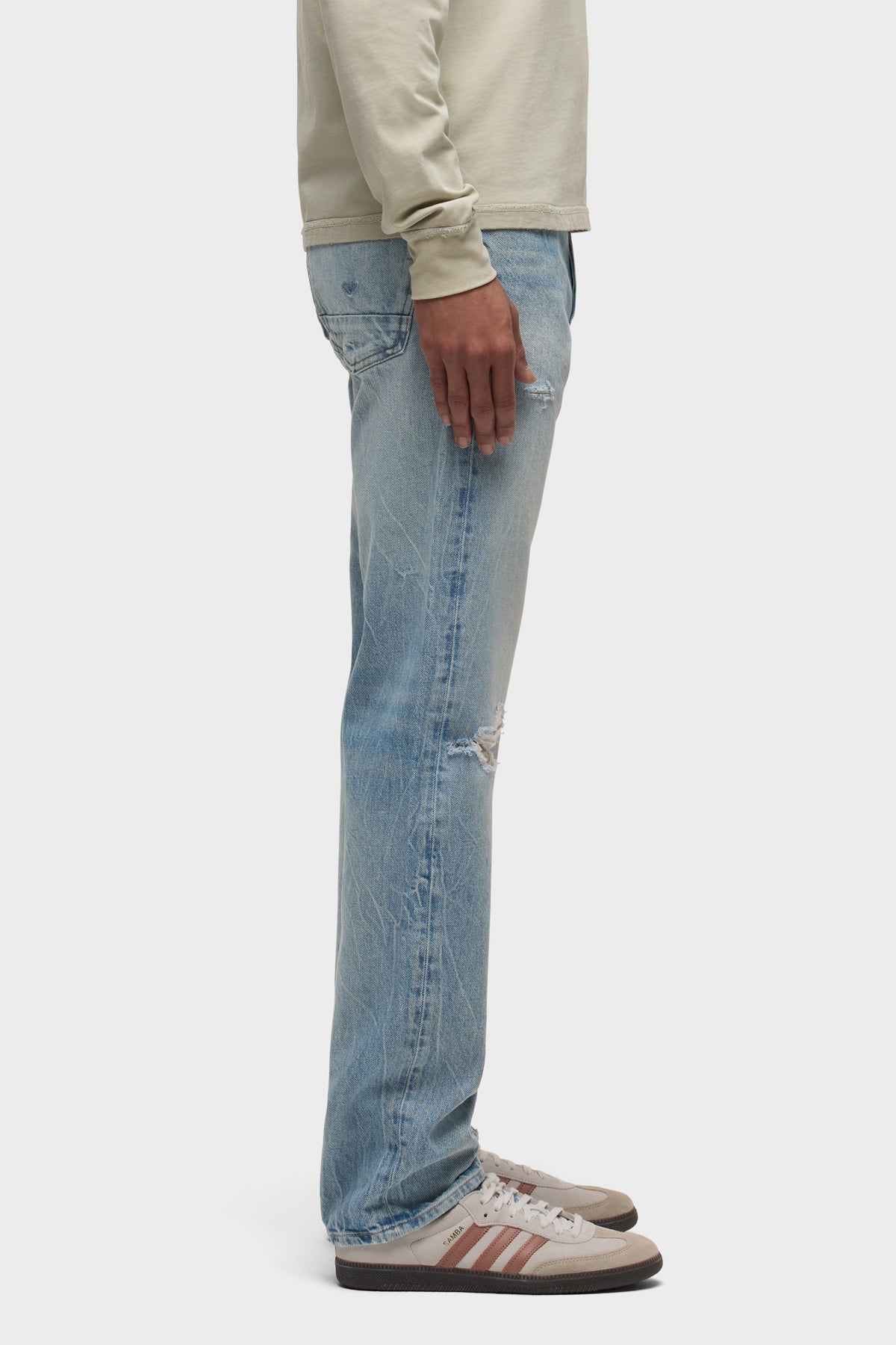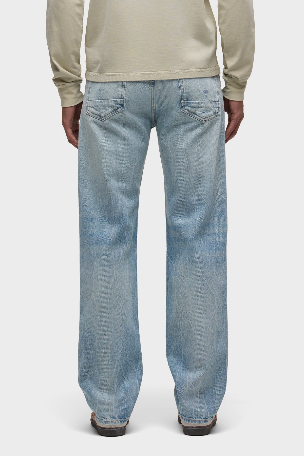 The Wes Classic Straight Leg Jean is a mid-rise, easy straight leg that fits slim through the hip. The light indigo wash, Rancho, is finished with heavy stone washing, bleaching, whiskering, all-over veining, edge grinding and knee destruction. This pair is made of rigid denim with classic five-pocket detailing, contrast topstitching, stainless steel bright-blasted hardware and a saddle leather back patch. -