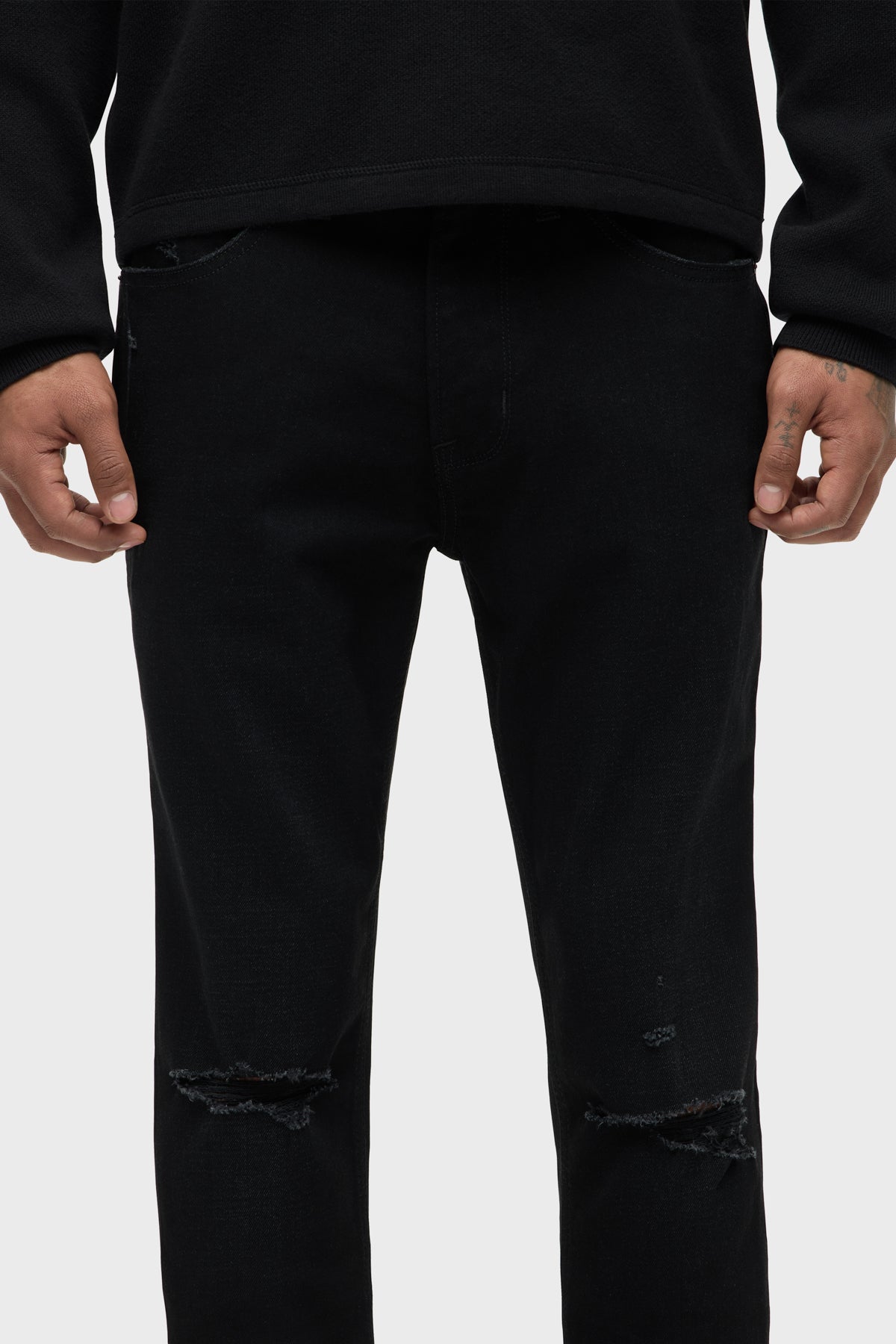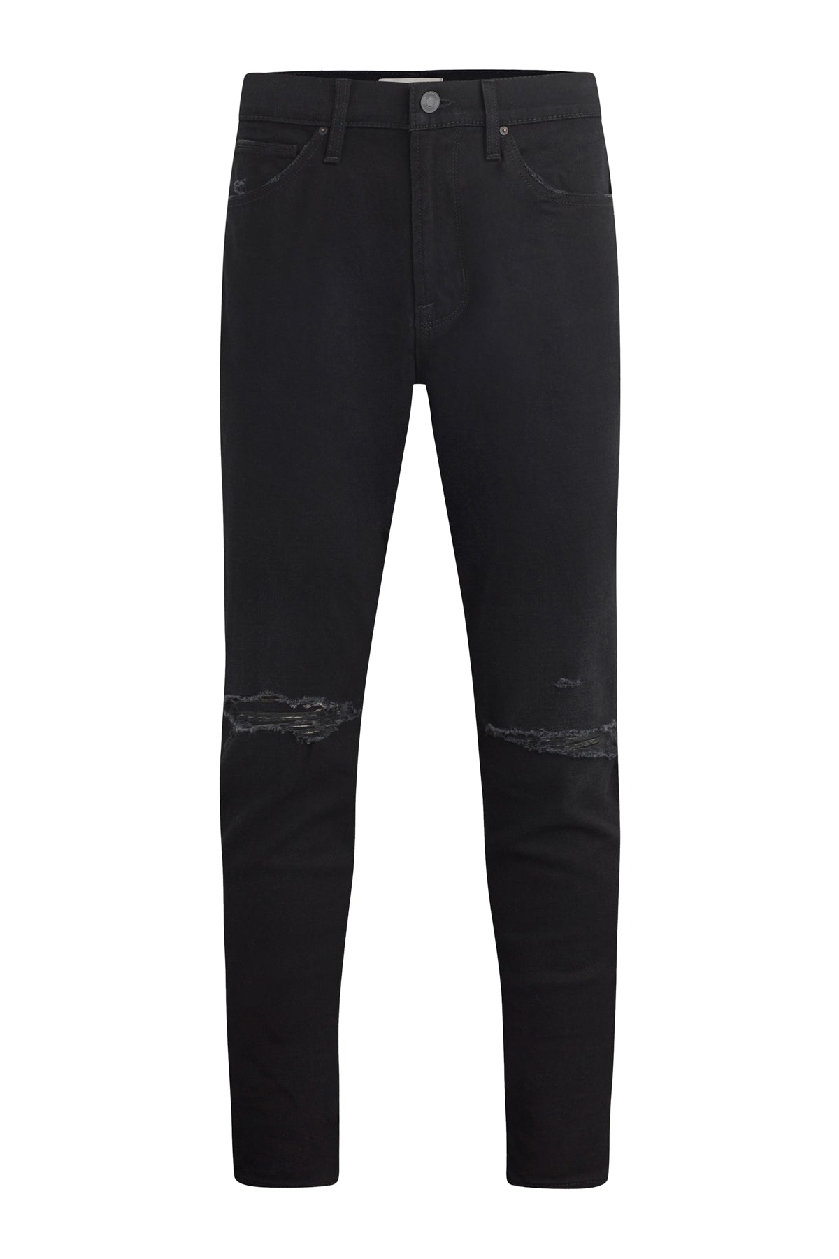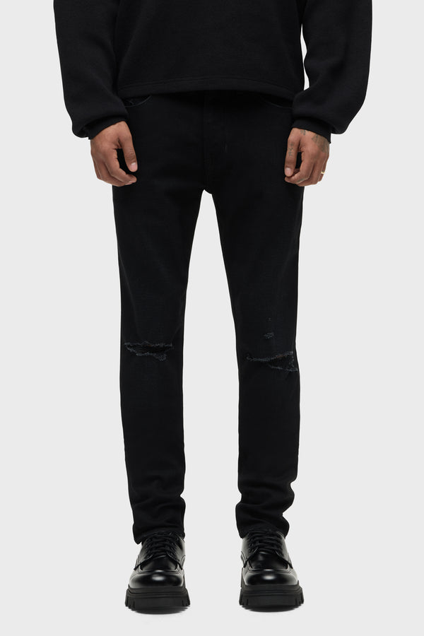 For a snug fit, look no further than our Zack Skinny Jean. Mid-rise, slim through the hip and thigh with a narrow leg and 34” inseam. Designed in a black comfort stretch denim. Destructed Ink has subtle wear patterns, knee destruction and grinding along the edges. Finished with matte black hardware and black leather back patch. -