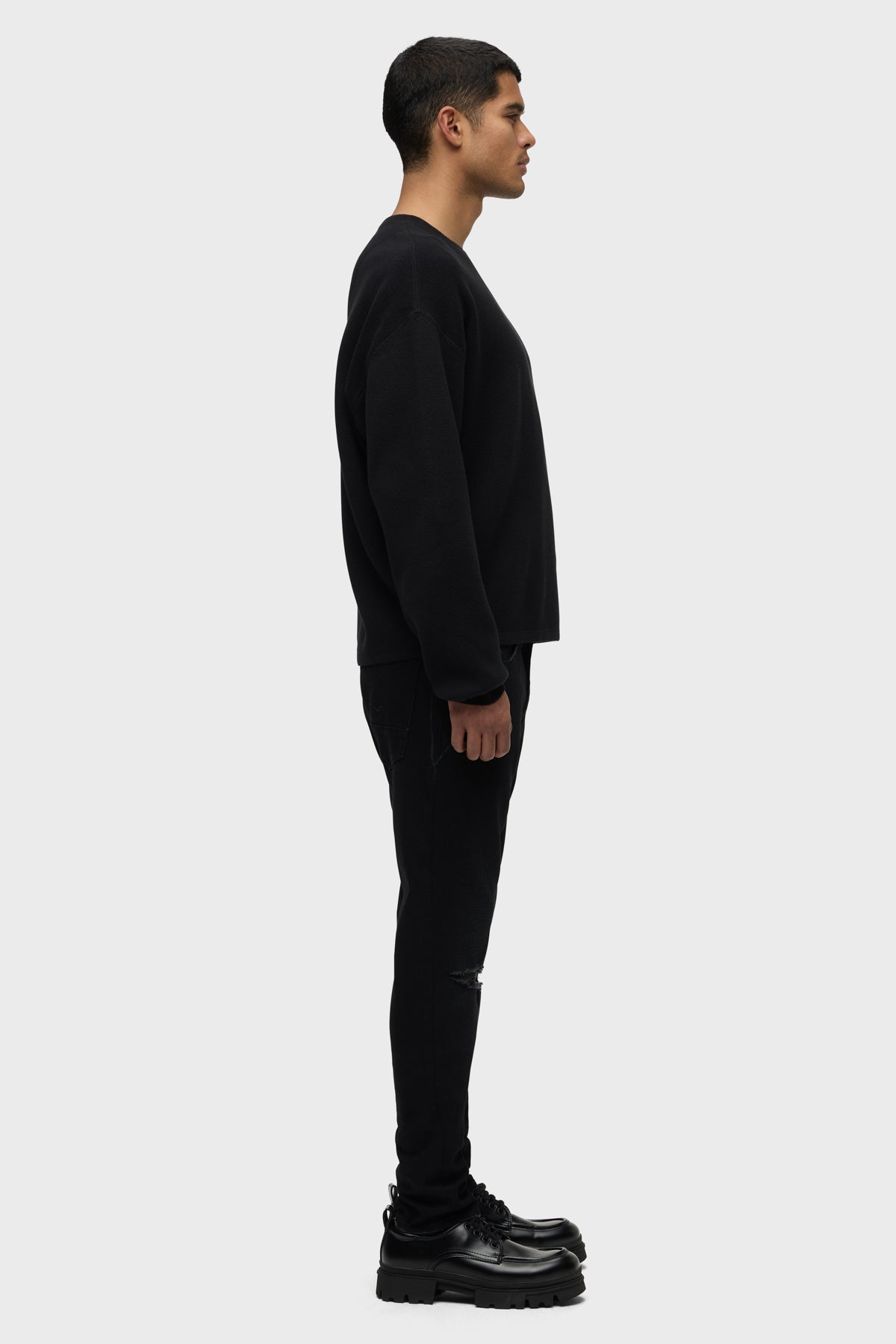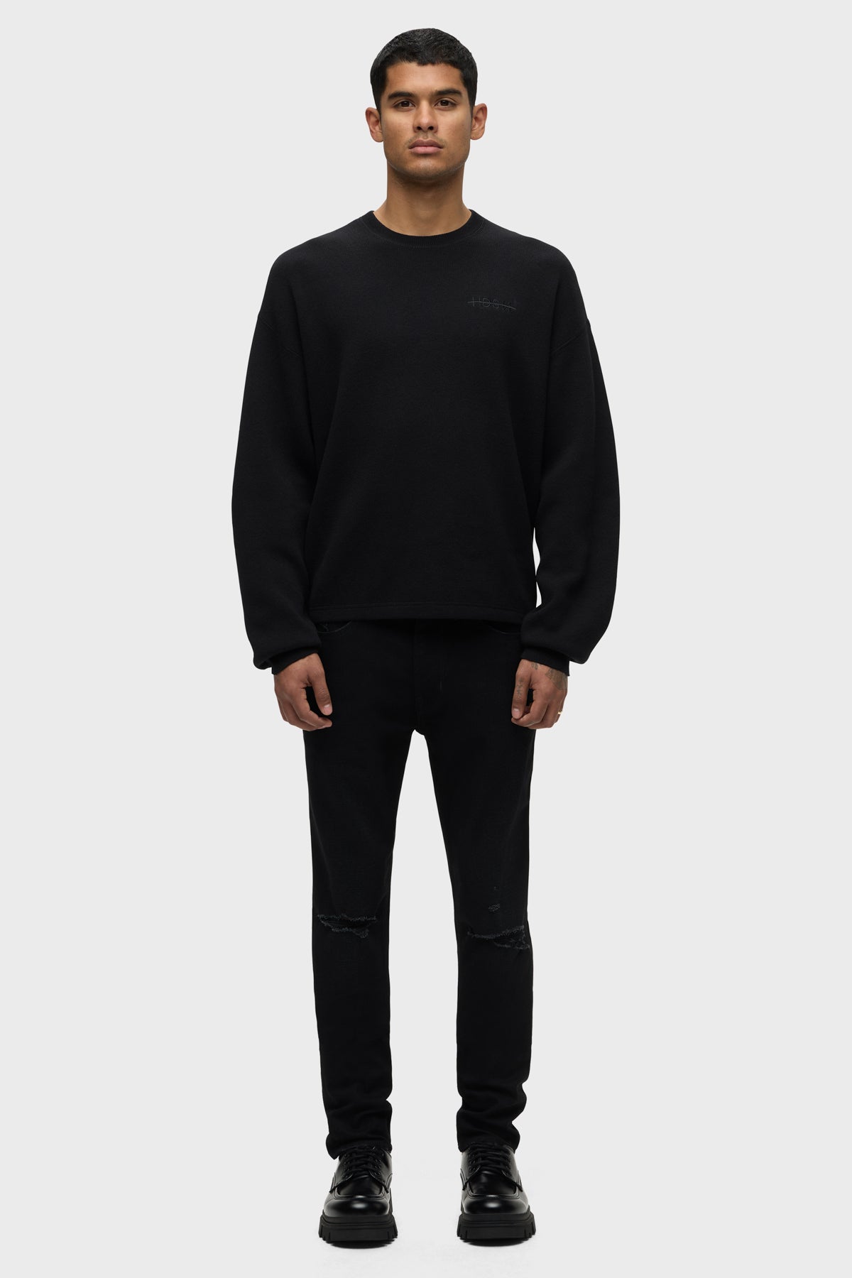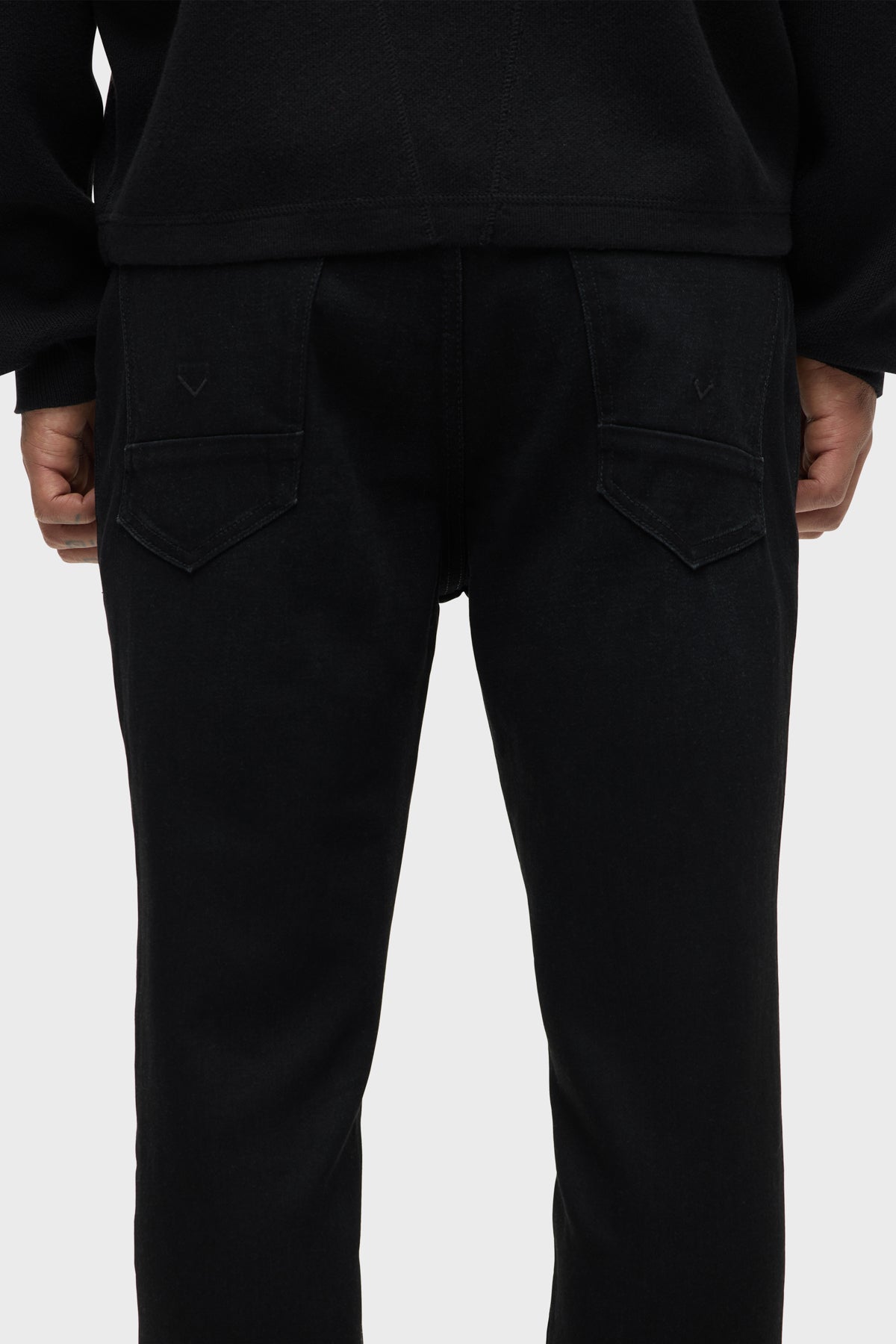 For a snug fit, look no further than our Zack Skinny Jean. Mid-rise, slim through the hip and thigh with a narrow leg and 34” inseam. Designed in a black comfort stretch denim. Destructed Ink has subtle wear patterns, knee destruction and grinding along the edges. Finished with matte black hardware and black leather back patch. -