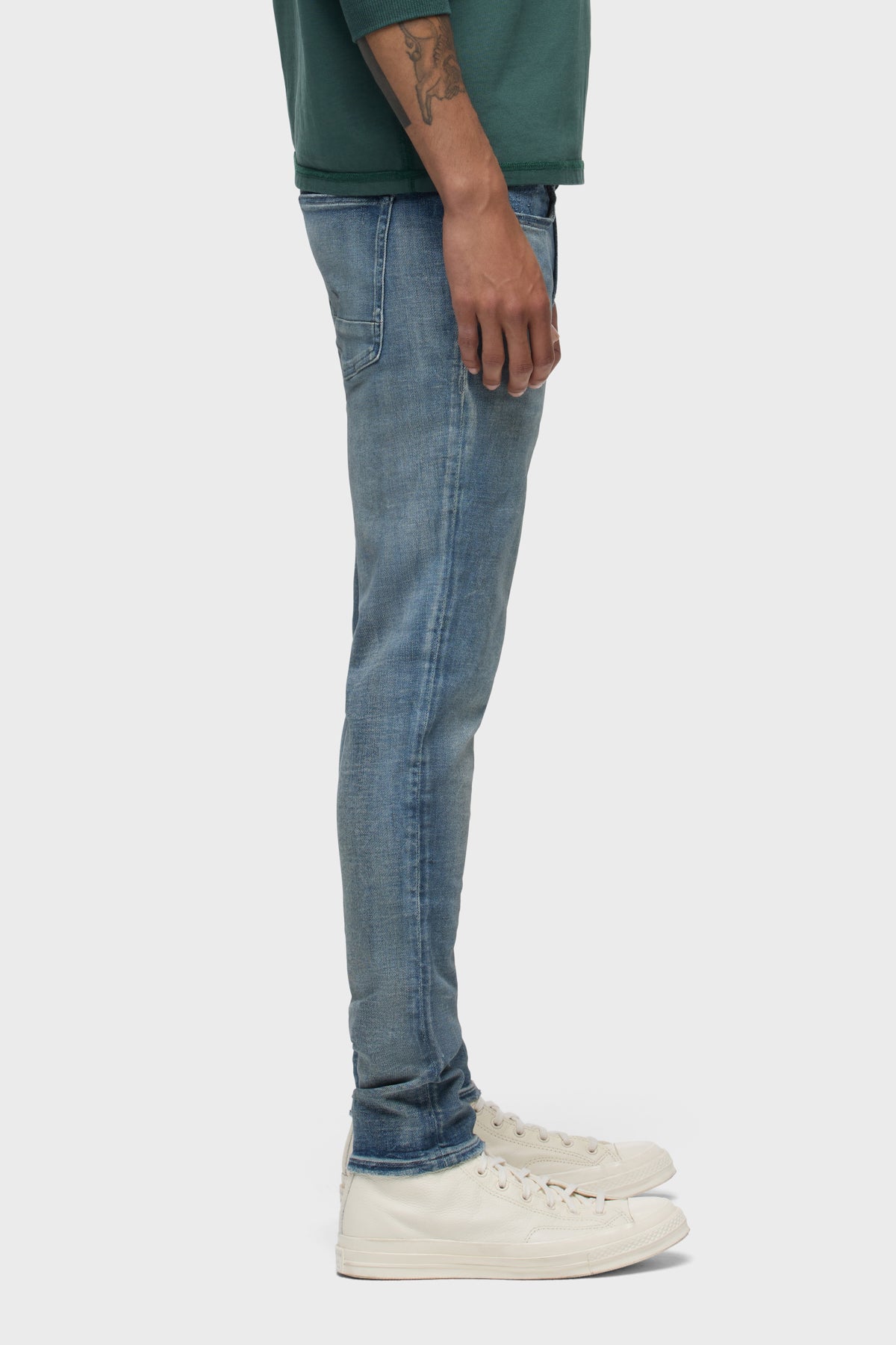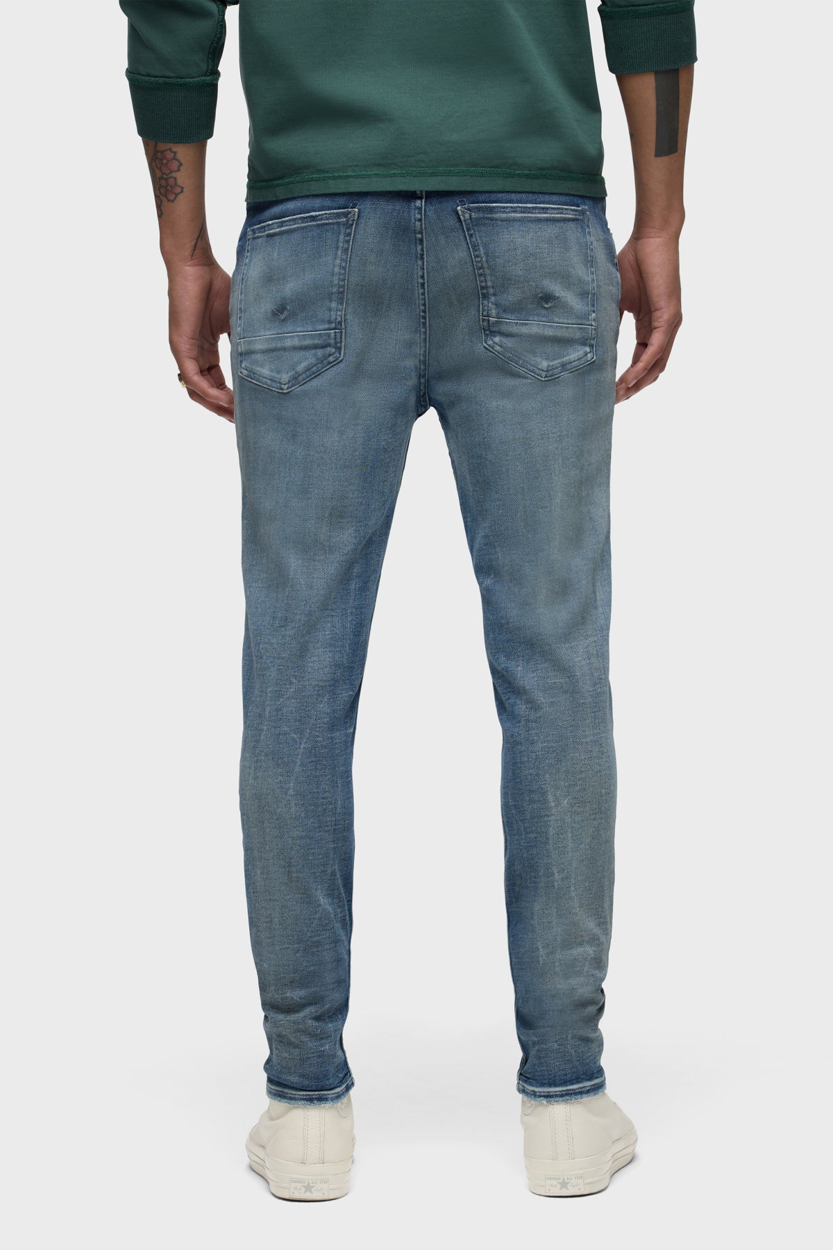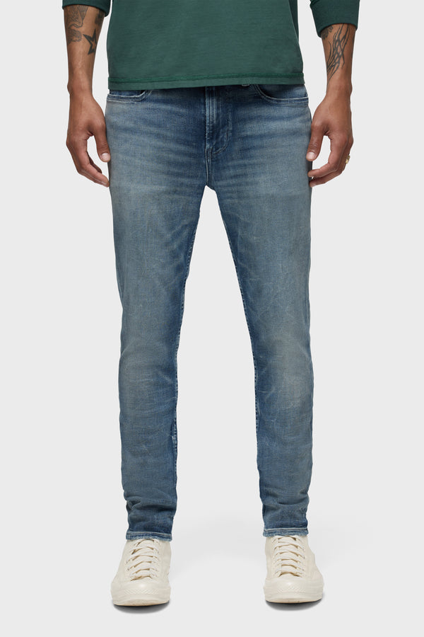 For a snug fit, look no further than our Zack Skinny Jean. Mid-rise, slim through the hip and thigh with a narrow leg and 34” inseam. Done in a medium-dark indigo Dark Shadow wash with whiskering and edge grinding. Dull nickel hardware, tonal topstitching and a black leather back patch finish the look. -