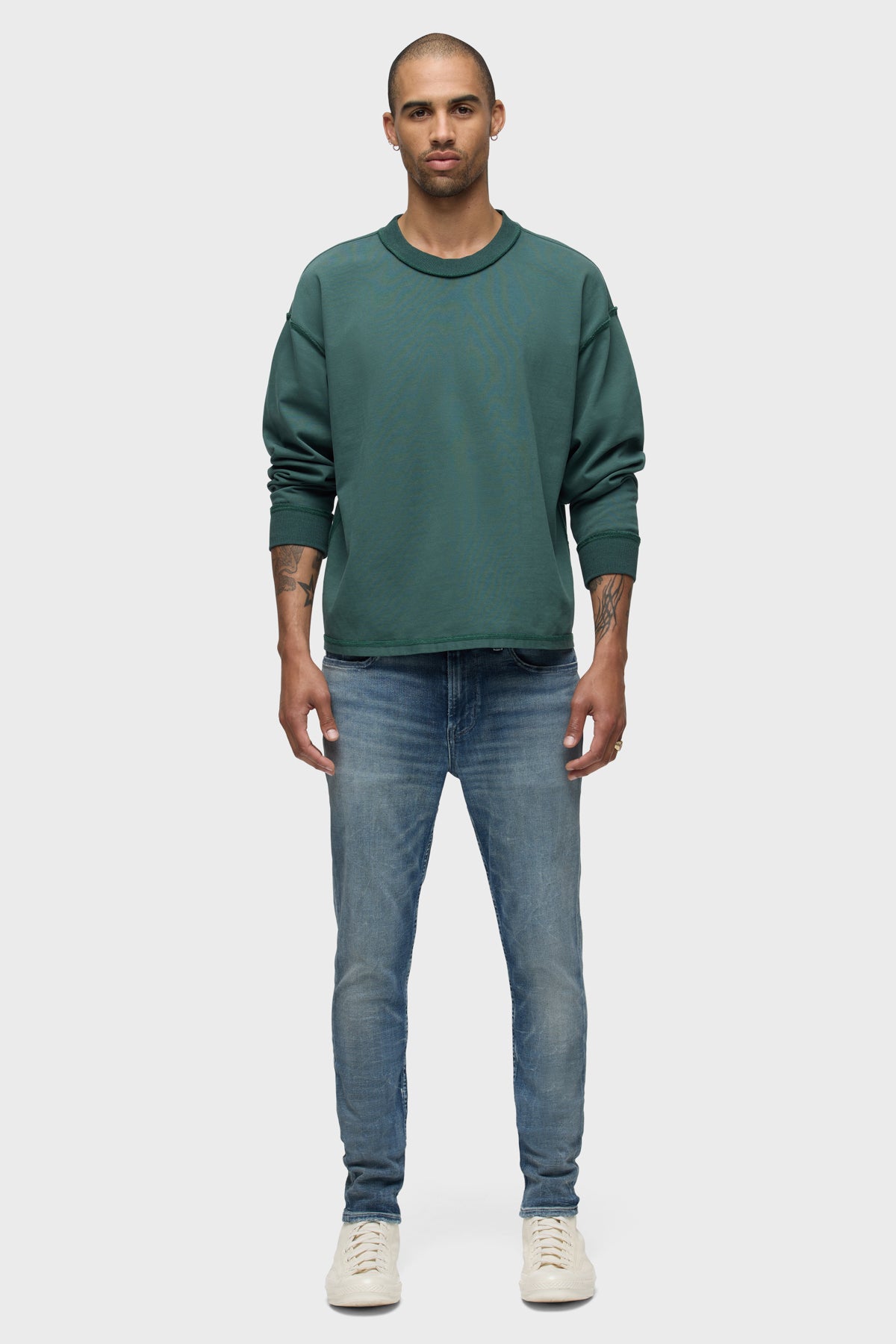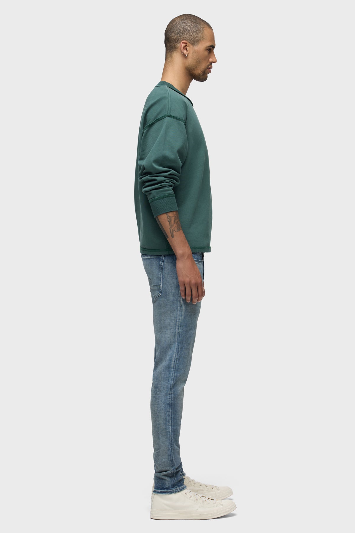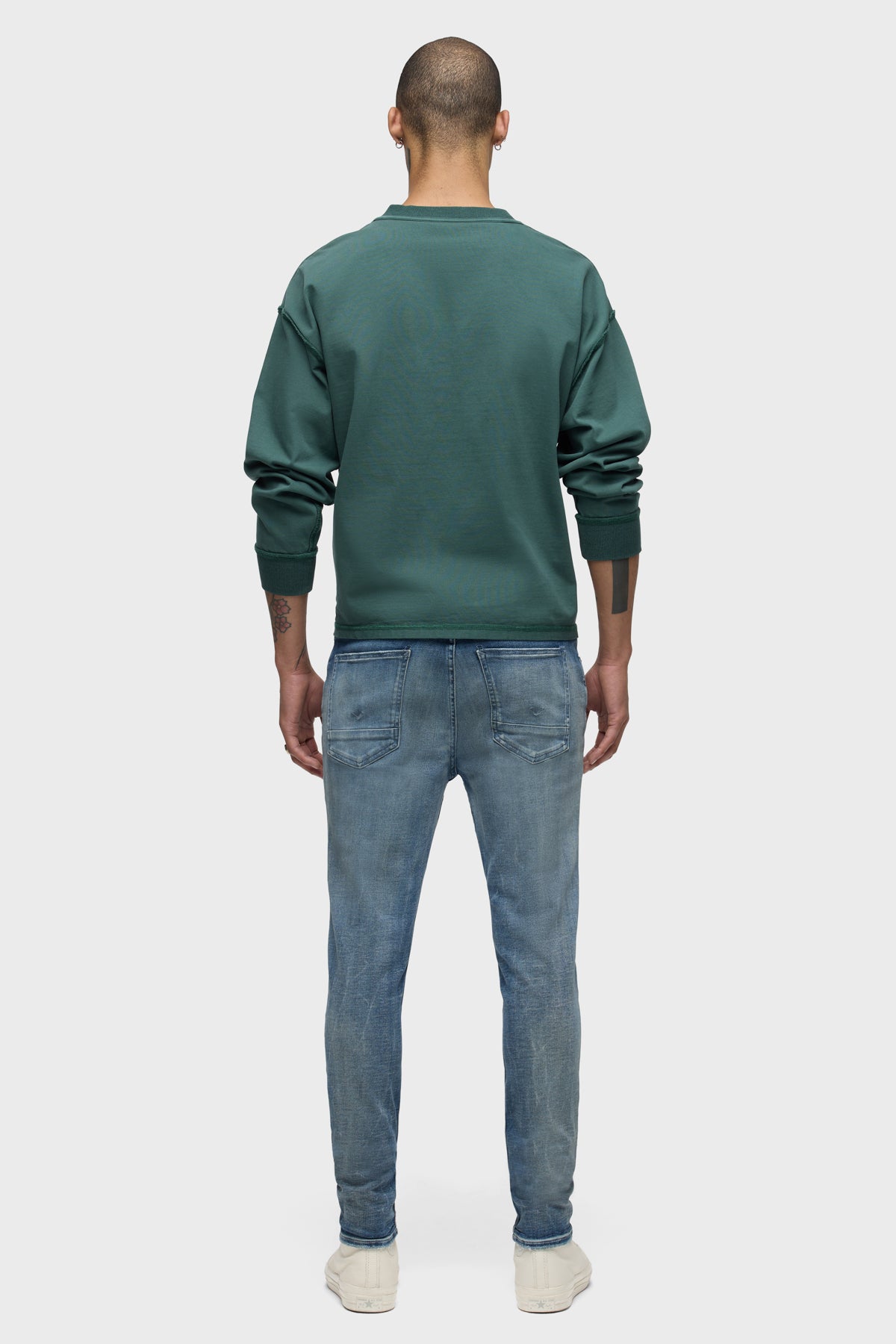 For a snug fit, look no further than our Zack Skinny Jean. Mid-rise, slim through the hip and thigh with a narrow leg and 34” inseam. Done in a medium-dark indigo Dark Shadow wash with whiskering and edge grinding. Dull nickel hardware, tonal topstitching and a black leather back patch finish the look. -