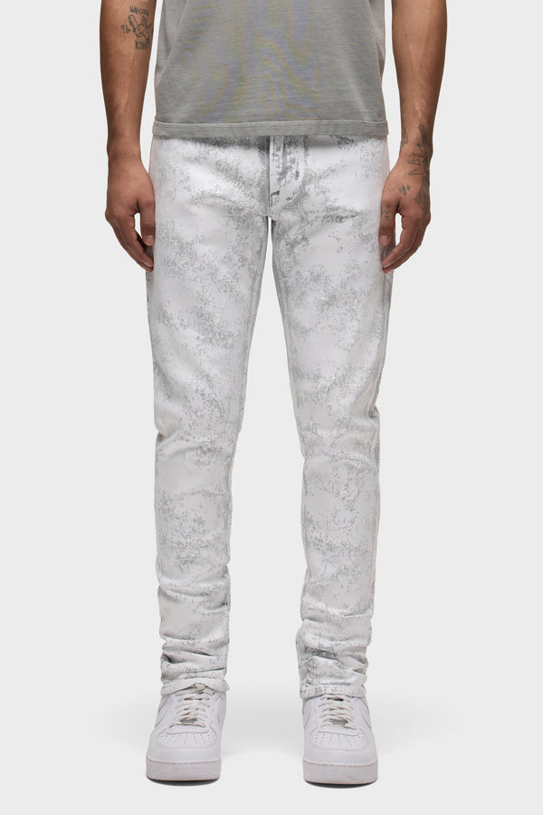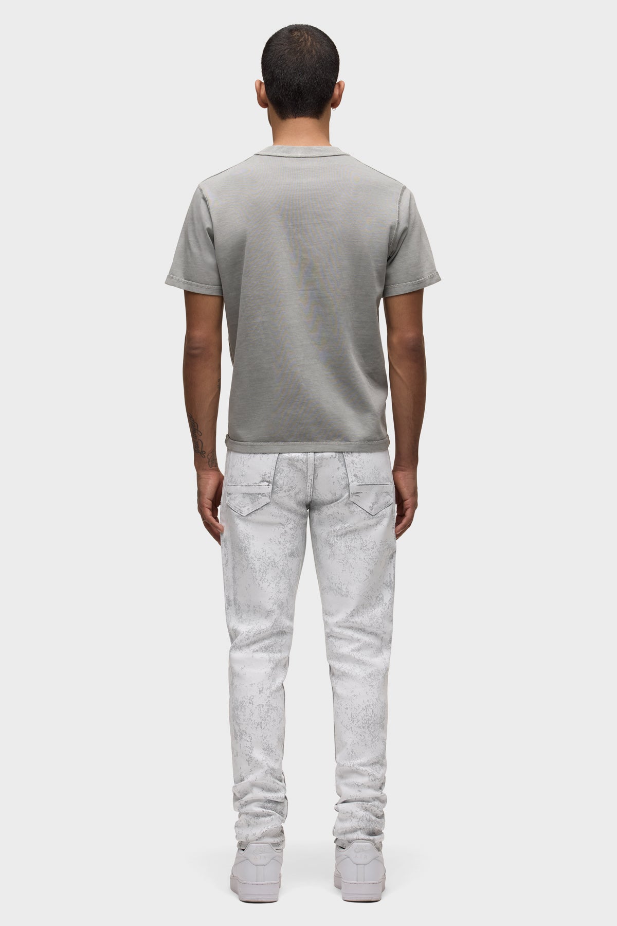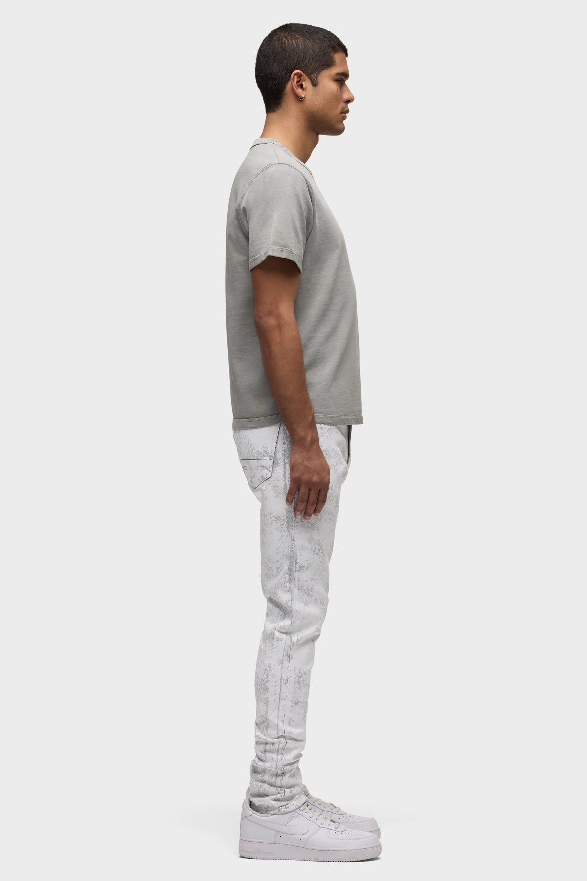 For a snug fit, look no further than our Zack Skinny Pant. Mid-rise, slim through the hip and thigh with a narrow leg and 34” inseam. This pair is made of stretch twill in a spotty white wash, White Shatter. Matte grey hardware and a signature grey leather patch on the back waistband finish the look. -