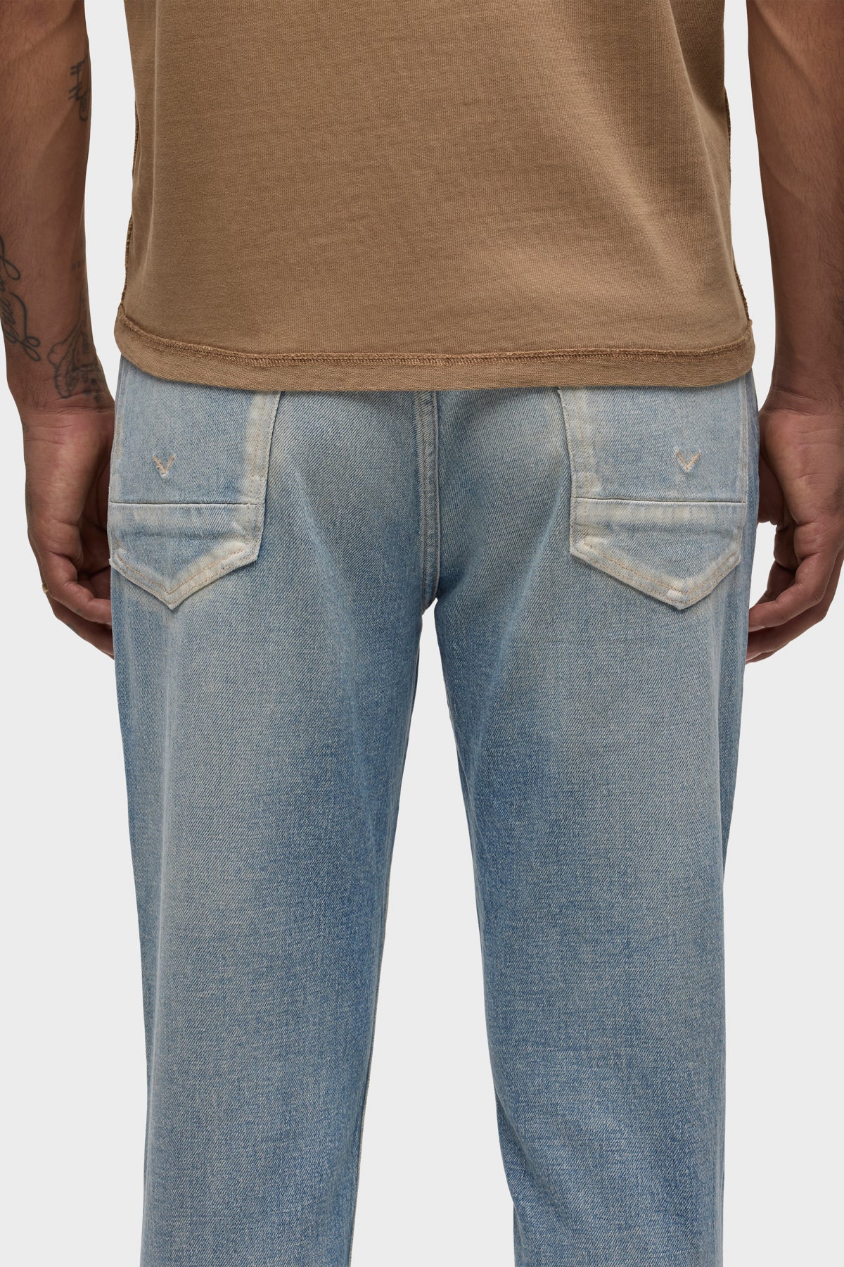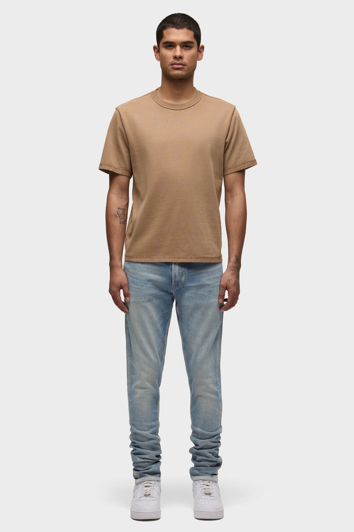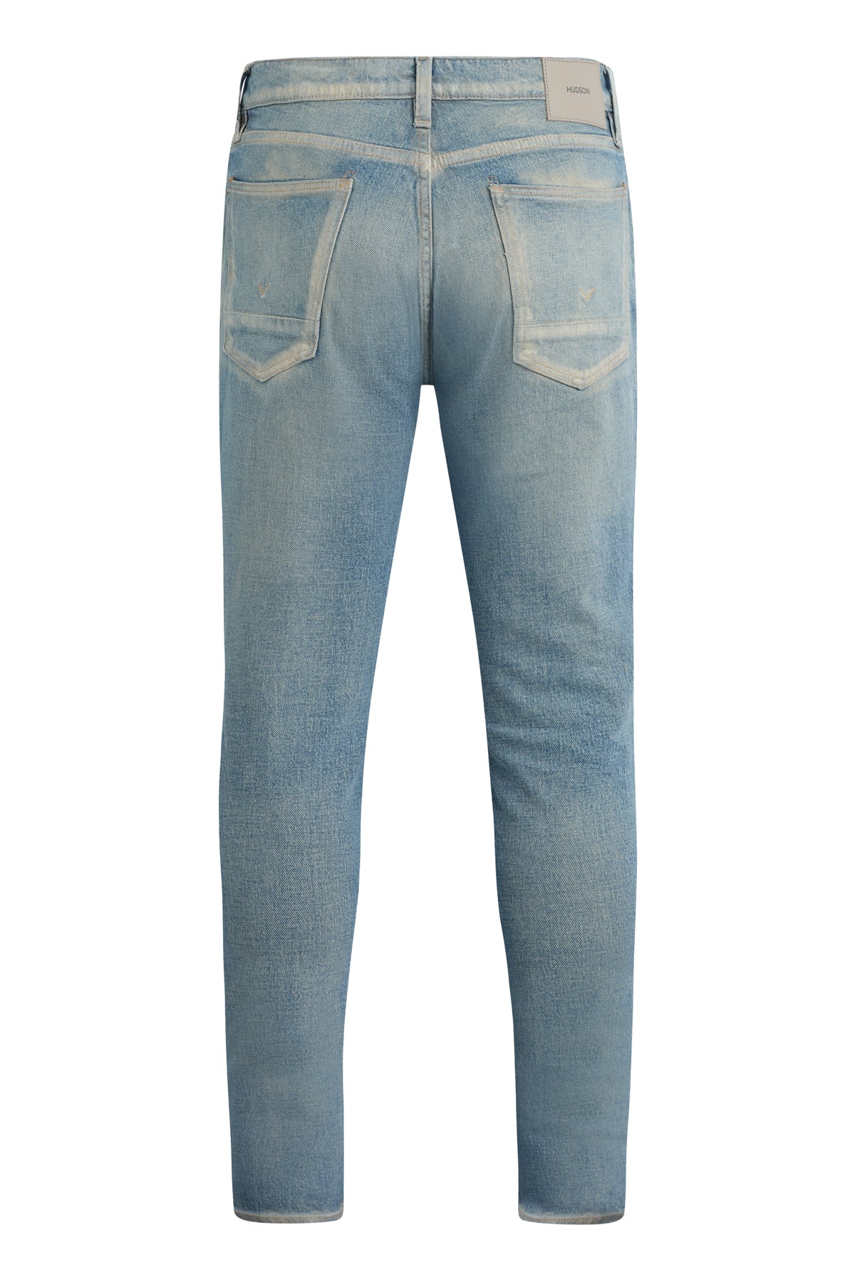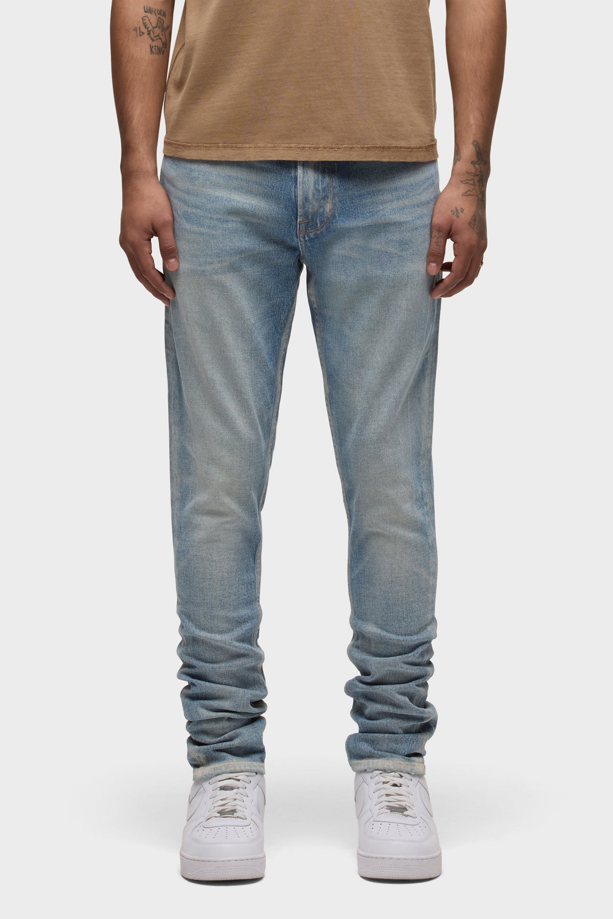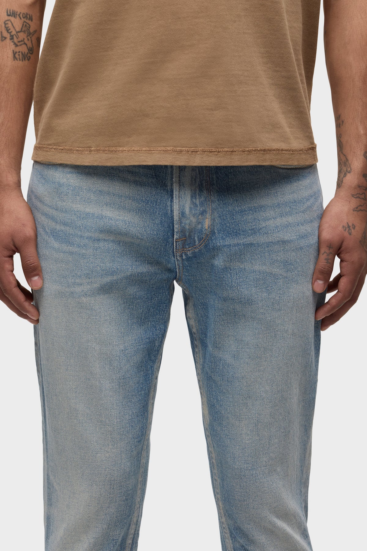 For a snug fit, look no further than our Zack Skinny Jean. Mid-rise, slim through the hip and thigh with a narrow leg and 34” inseam. This pair is made of comfort stretch denim in Vintage Mist, a medium indigo wash with all-over, uneven light brown stains and light brown pigment on the seams. -